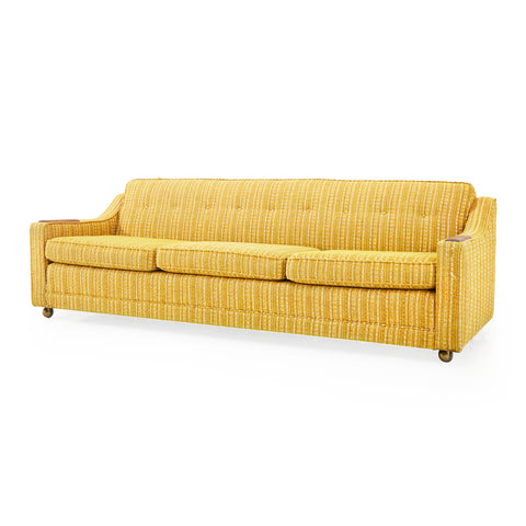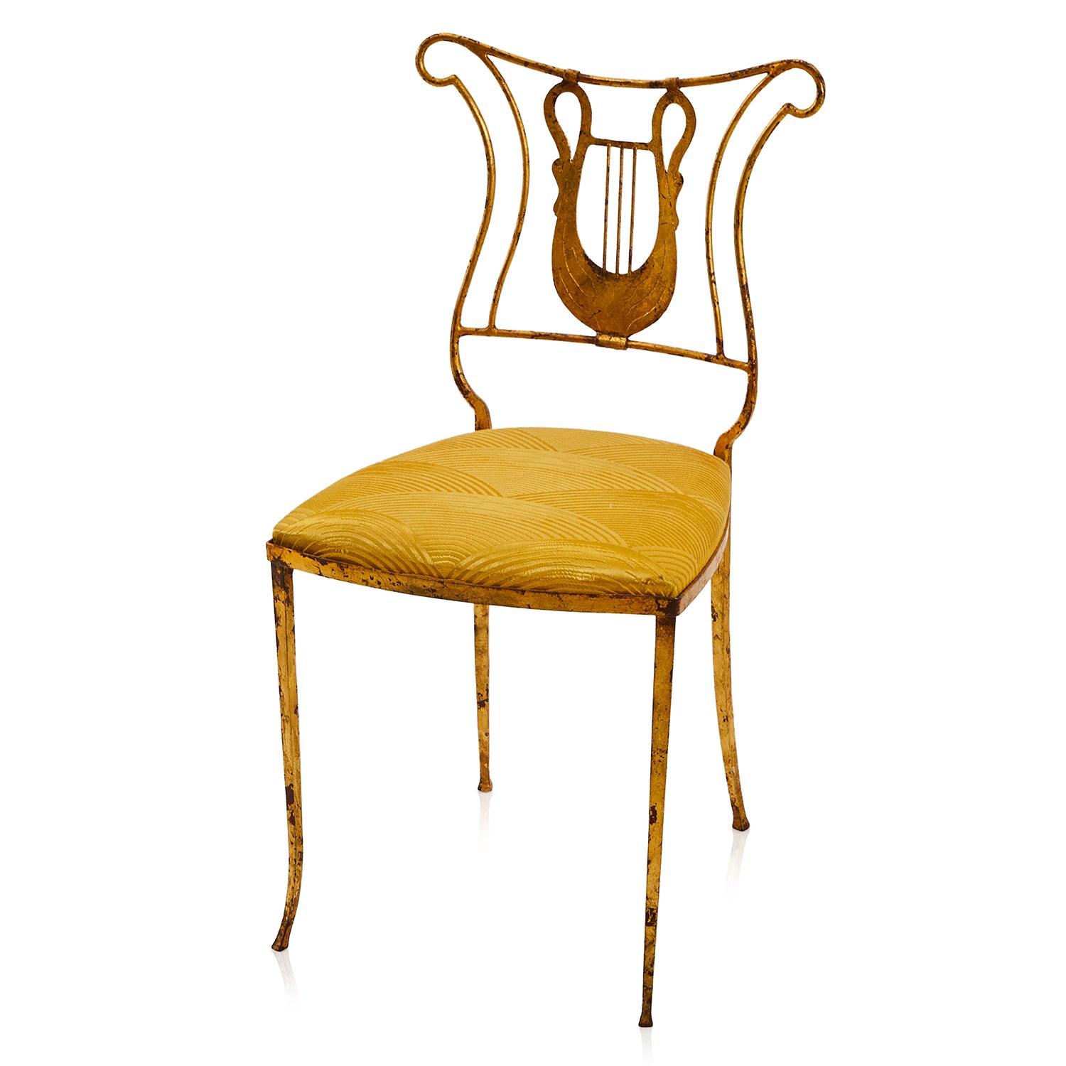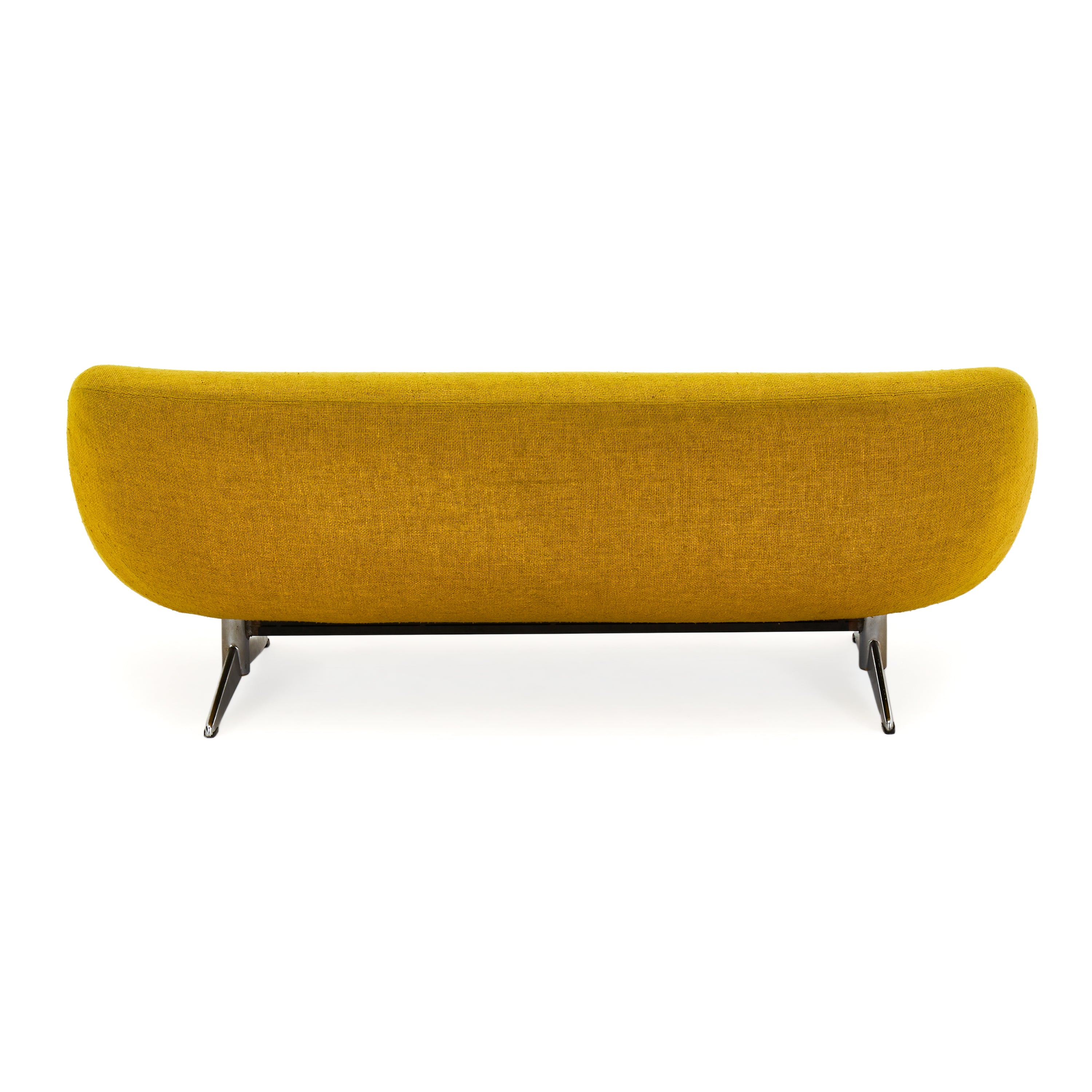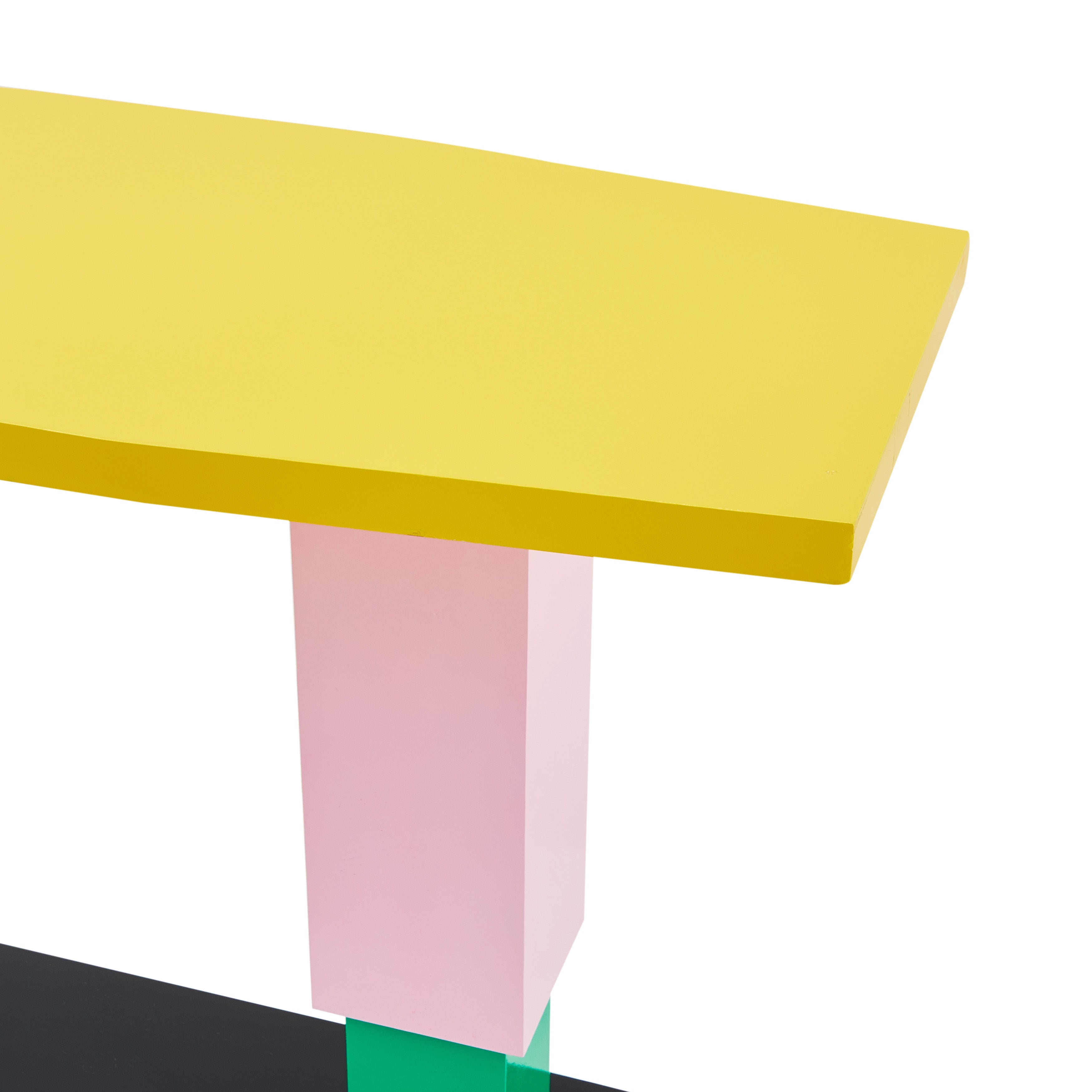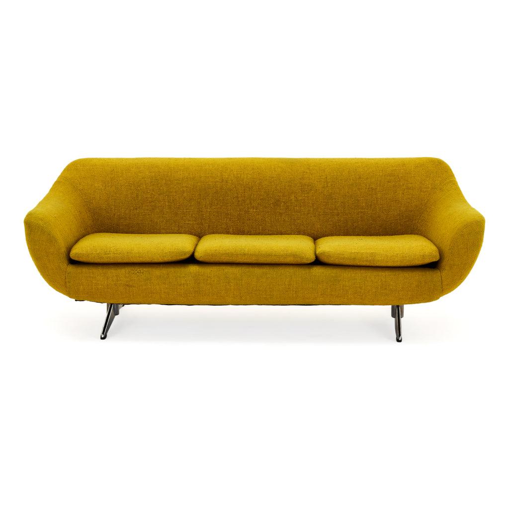 Details: Yellow daybed with a Dali-esque free-flowing organic form, supported by metal rods on a wood cross base