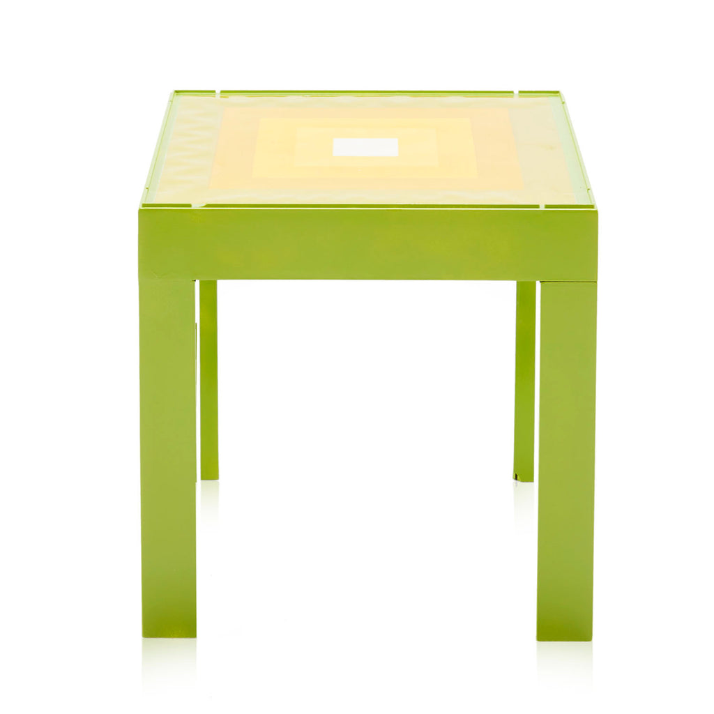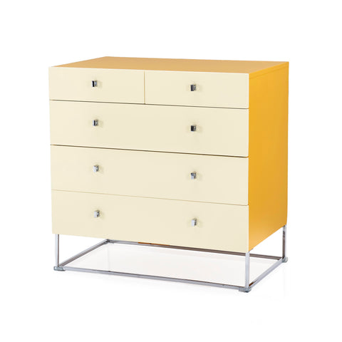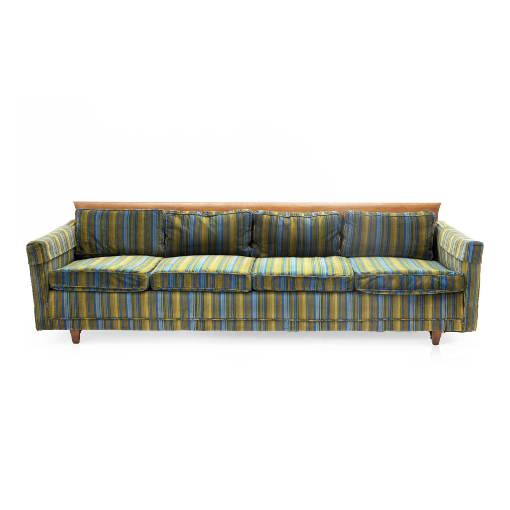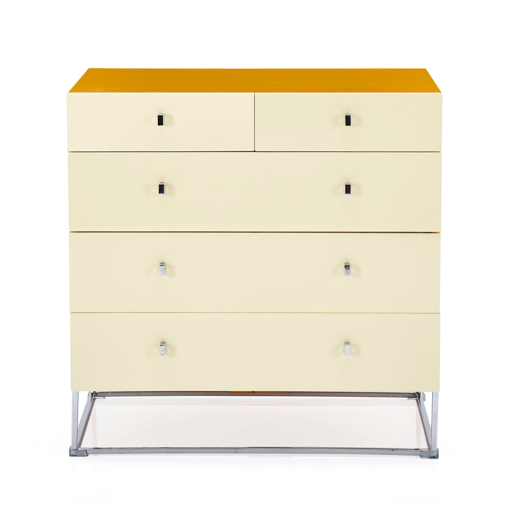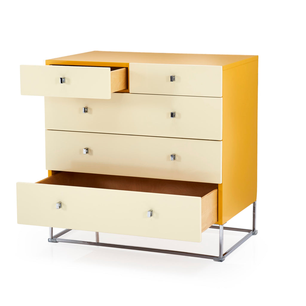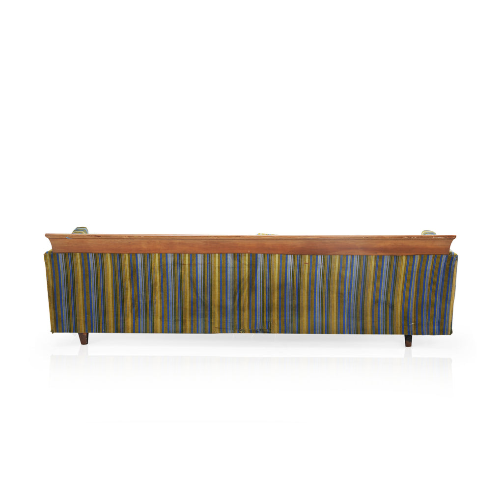 Details: Yellow daybed with a Dali-esque free-flowing organic form, supported by metal rods on a wood cross base