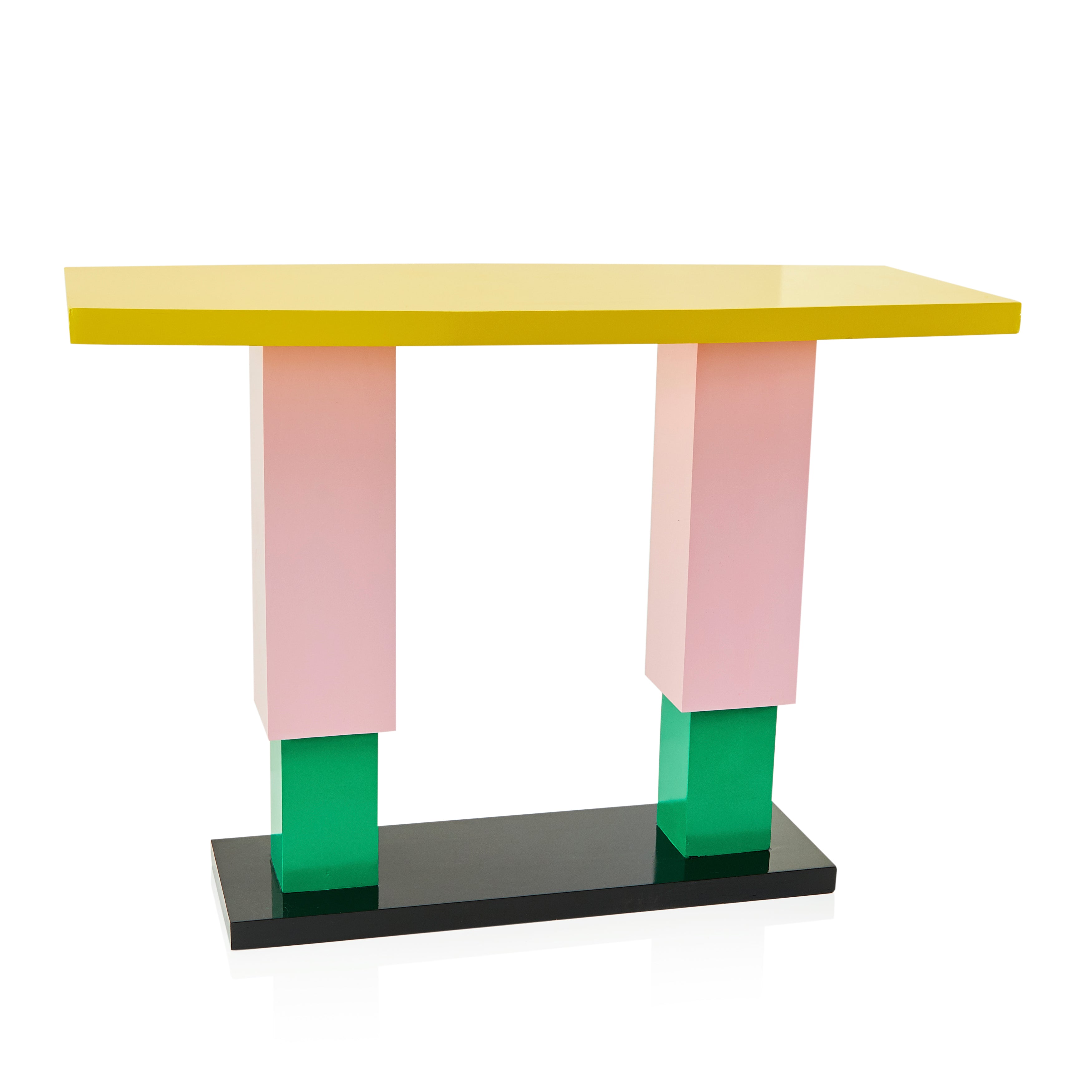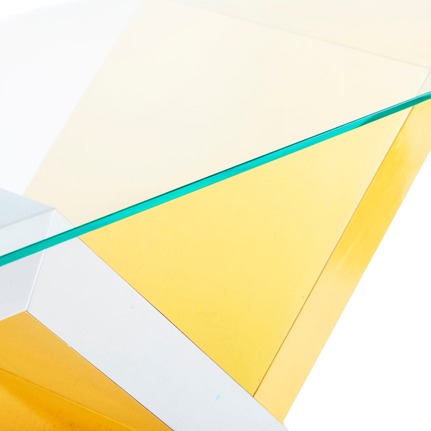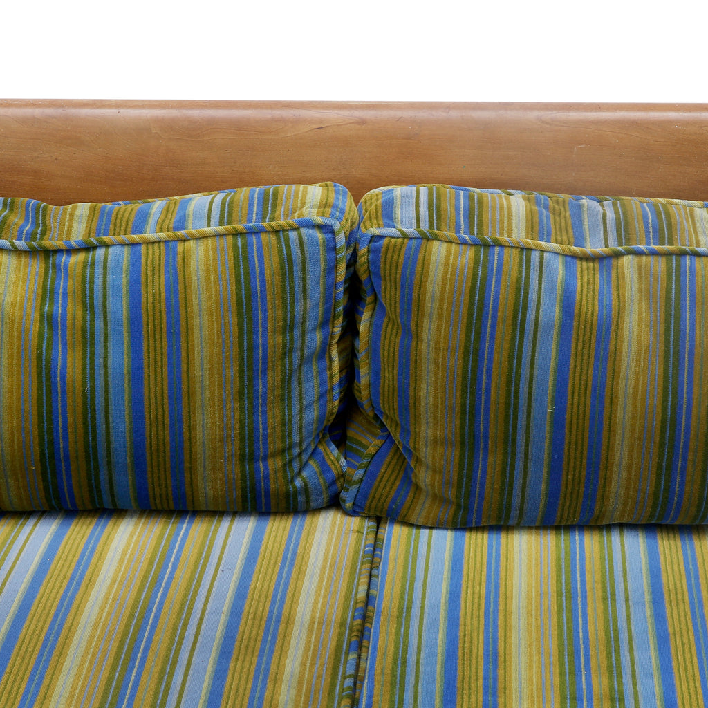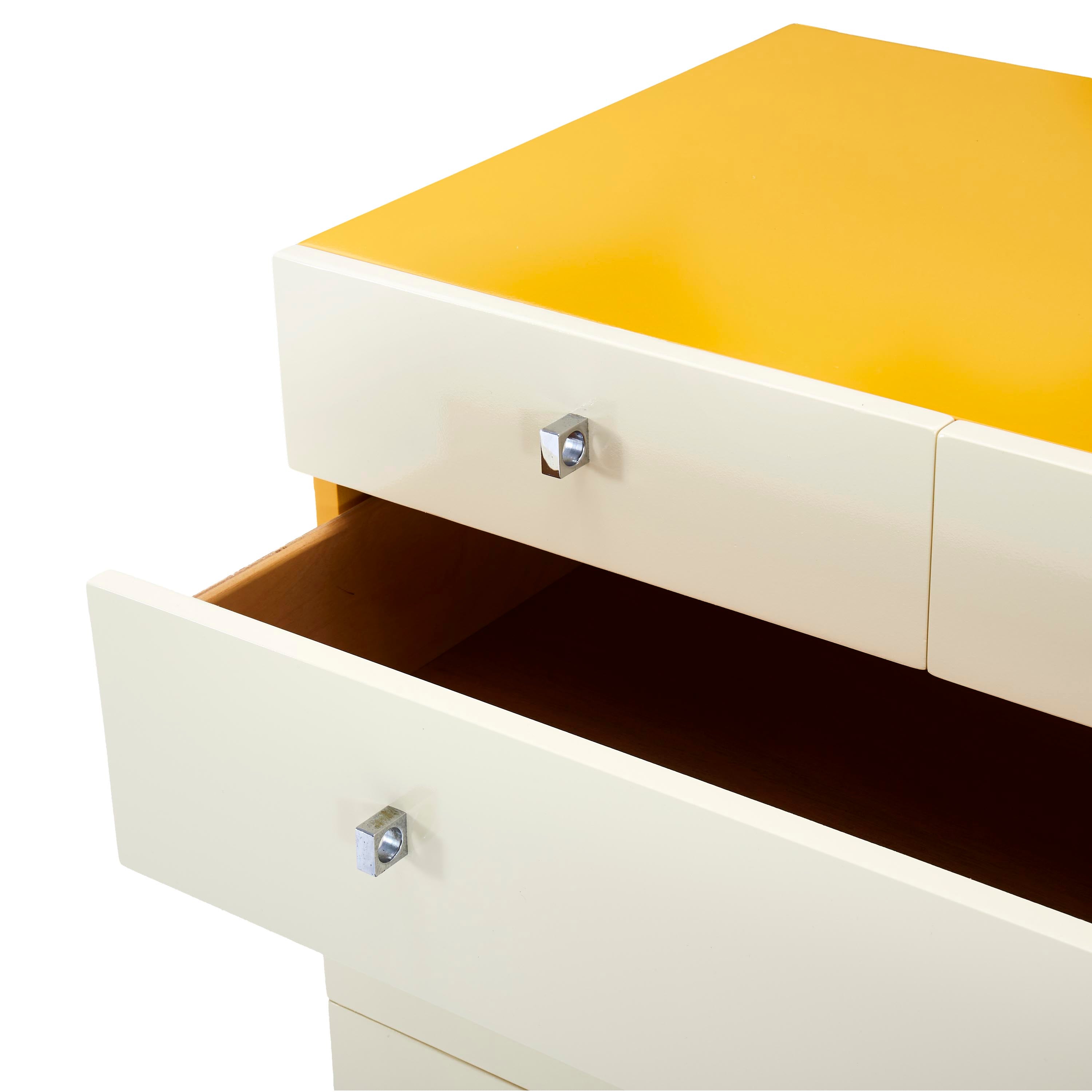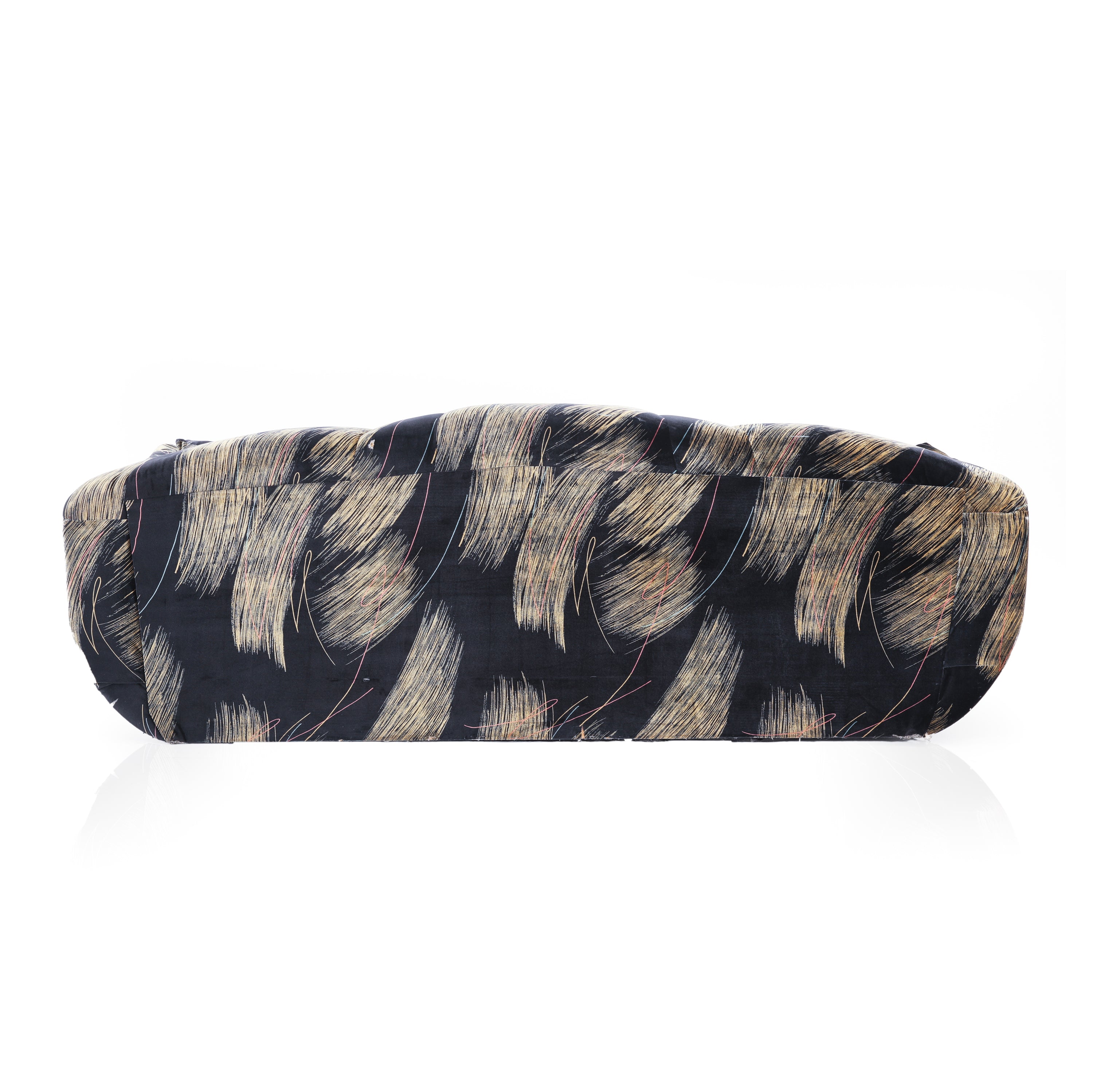 Details: Yellow daybed with a Dali-esque free-flowing organic form, supported by metal rods on a wood cross base
