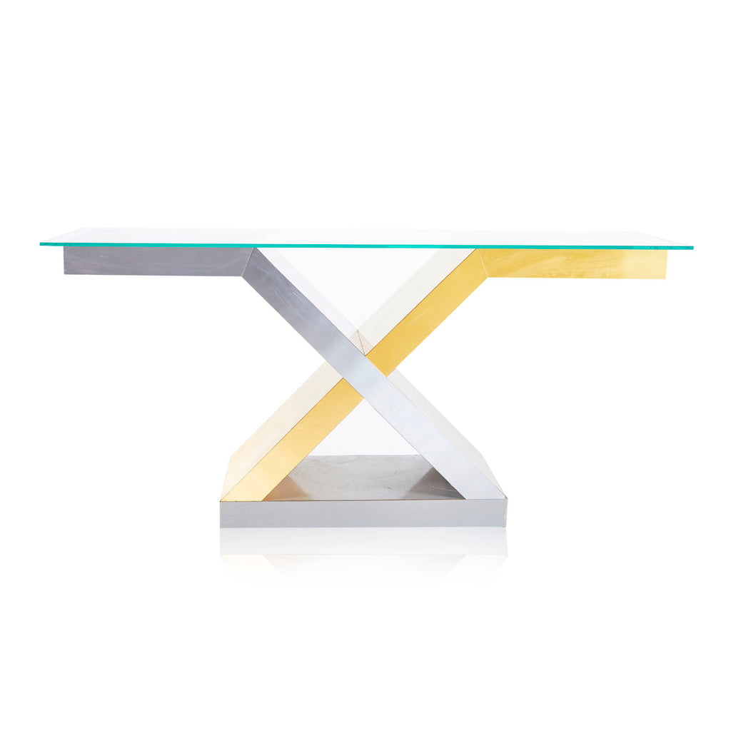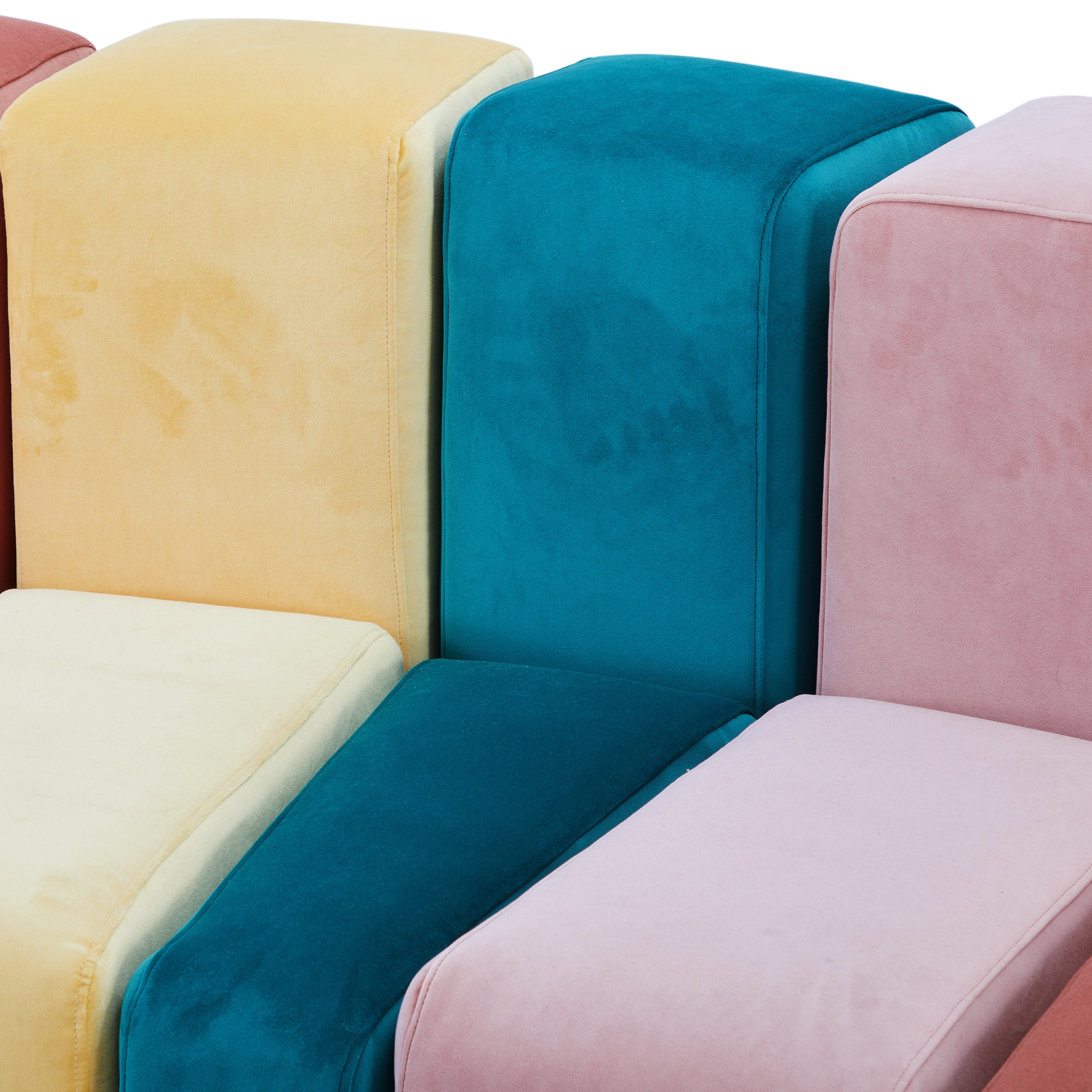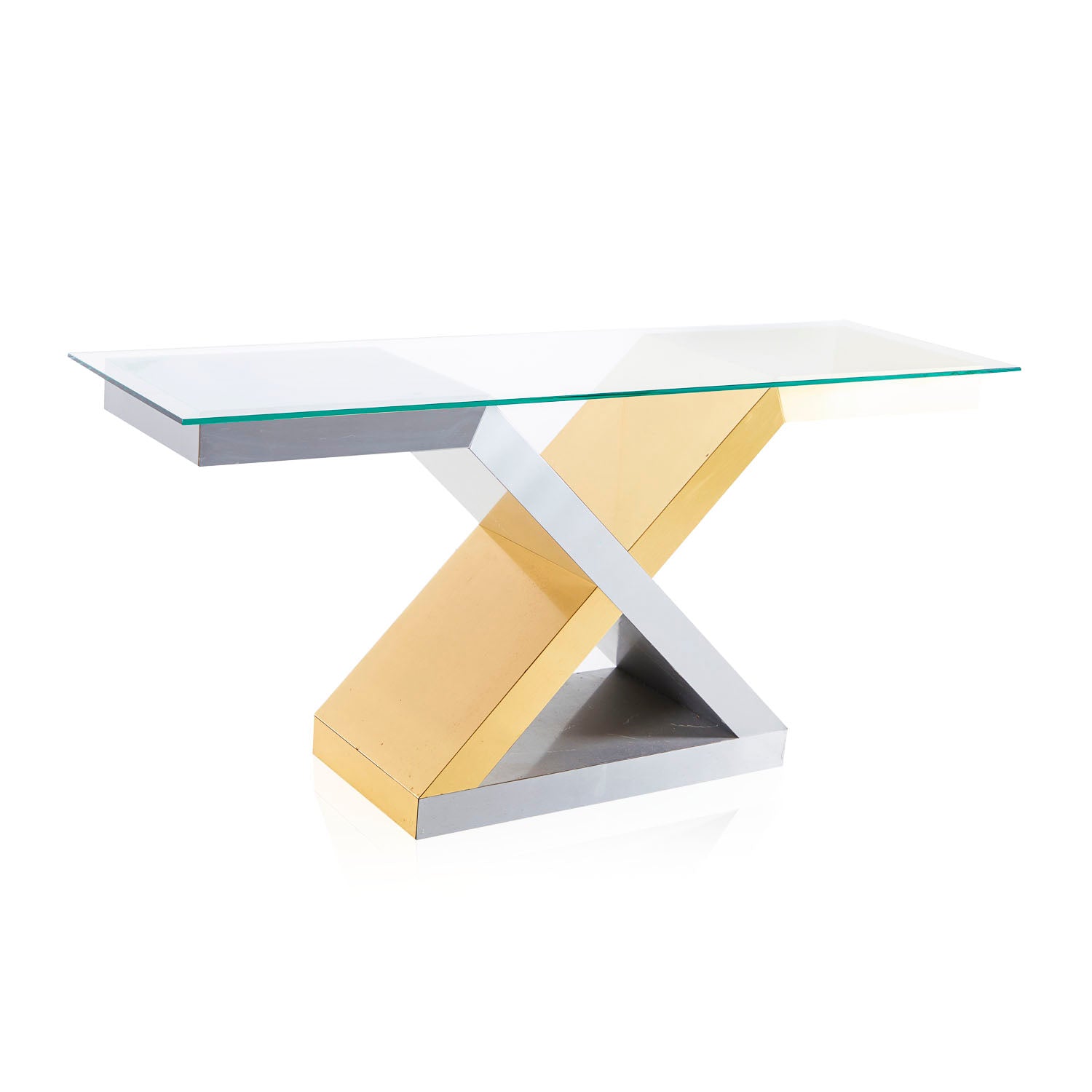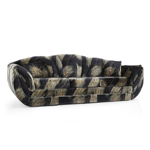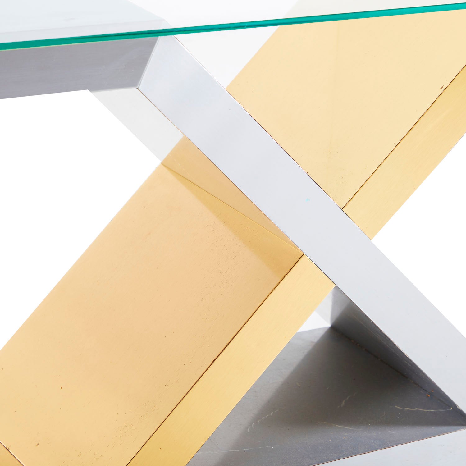 Details: Yellow daybed with a Dali-esque free-flowing organic form, supported by metal rods on a wood cross base