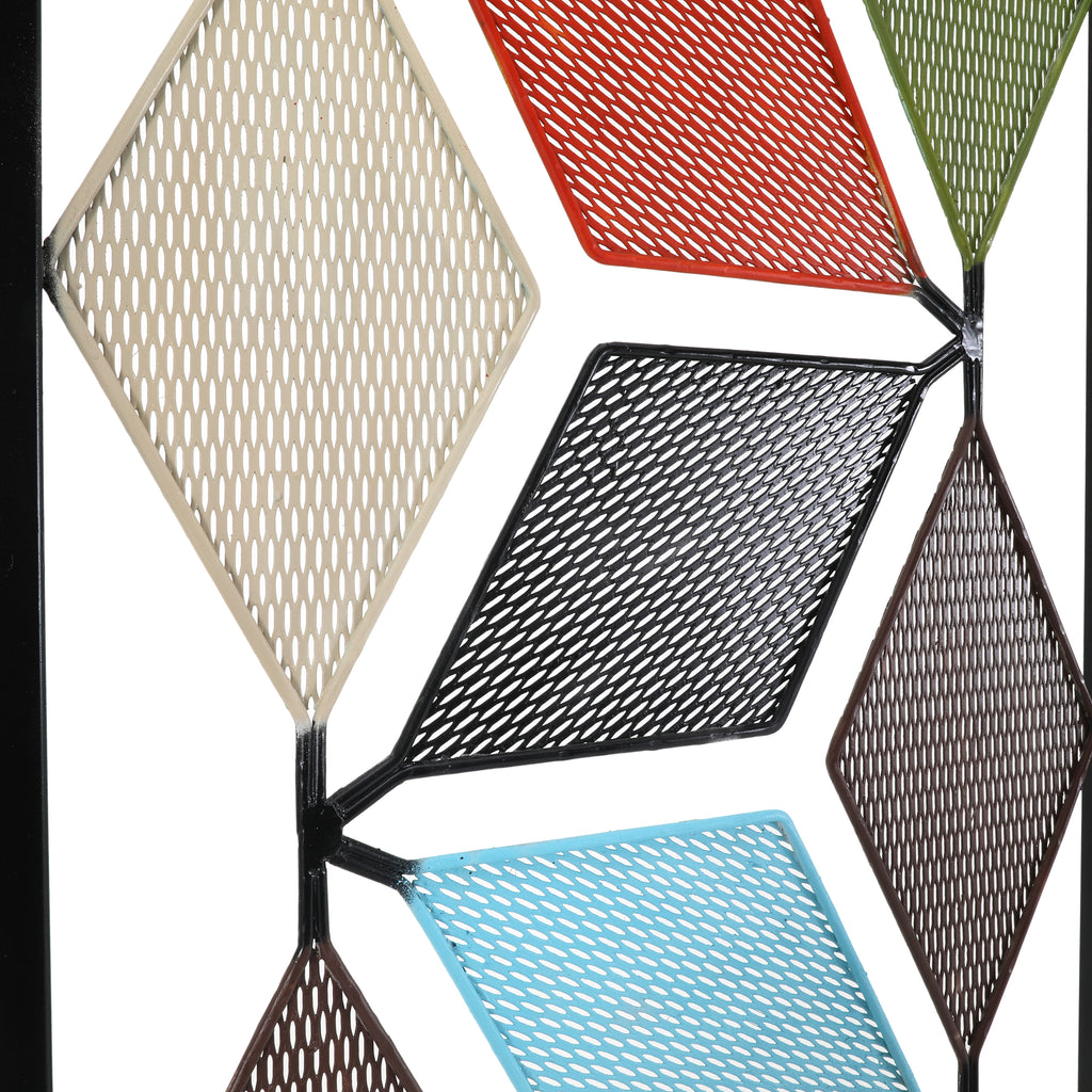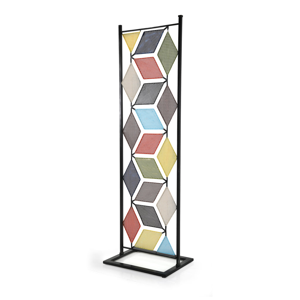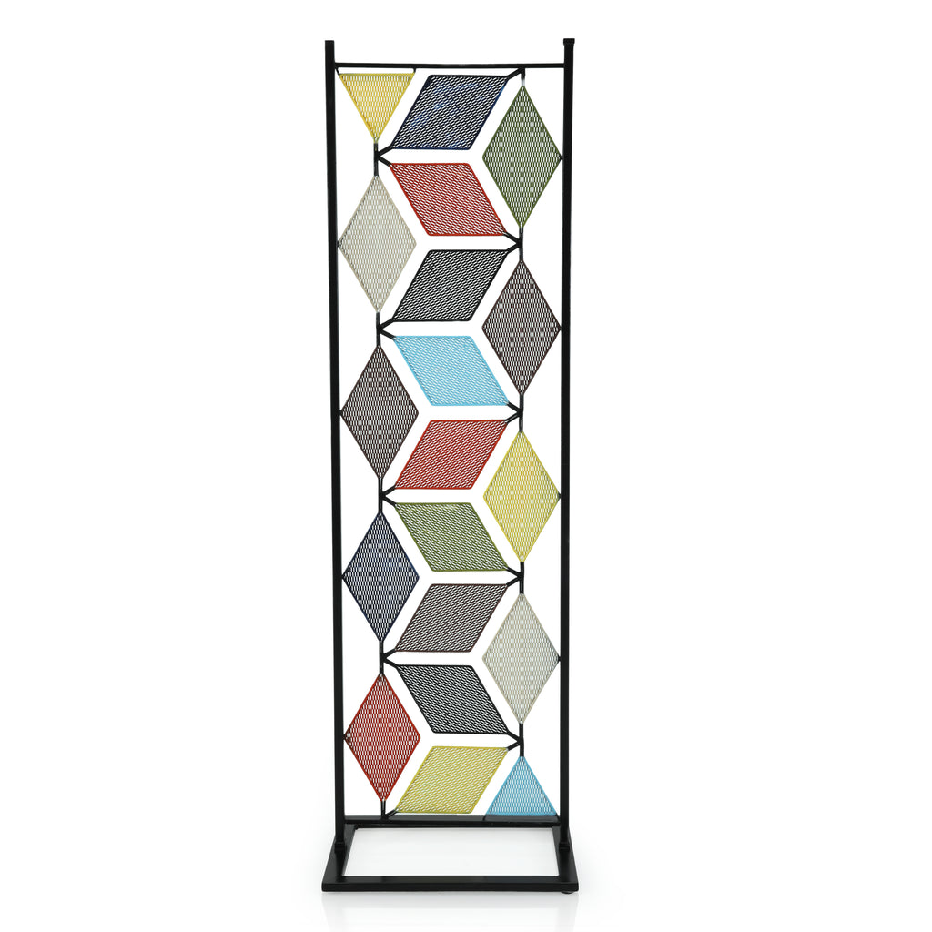 Details: Black, Red, Green, Blue, and Yellow diamonds in a black metal framed shaped Divider, Metal, Screen, Single, Individual Dimensions: 89" H x 26.25" W