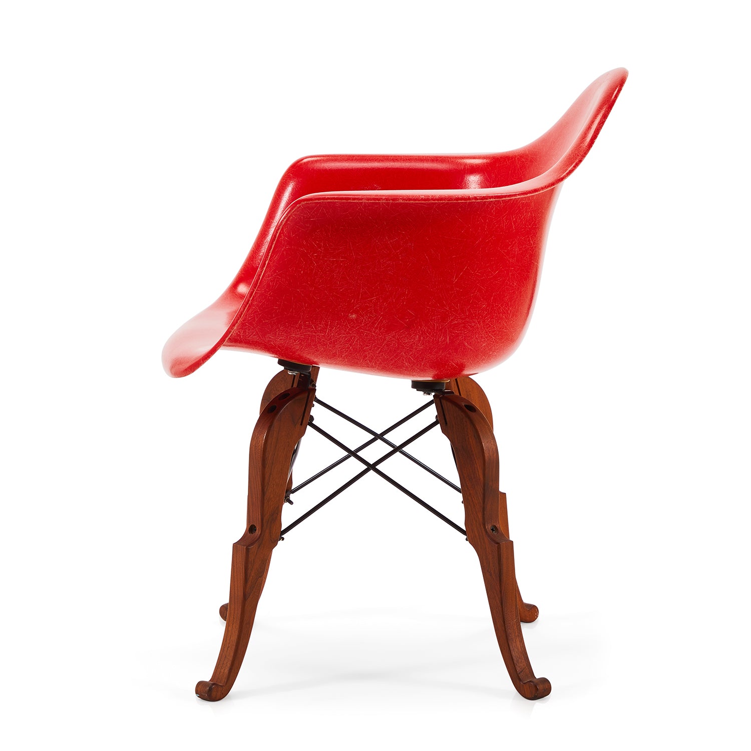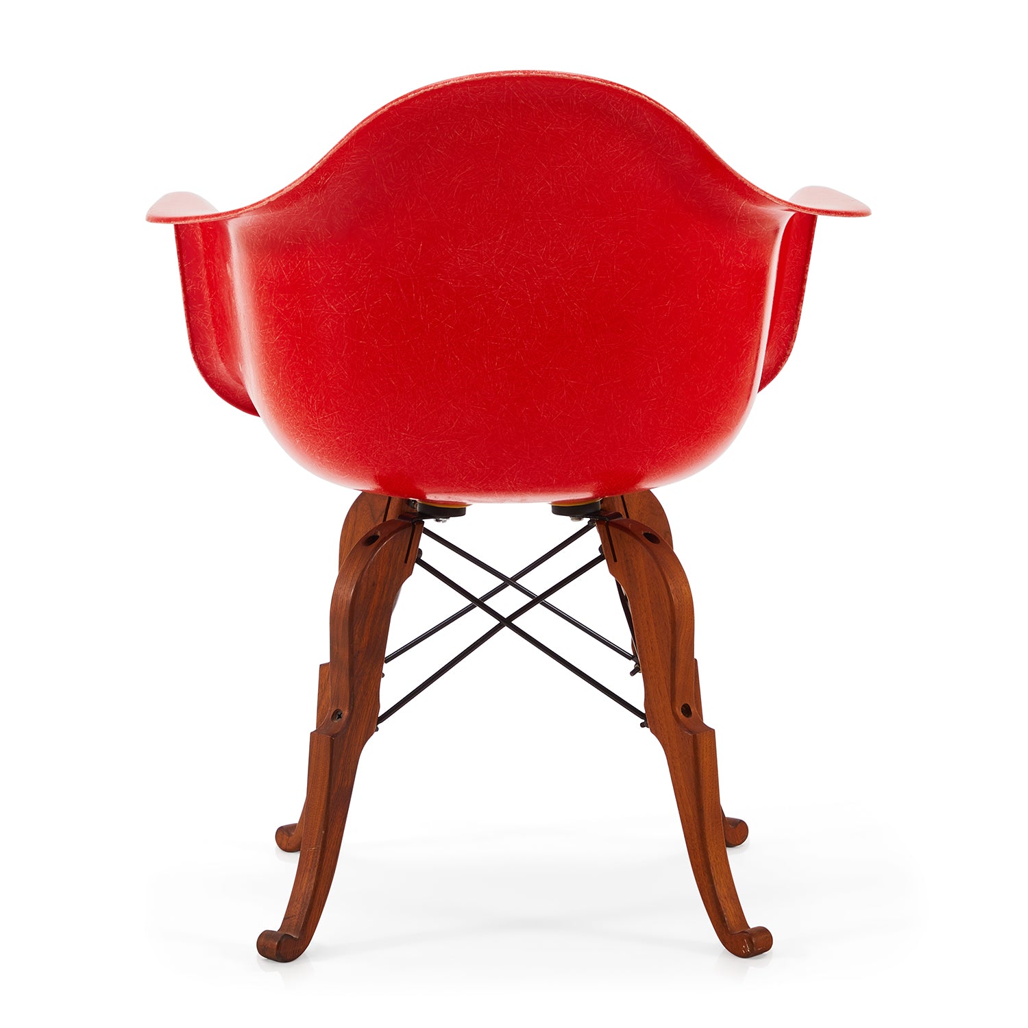 Details: Dark wood armchair with a cylindrical shape, a slatted back reaching to the floor, and round yellow upholstered cushion designed by Frank Lloyd Wright in 1937 Dimensions:...