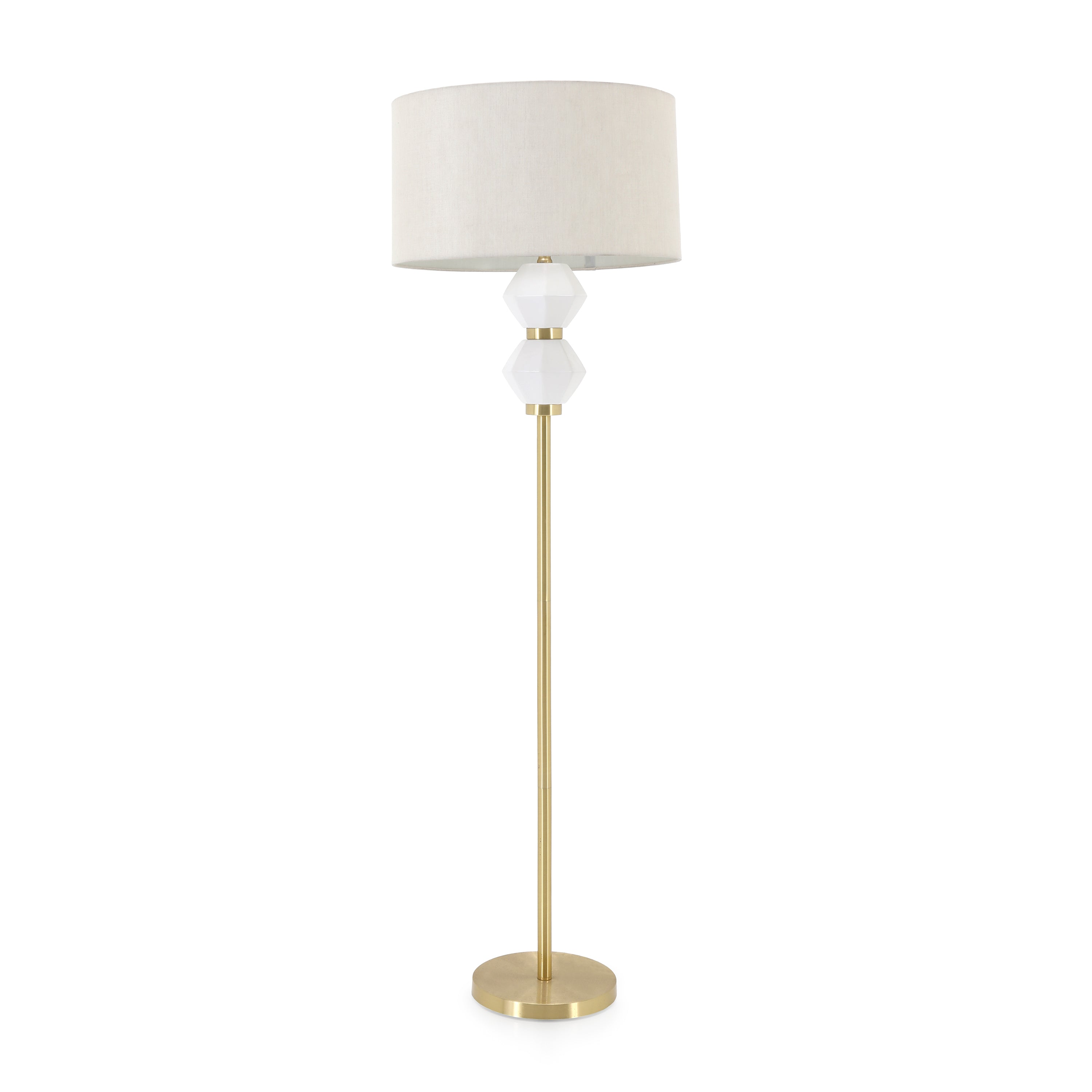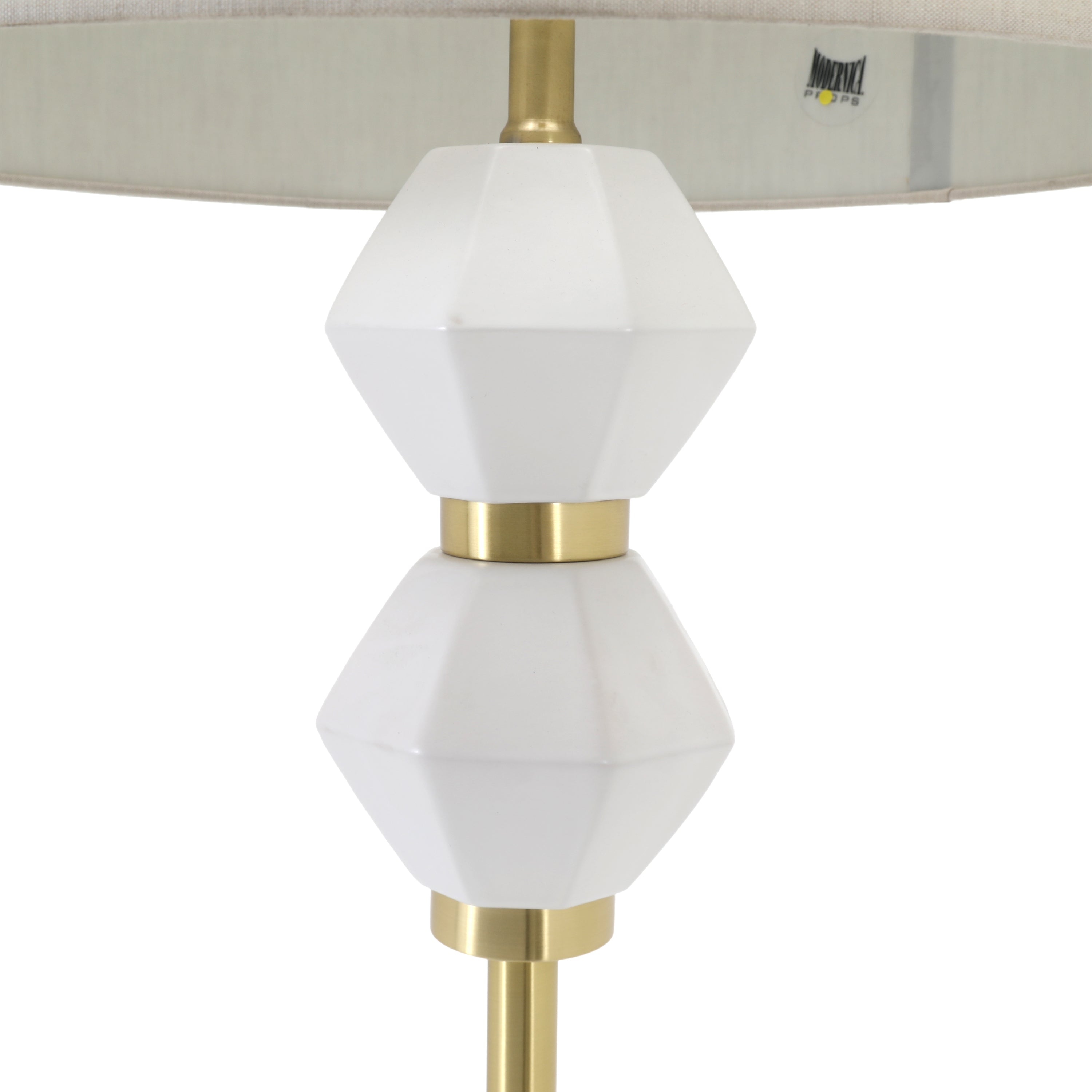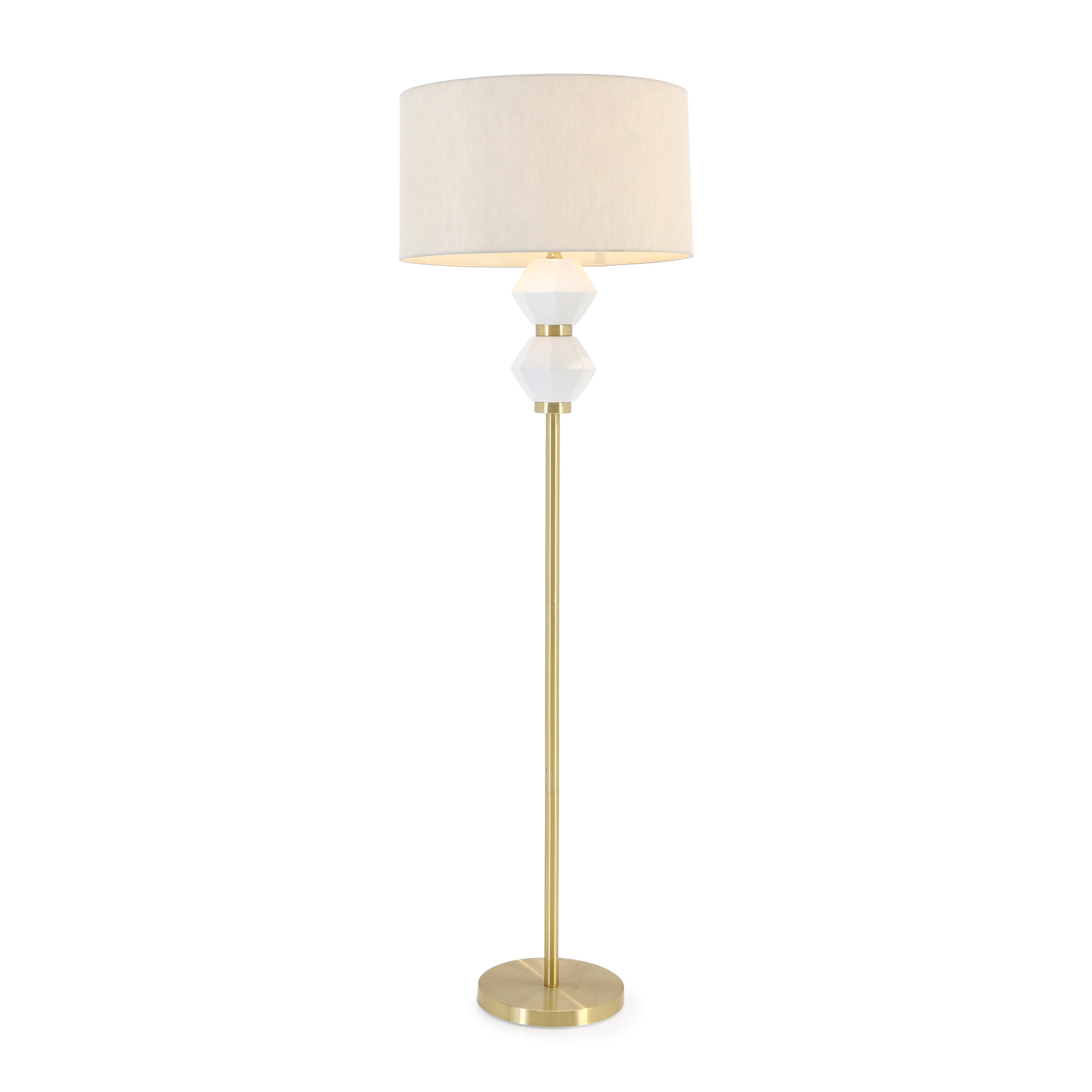Details: Black oval cutout frame mid-century floor lamp with long cream fabric shade on metal pole and round base NOTICEABLE WEAR (RENTED AS IS) Dimensions: 59"...