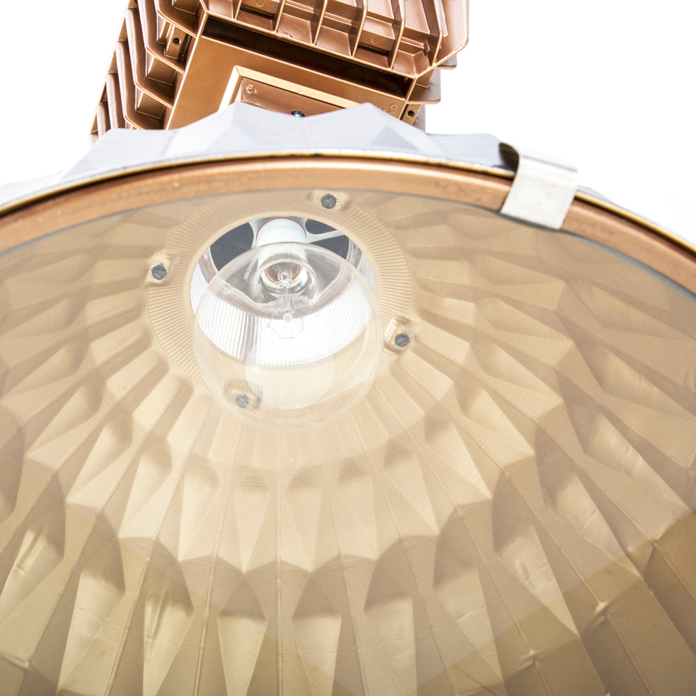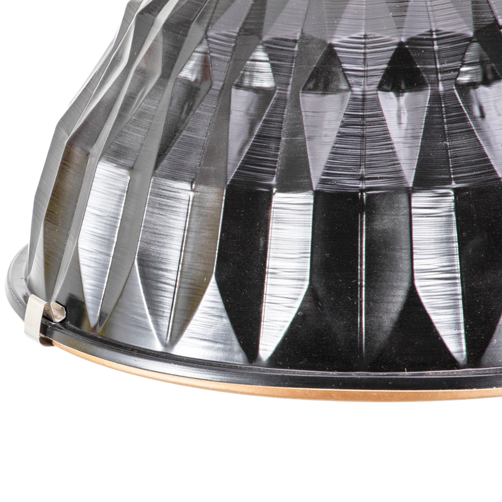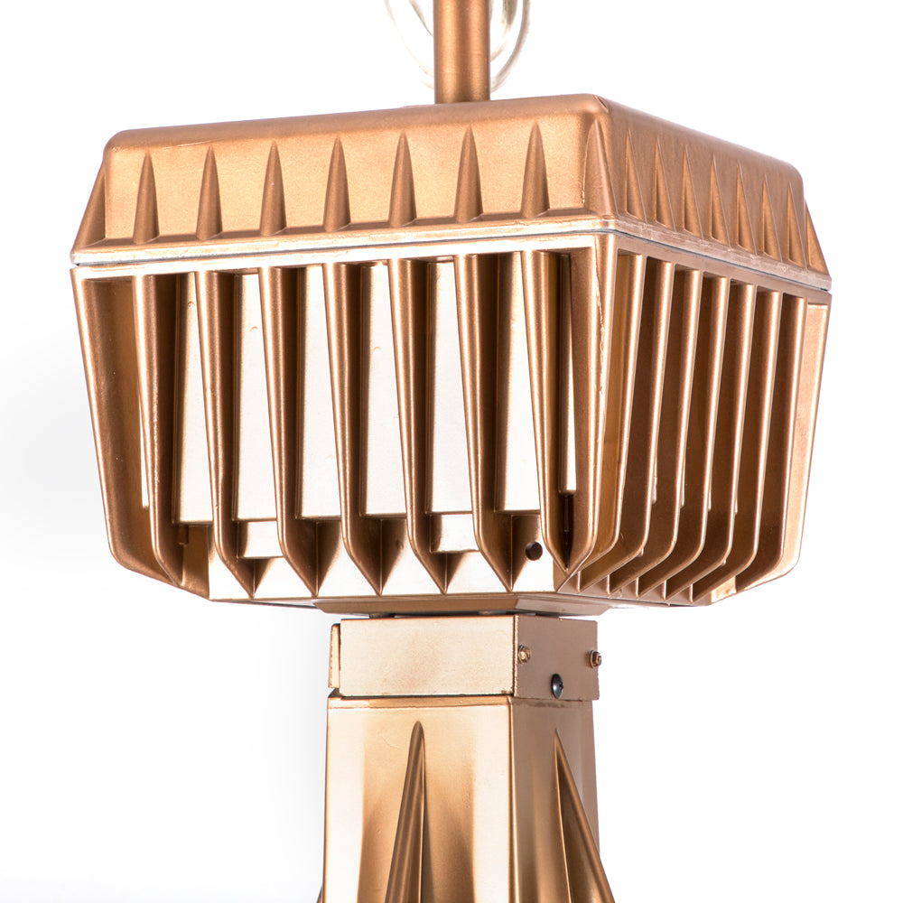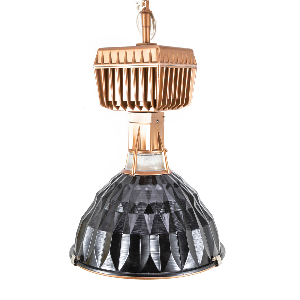 Details: Large corrugated black metal and gold industrial pendant lamp Dimensions: 36" H x 23" W x 23" D Quantity: 3