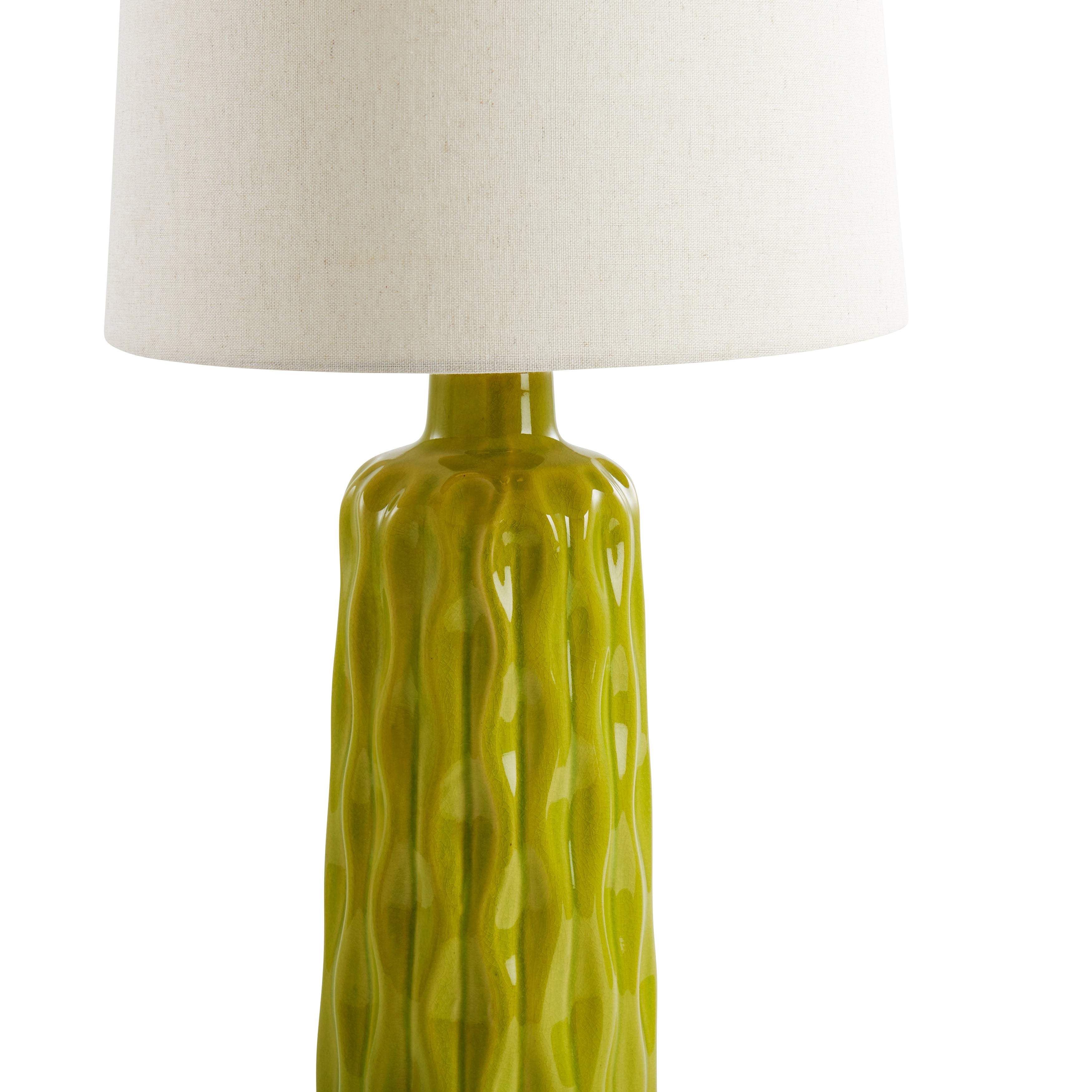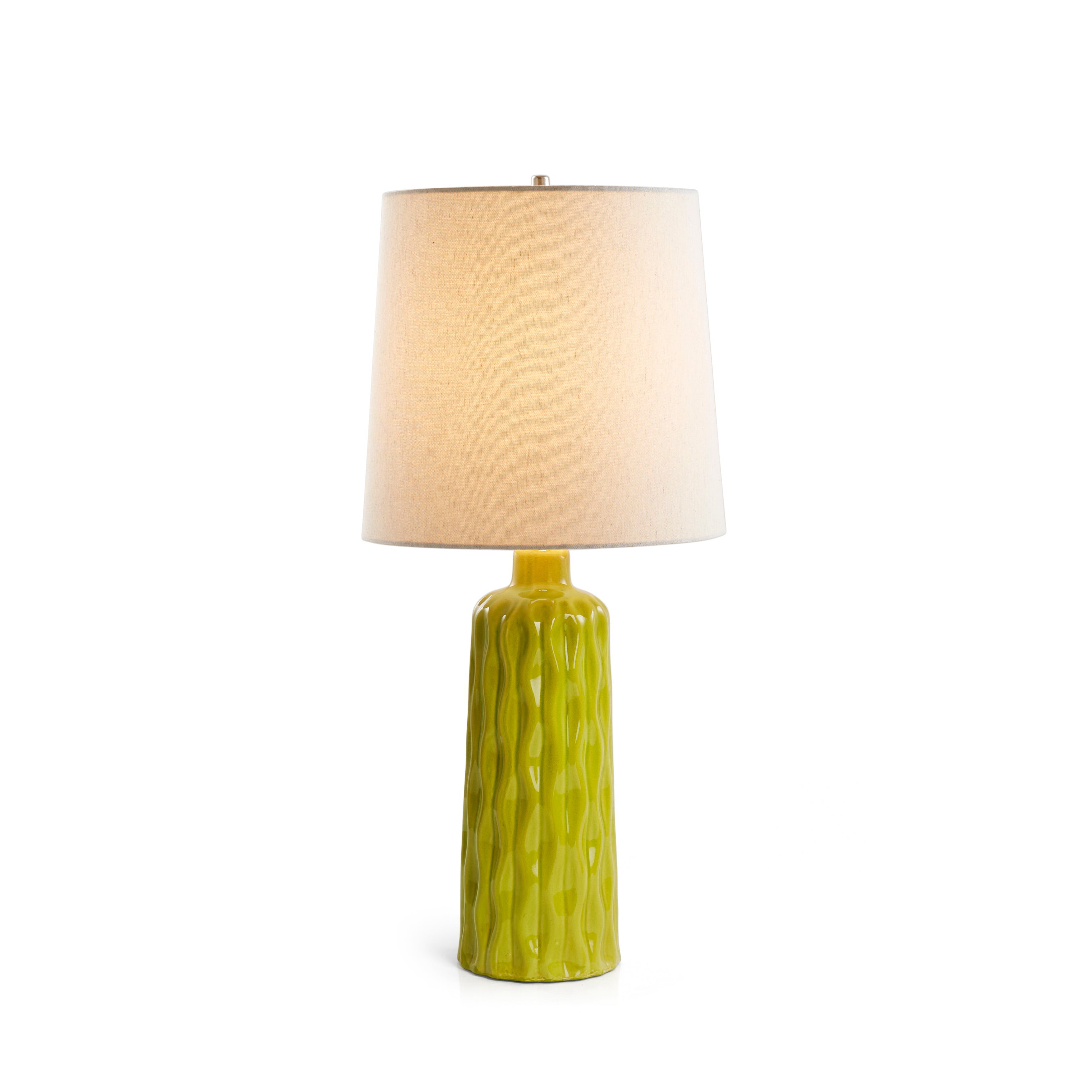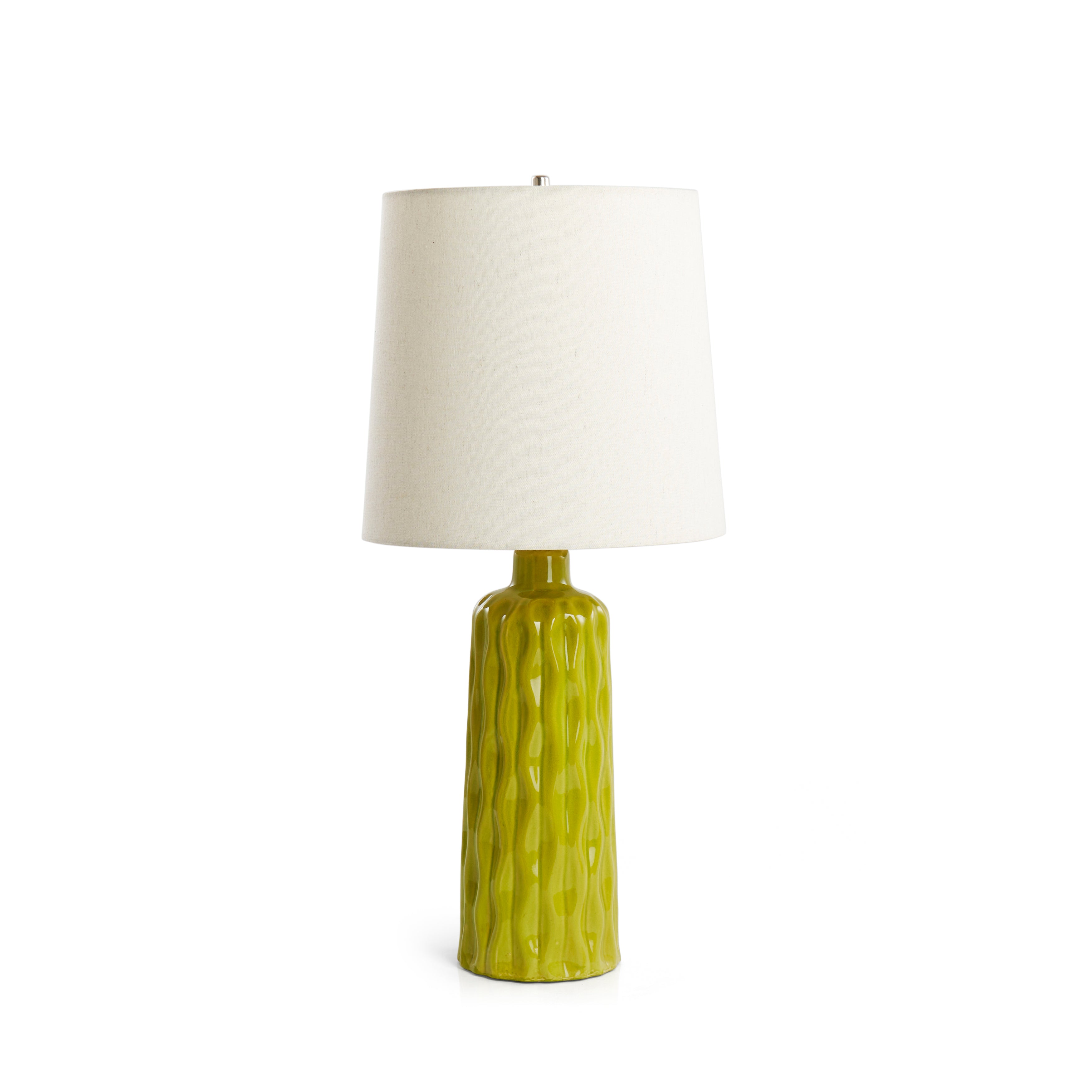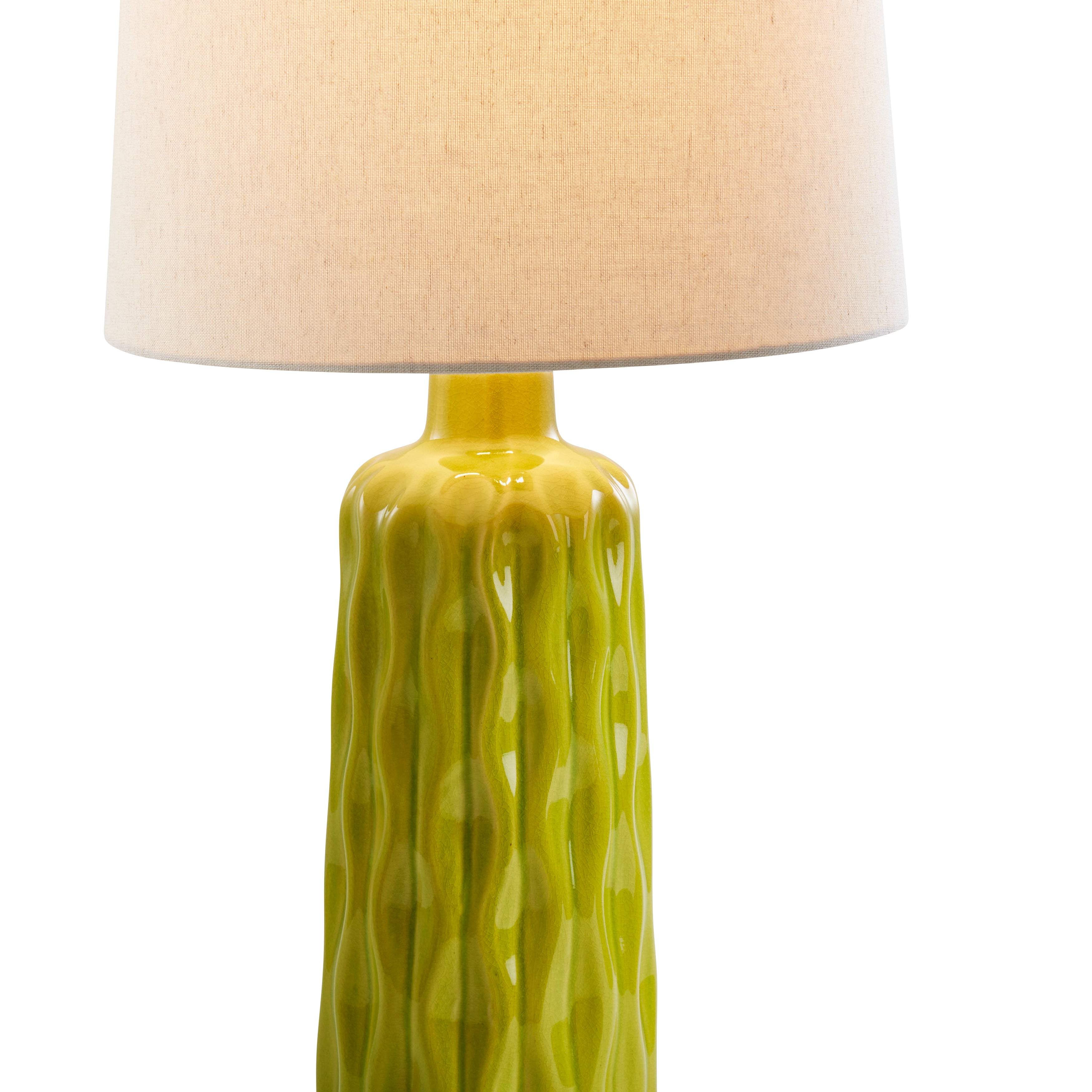 Details: Rippled chartreuse ceramic table lamp with a large off-white linen shade Dimensions: 30" H x 12" W x 12" D Quantity: 2