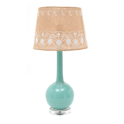 Details: Blue ceramic lamp with embossed cream shade. Dimensions: 7.5" H x 10" W x 10" D