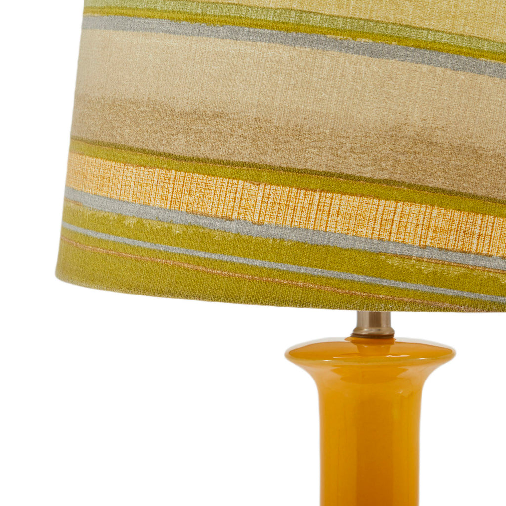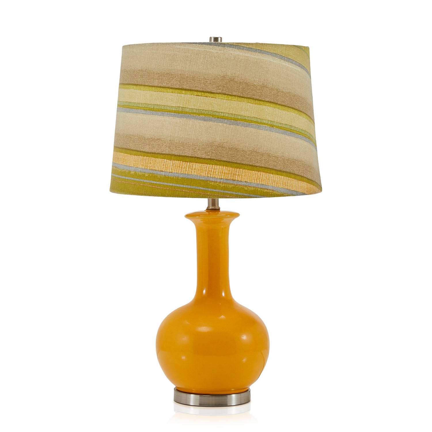 Details: yellow - Orange bulb base lamp with striped green/grey drum shadeDimensions: 27" H x 14" W x 14" D Quantity: 1