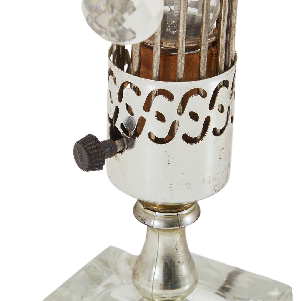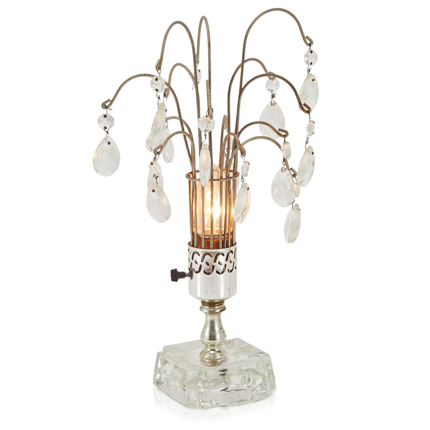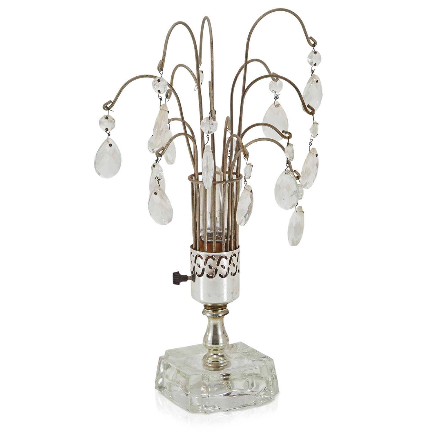 Details: Table lamp with curved wire top and small hanging crystals , square glass block base Dimensions: 15" H x 10" W x 10" D...