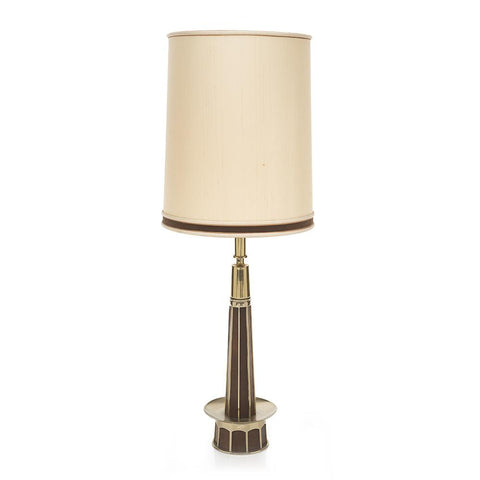 brass detail, tan linen shade Dimensions: 33" H x 6" W x 6" D Quantity: 2