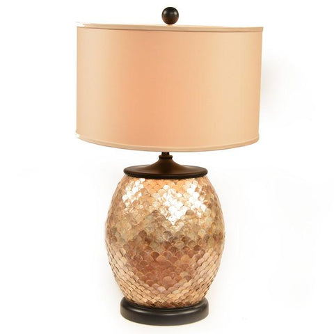 Details: Sea Shells, Table Lamp, Light, Drum Shade, Neutral, Tan, Dark Wood