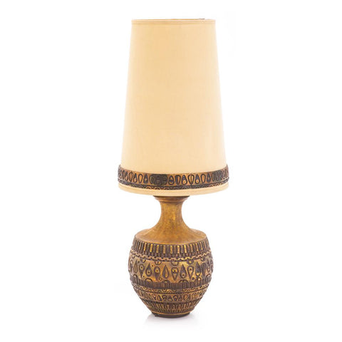 Details: Gold table lamp with carved primitive design. Dimensions: 49" H x 18" W x 18" D