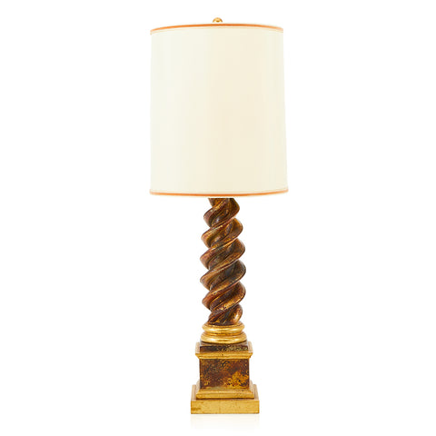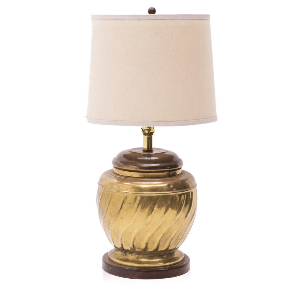 Details: Gold base with an off-white drum shade and mahogany base Dimensions: 27" H x 12.5" W x 12.5" D