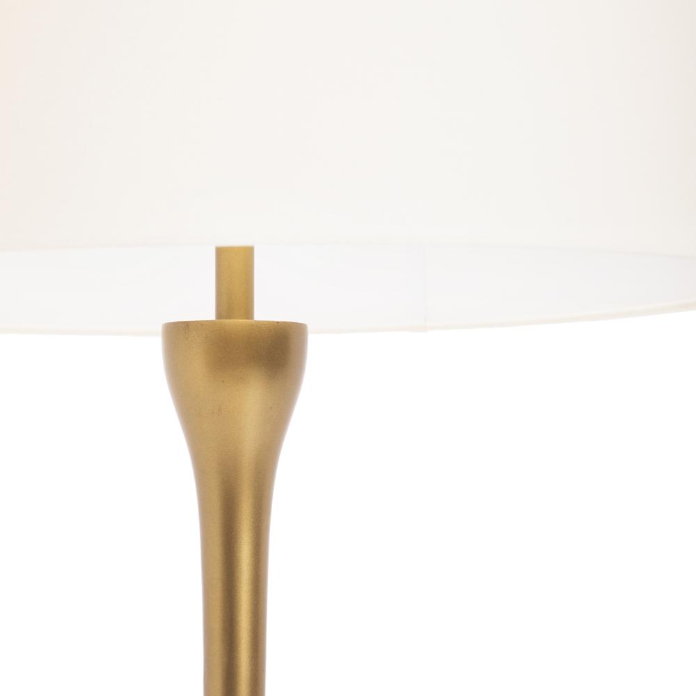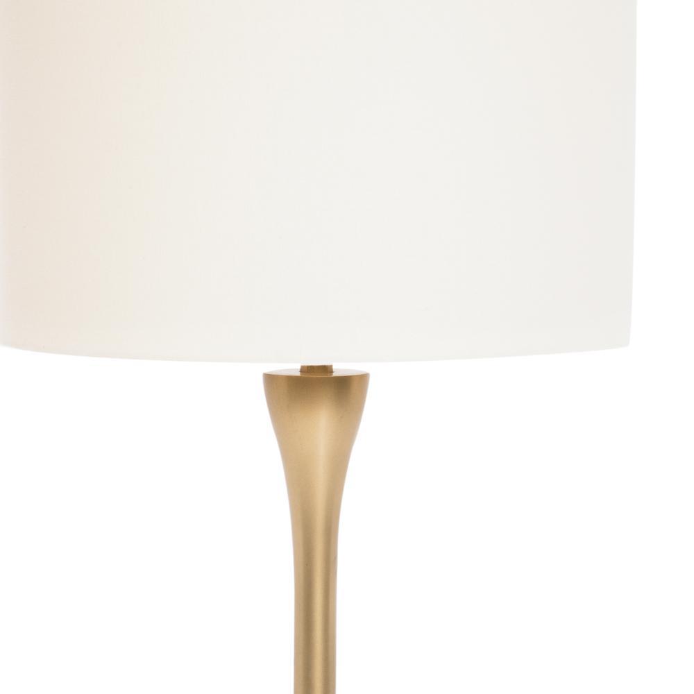 Details: Contemporary gold pole table lamp with round white base and small white drum shade Dimensions: 21" H x 8.5" W x 8.5" D Quantity: 7