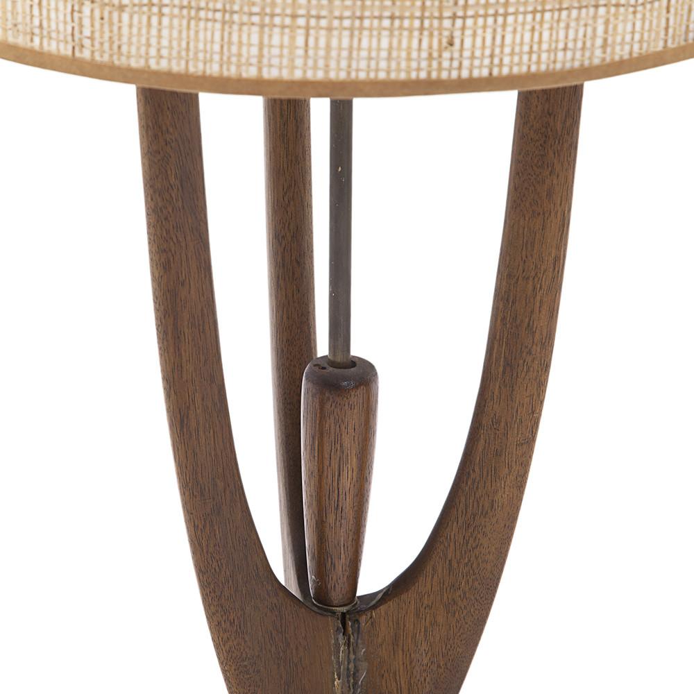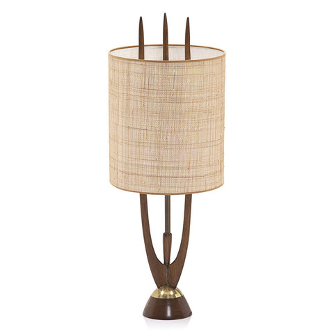 Details: Wood mid century table lamp with three spires and a round tan woven shade Dimensions: 40" H x 15" W x 15" D