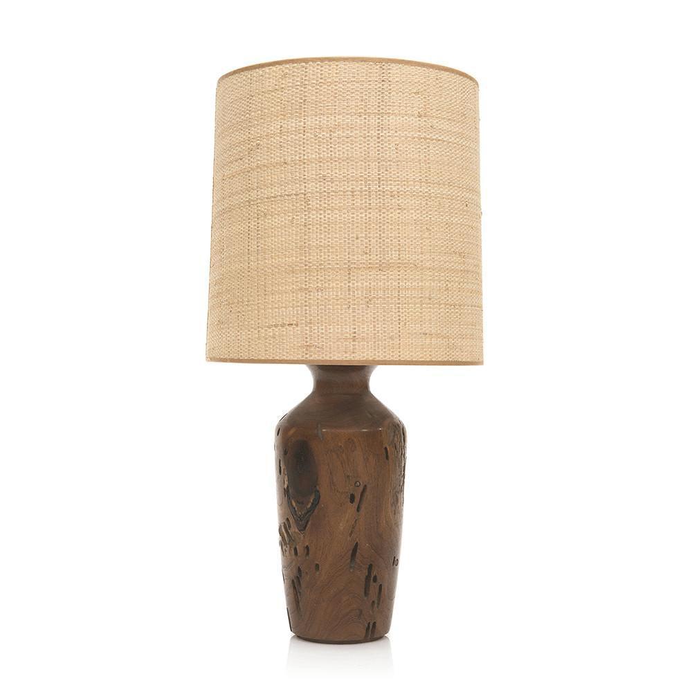 Details: Raw wood tapered block base with textured tan drum shade Dimensions: 33" H x 15" W x 15" D