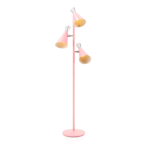 Details: A pink painted floor lamp with three cone shaped shades and round base Dimensions: 64" H x 12.5" W x 18" D Quantity: 1