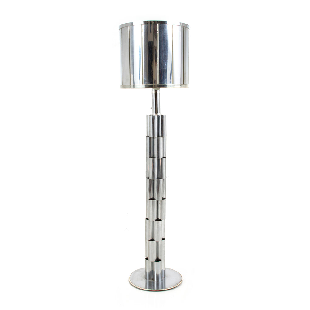 Details: Curtis Jere floor lamp with stacked chrome pillar base, cylinder chrome / metal shade Dimensions: 60" H x 13" W x 13" D Quantity: 1