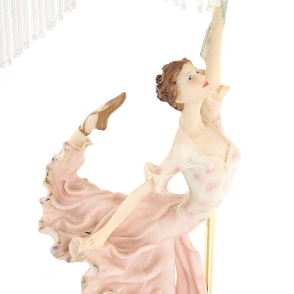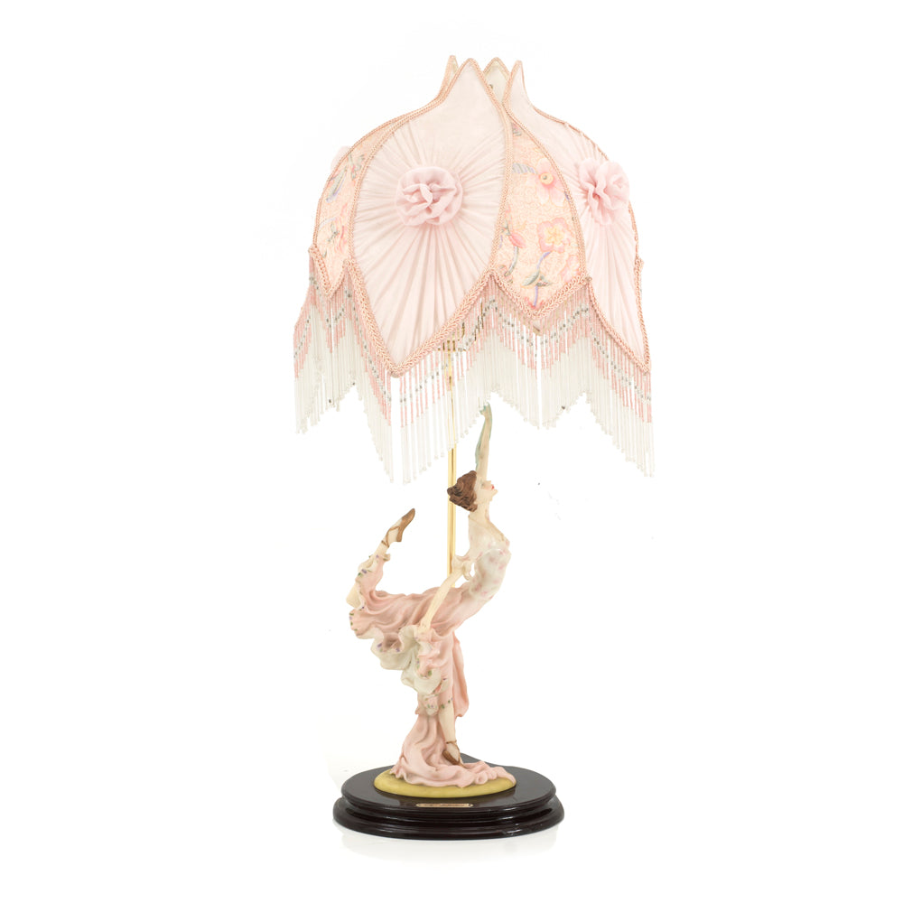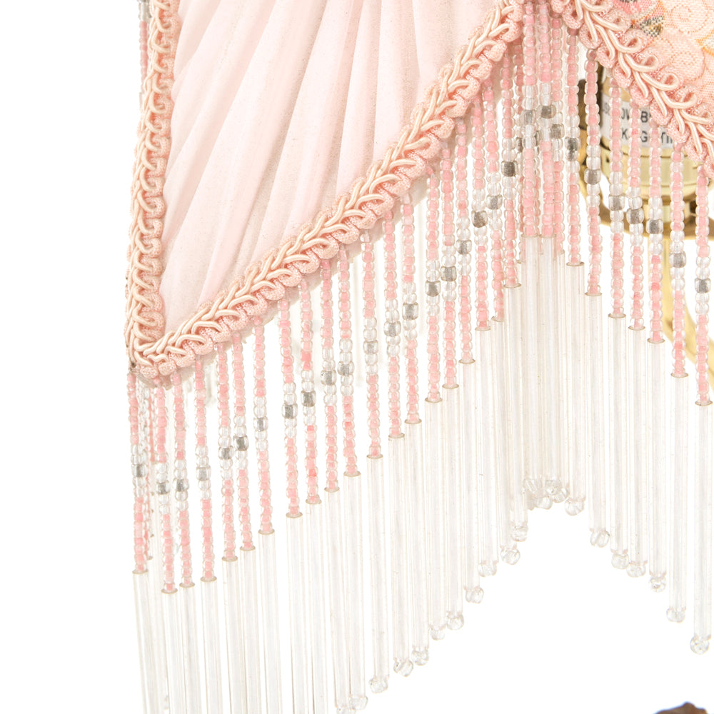 Details: Pink dancing figure base, pleated fabric Victorian style shade, with white/pink beaded fringe