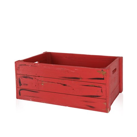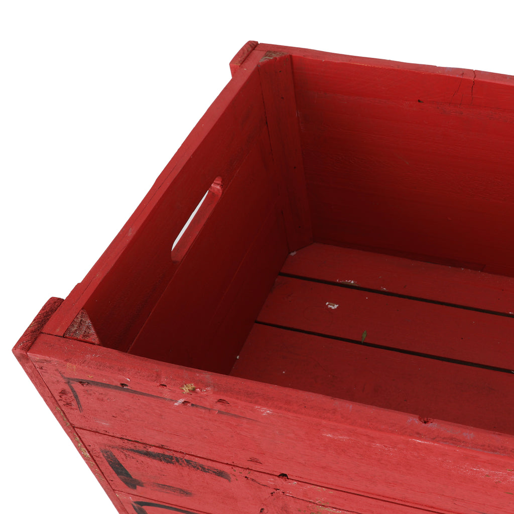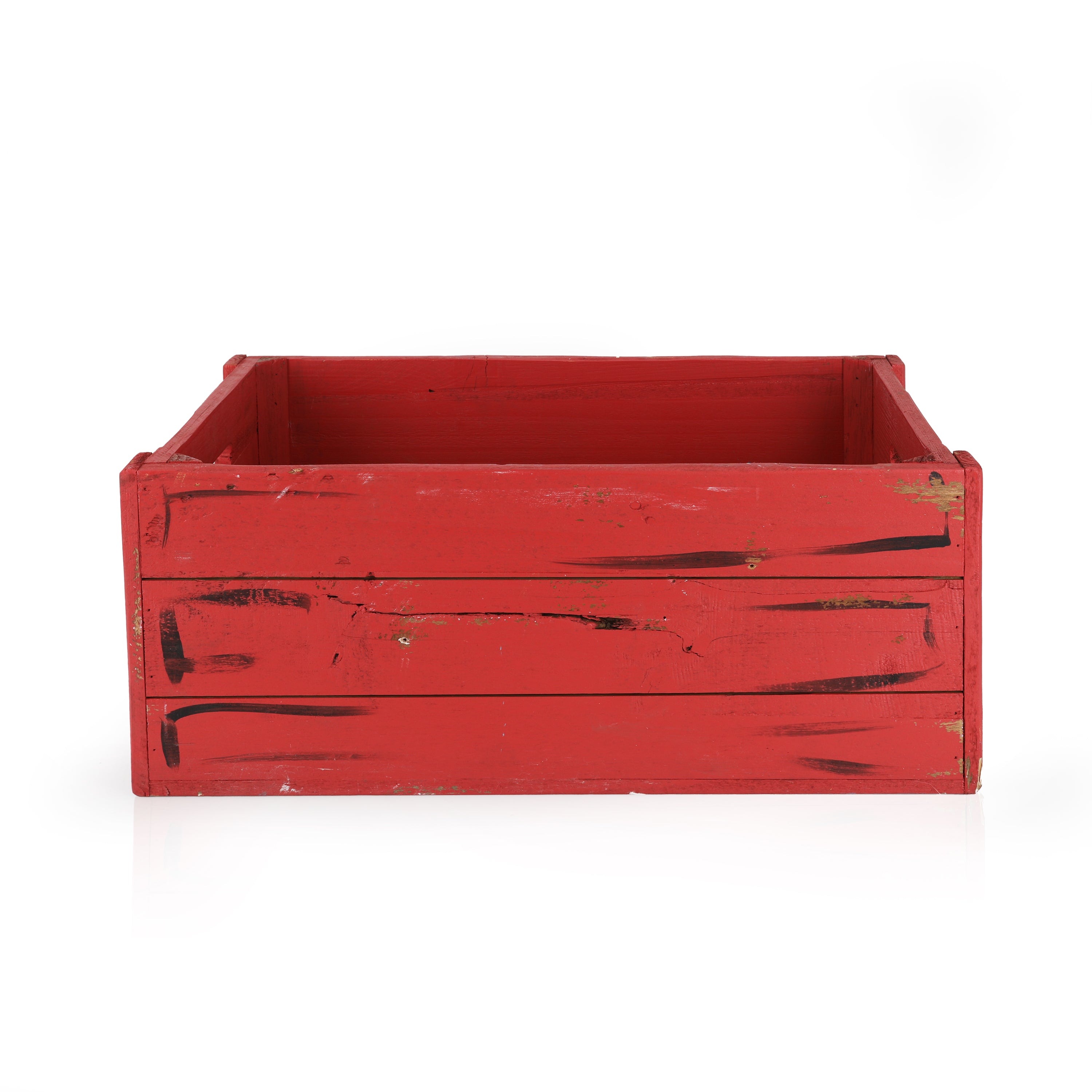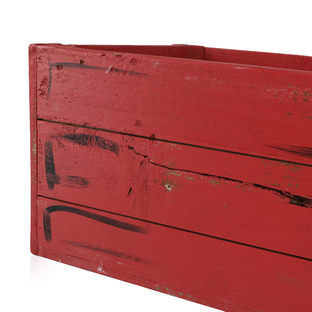 Details: Dark red wood crate with a hinged top and rope handles on the sides. Hand painted lettering on the top and side. Dimensions: 13"...