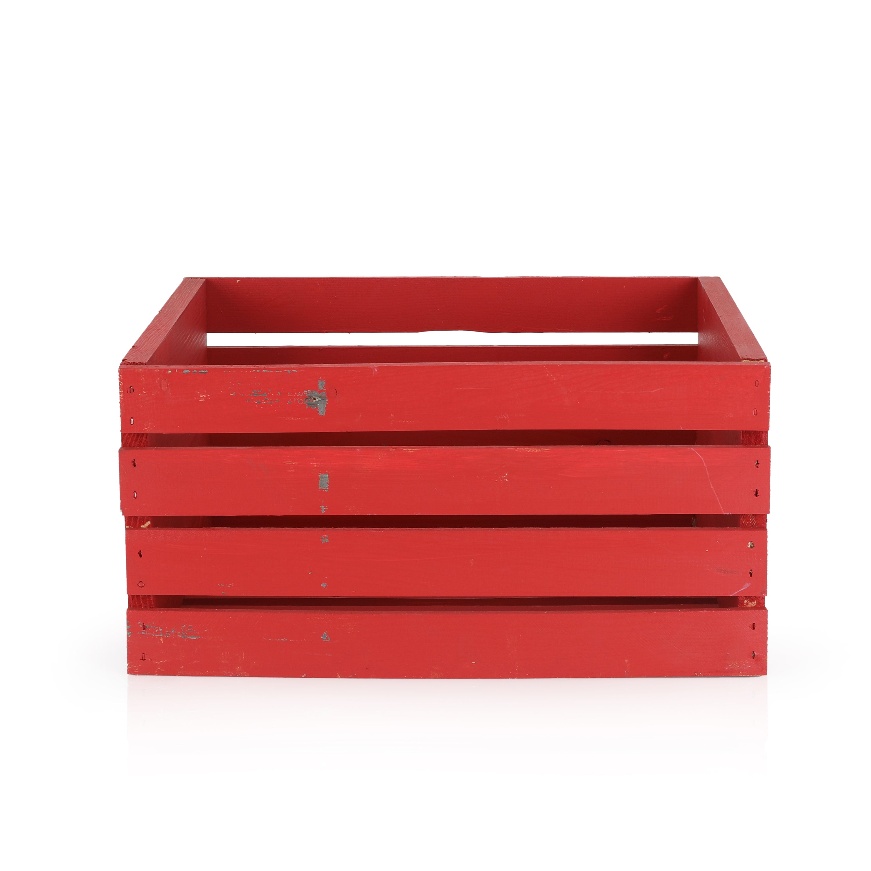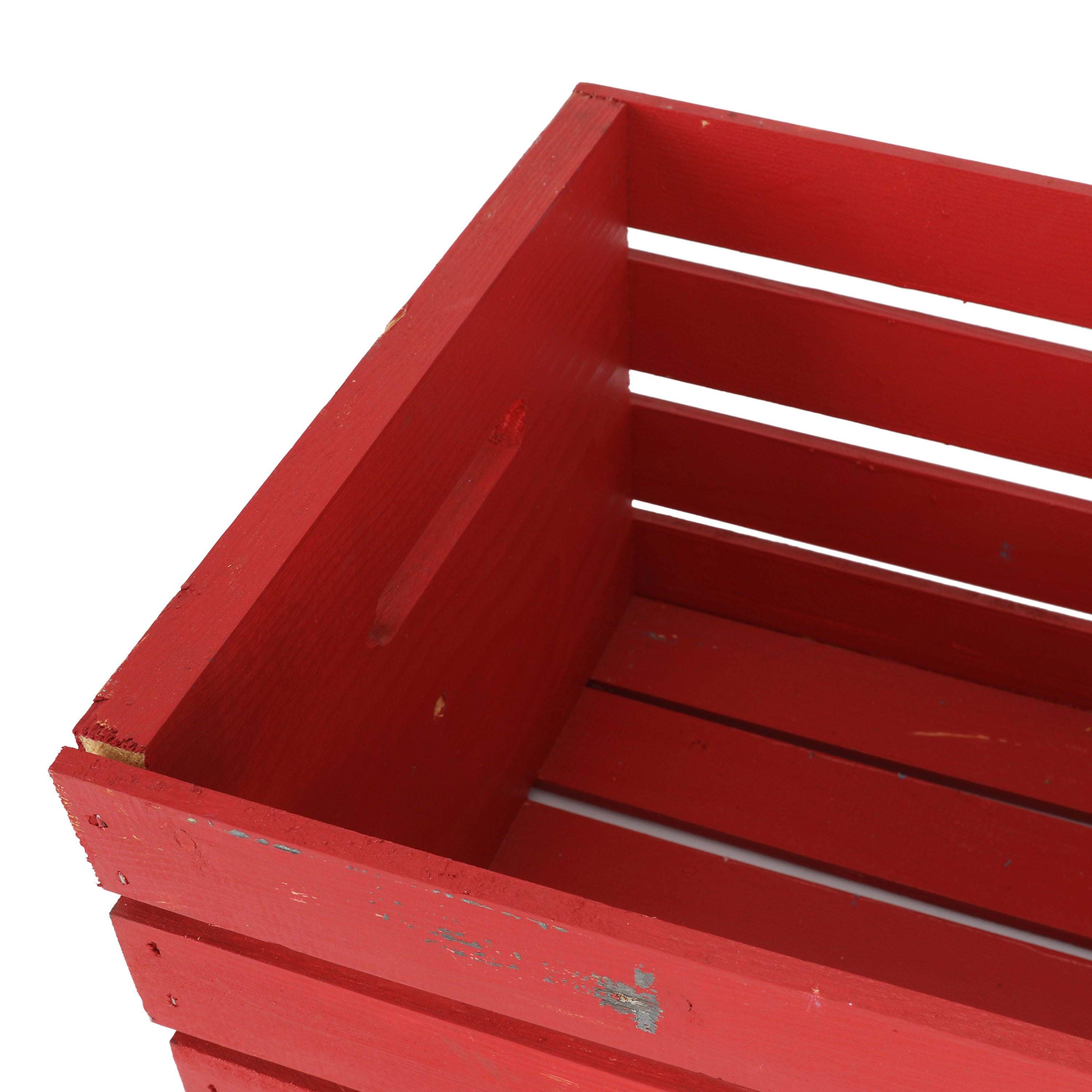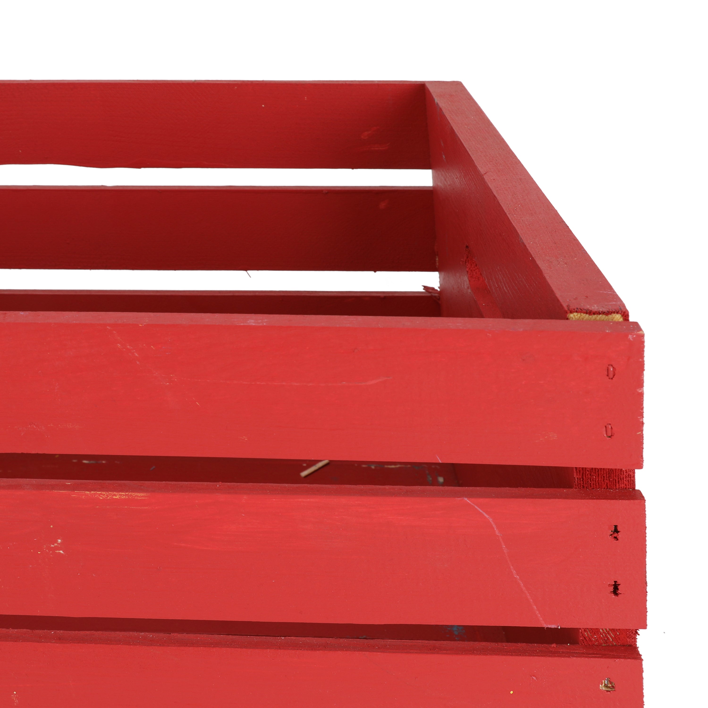 Details: Dark red wood crate with a hinged top and rope handles on the sides. Hand painted lettering on the top and side. Dimensions: 13"...