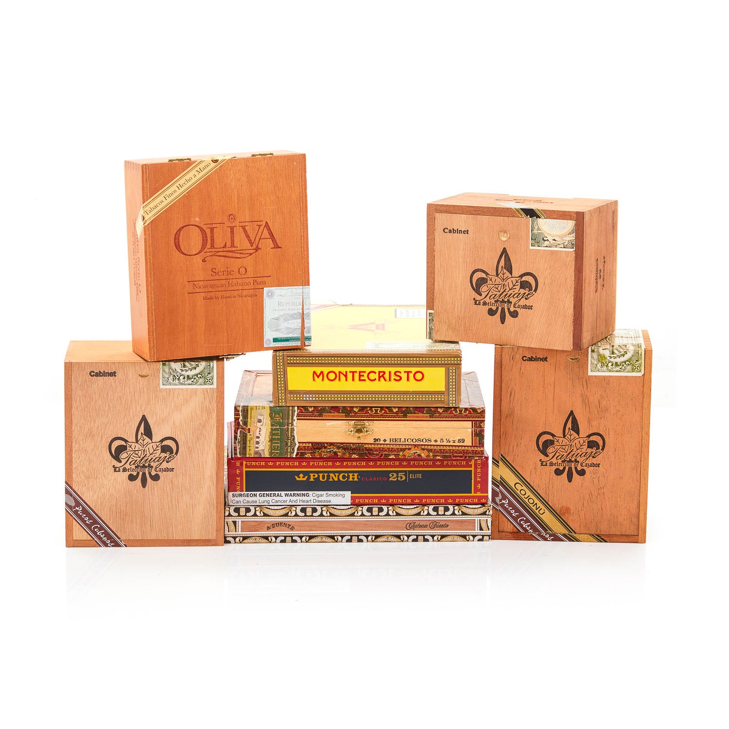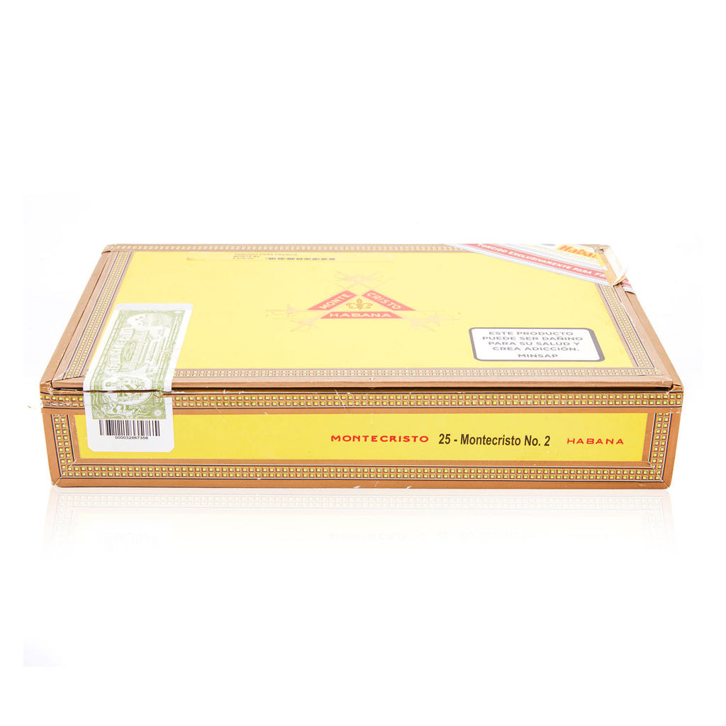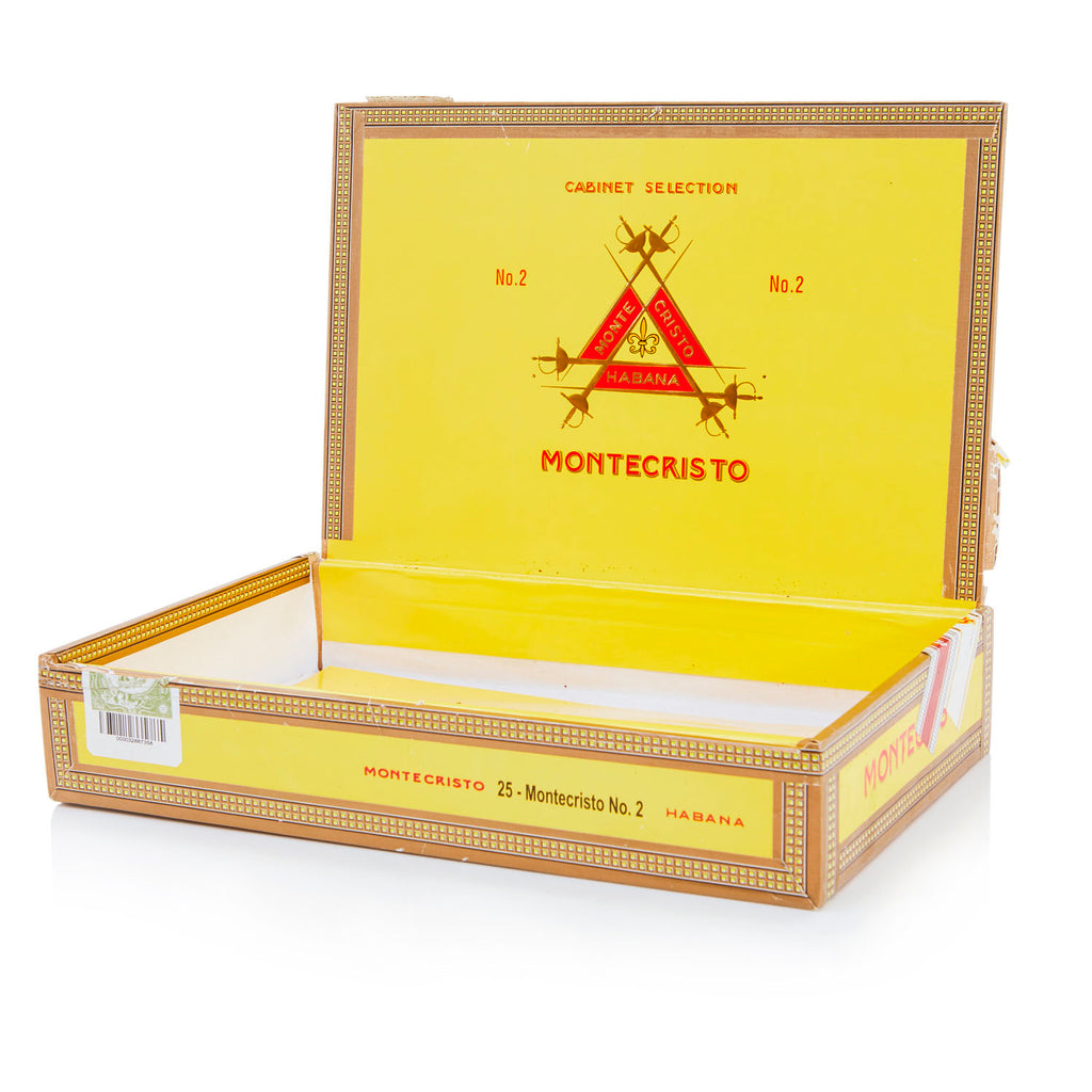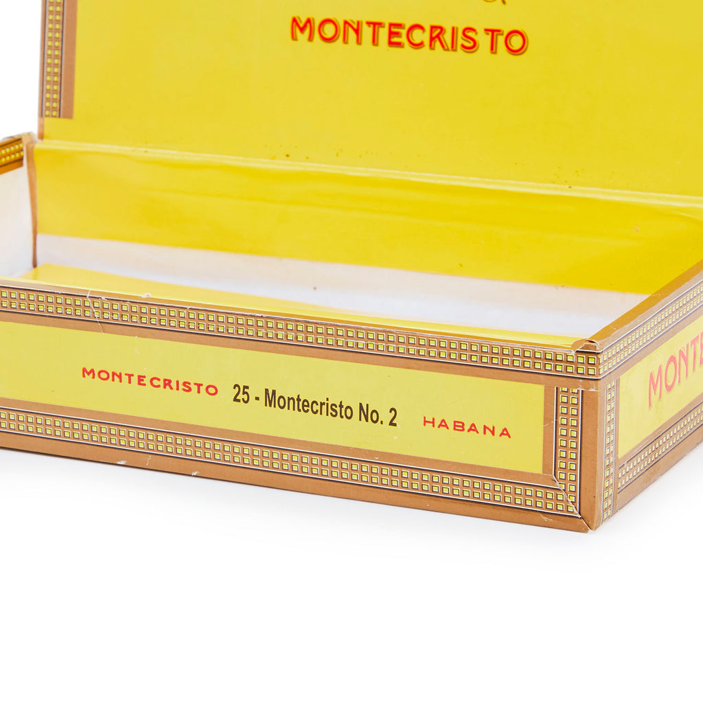 Details: Yellow 'Montecristo' No. 2 cigar box with red lettering