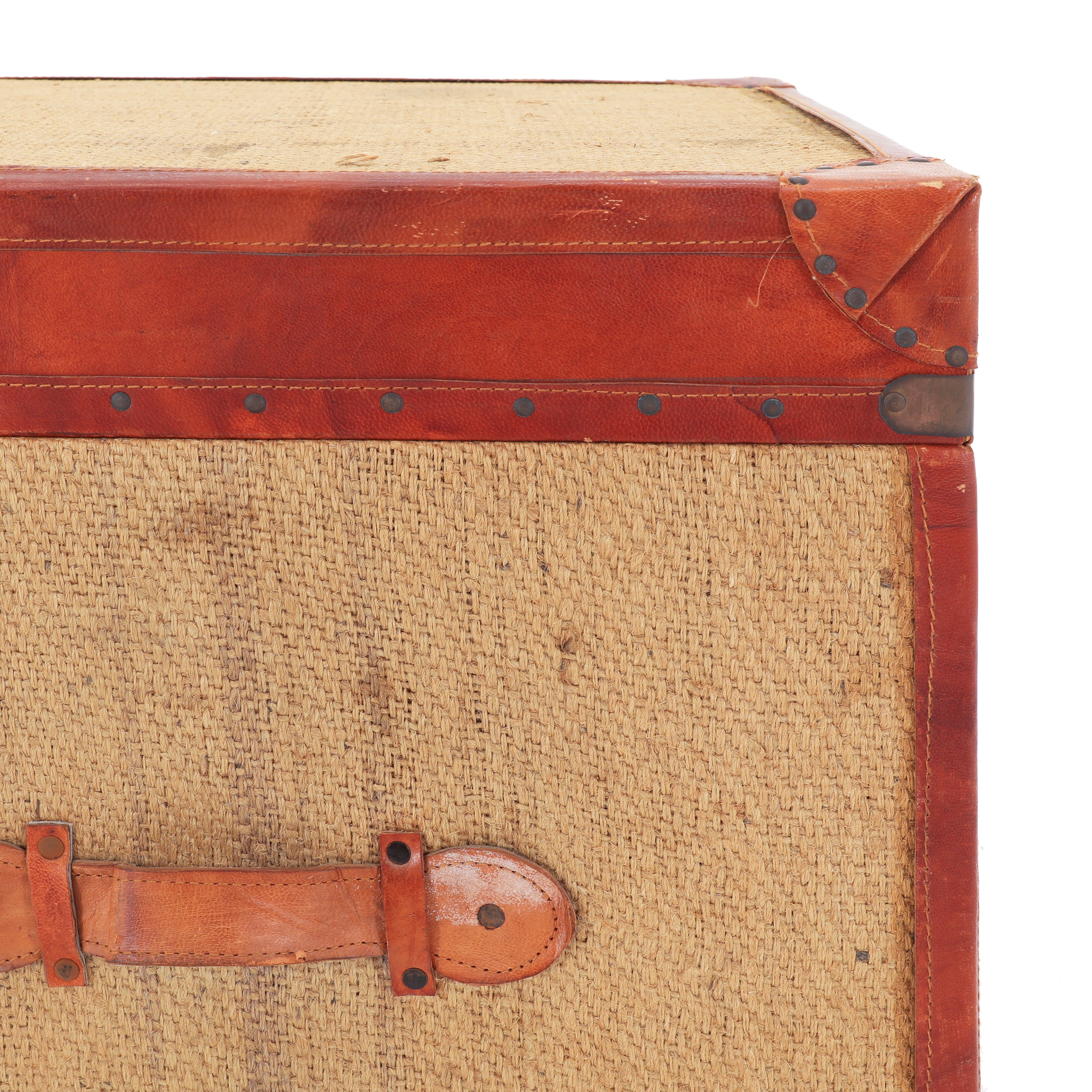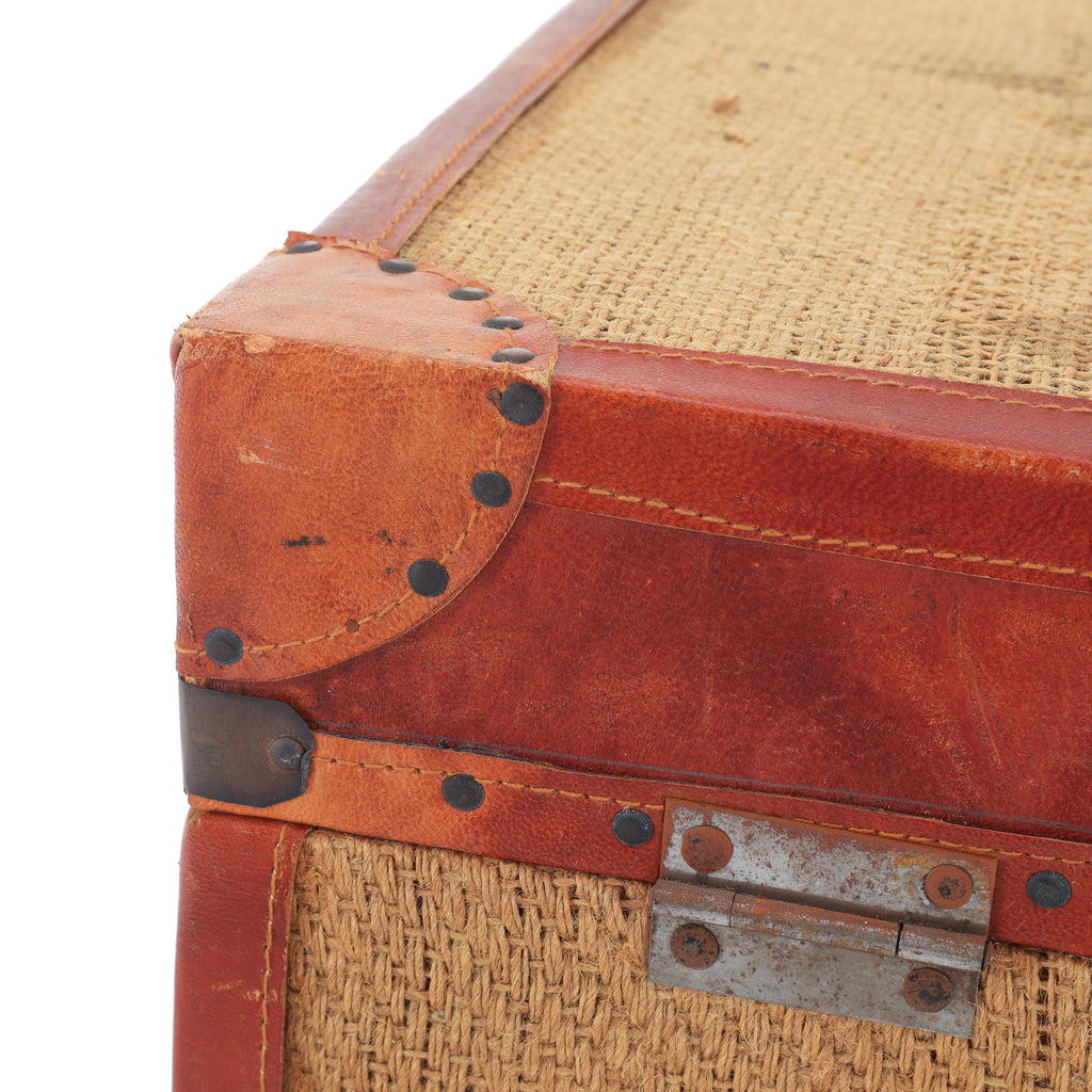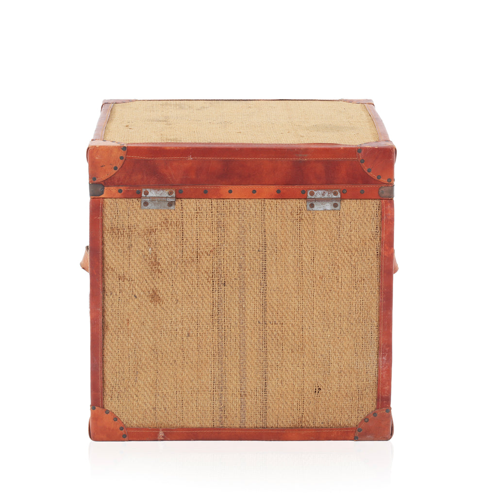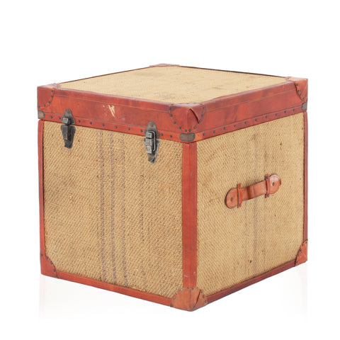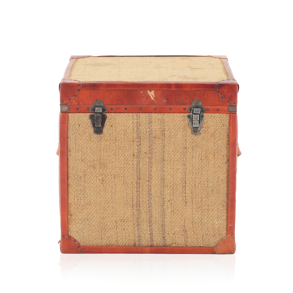 Details: Red / burnt orange leather & burlap square storage cube / trunk Dimensions: 18" H x 18" W x 18" D Quantity: 2