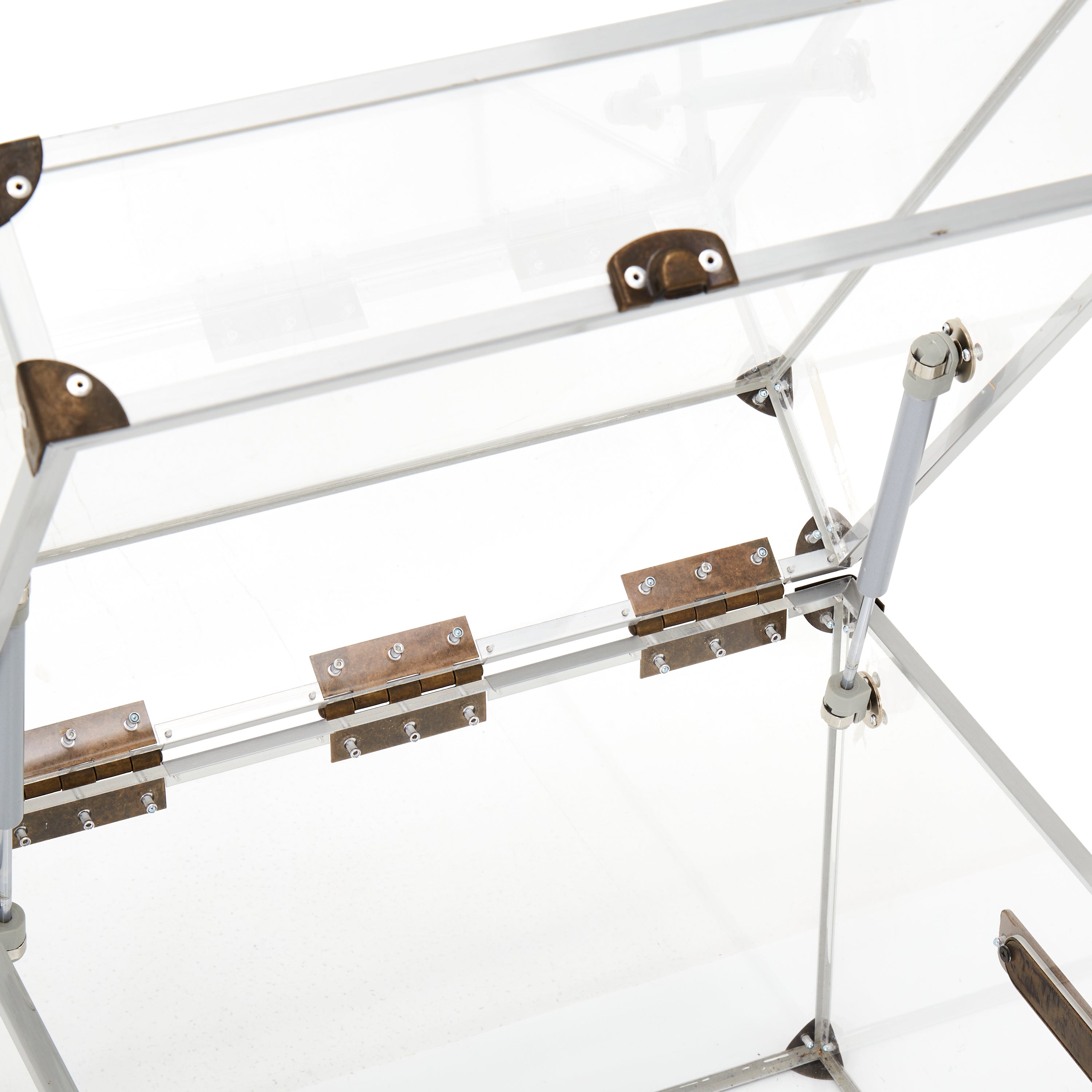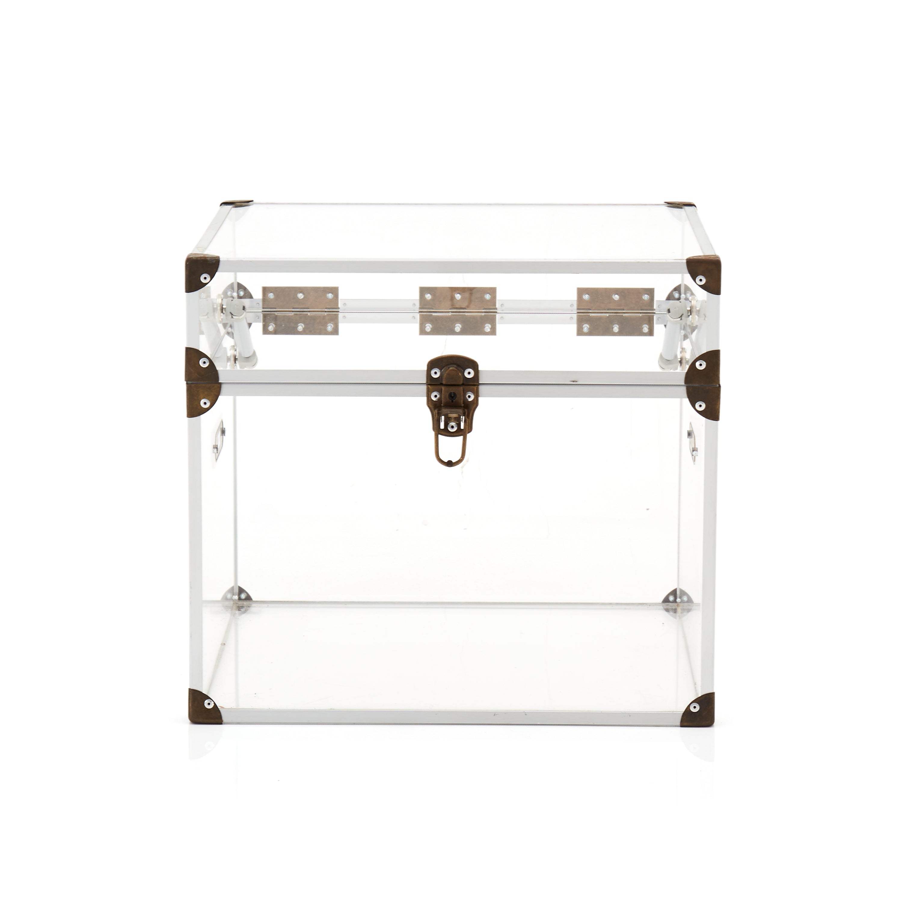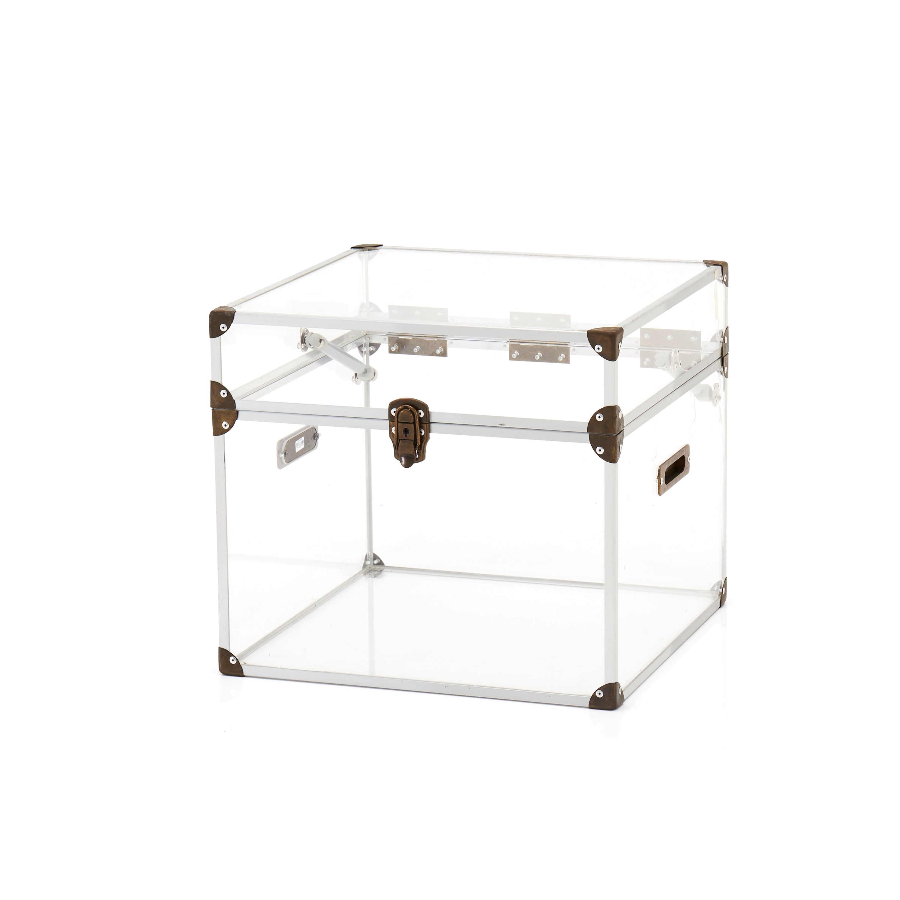 Details: Transparent acrylic box with metal hinges, corners, and latch Dimensions: 16" High x 18" Wide x 18" Deep Quantity: 2