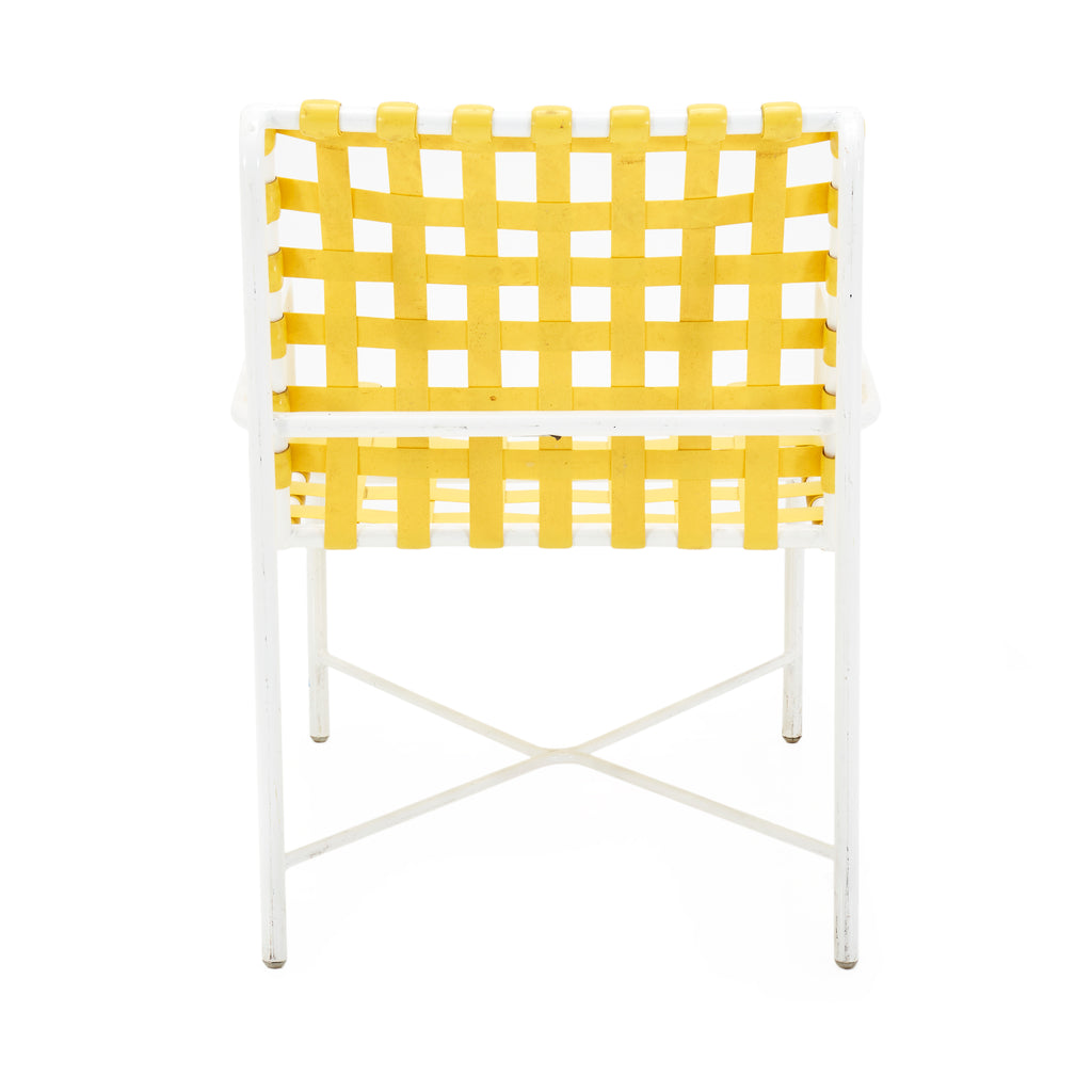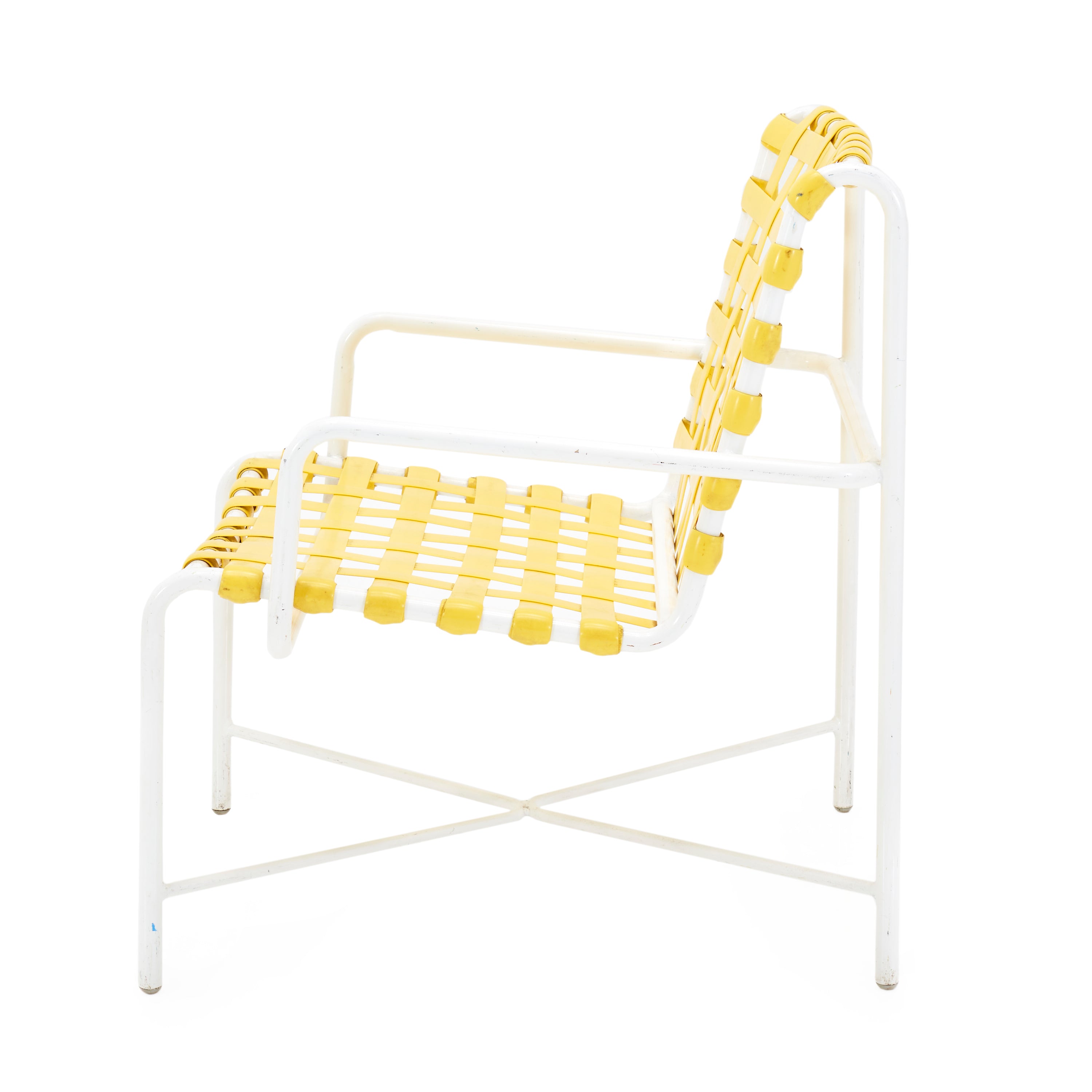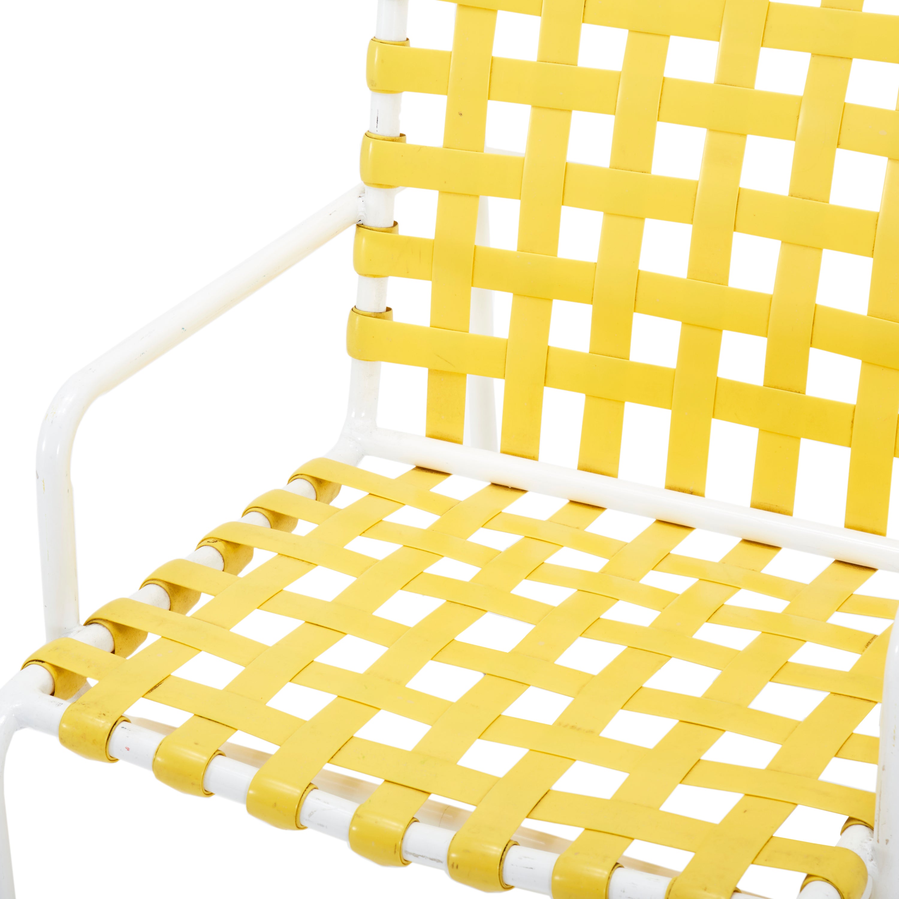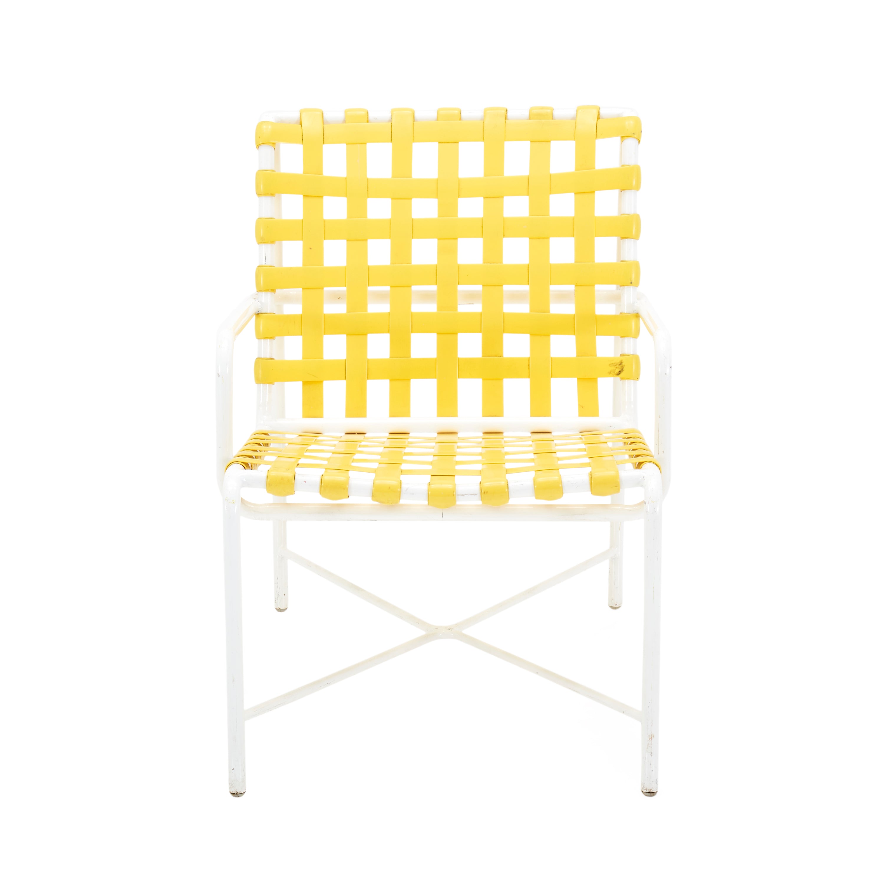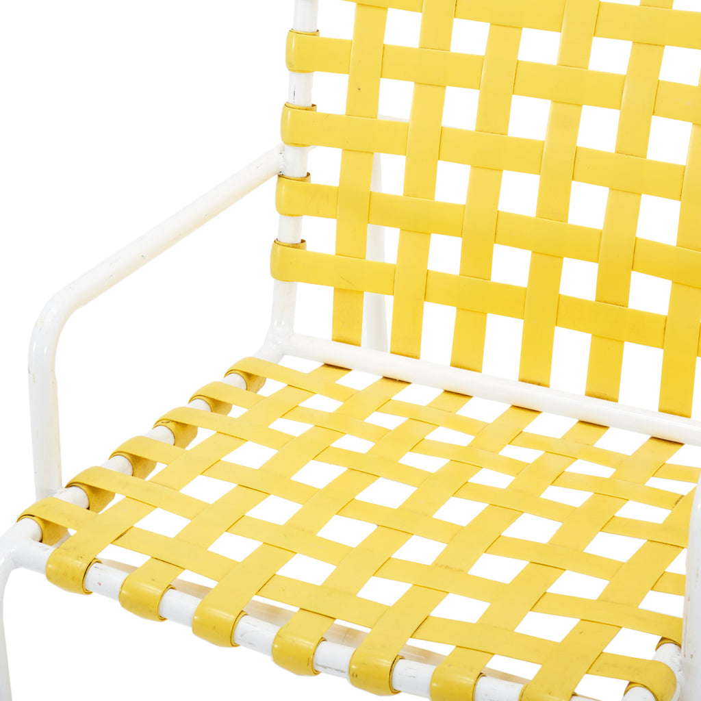 Details: Yellow vinyl strap outdoor arm chair with white metal frame.
