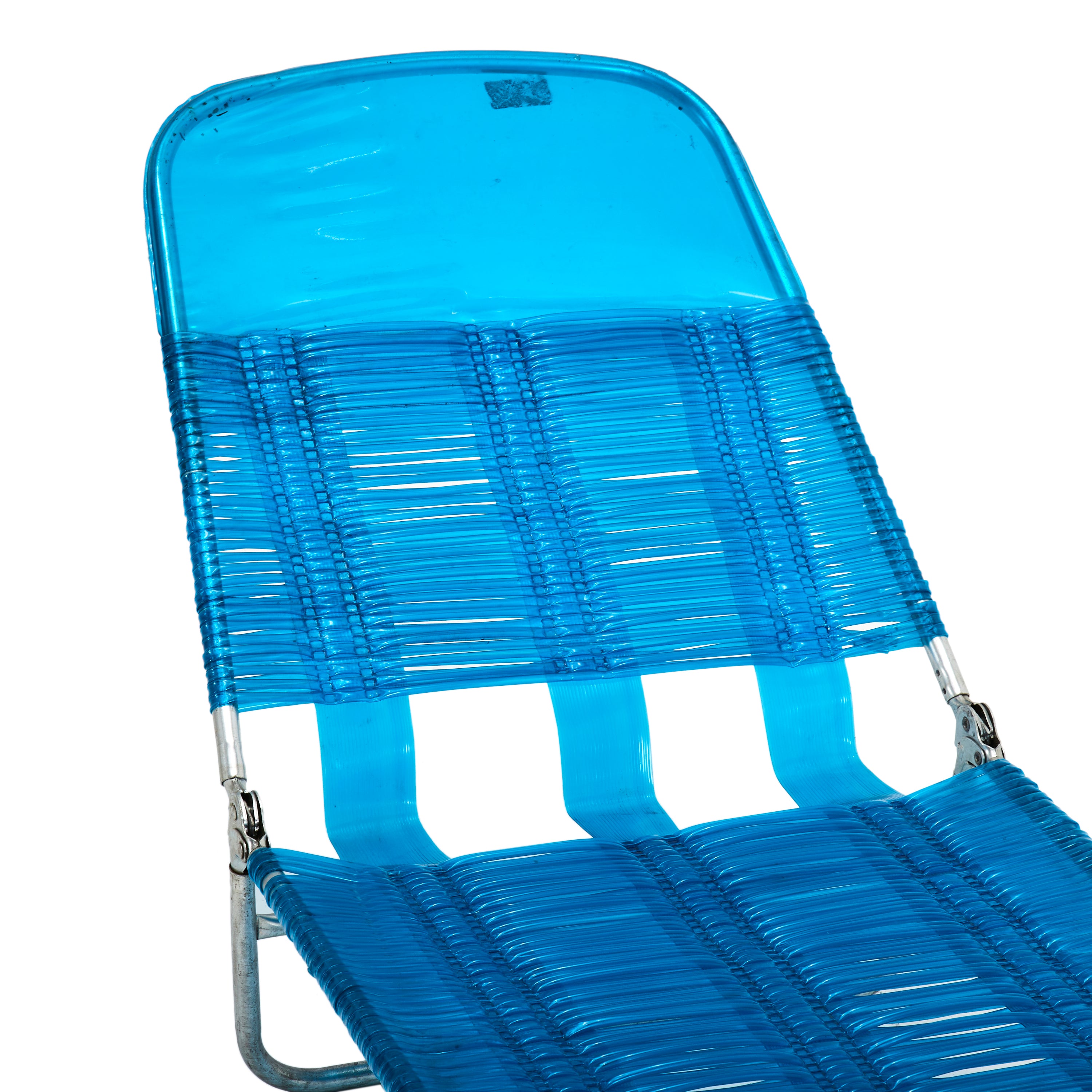 Descriptions: Classic blue plastic lounging lawn chair with folding metal base. Piece features transparent blue plastic components.