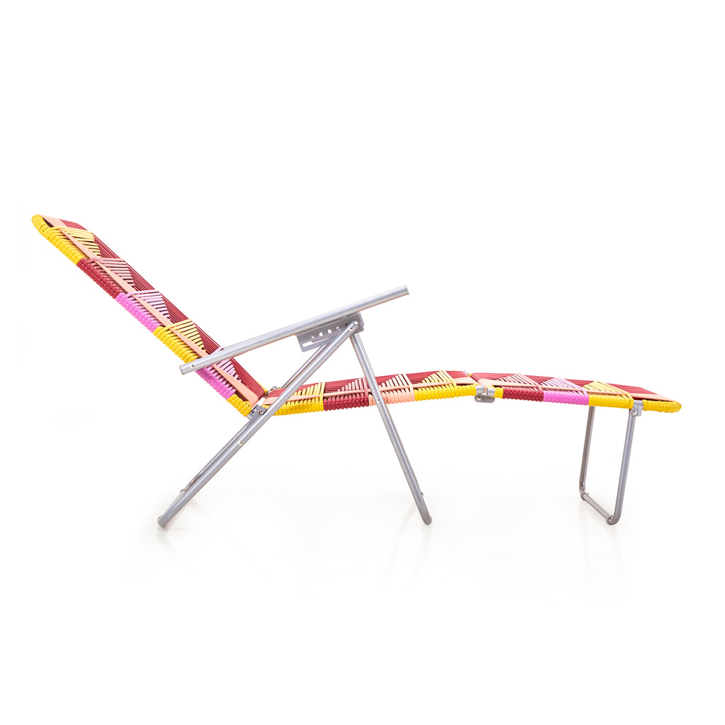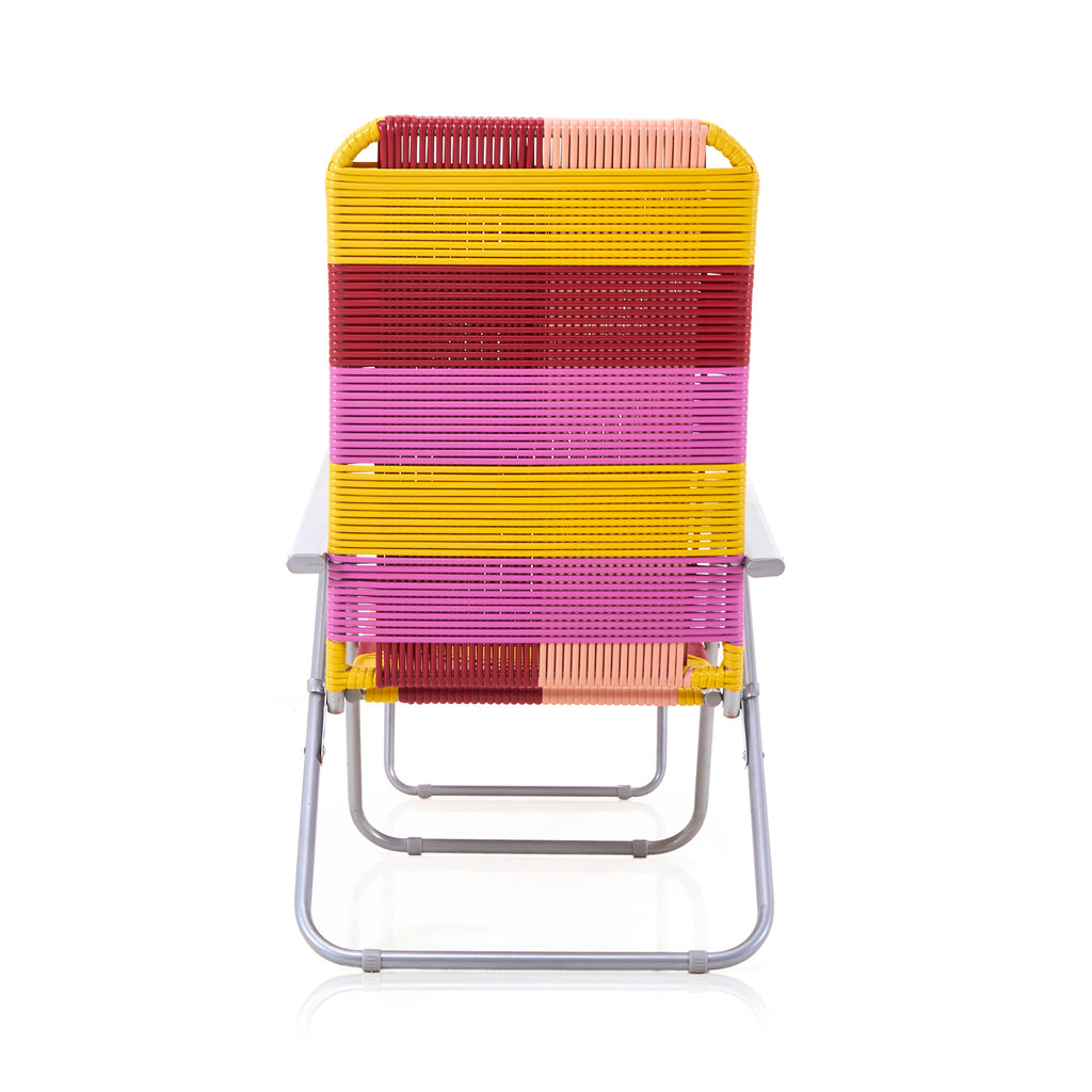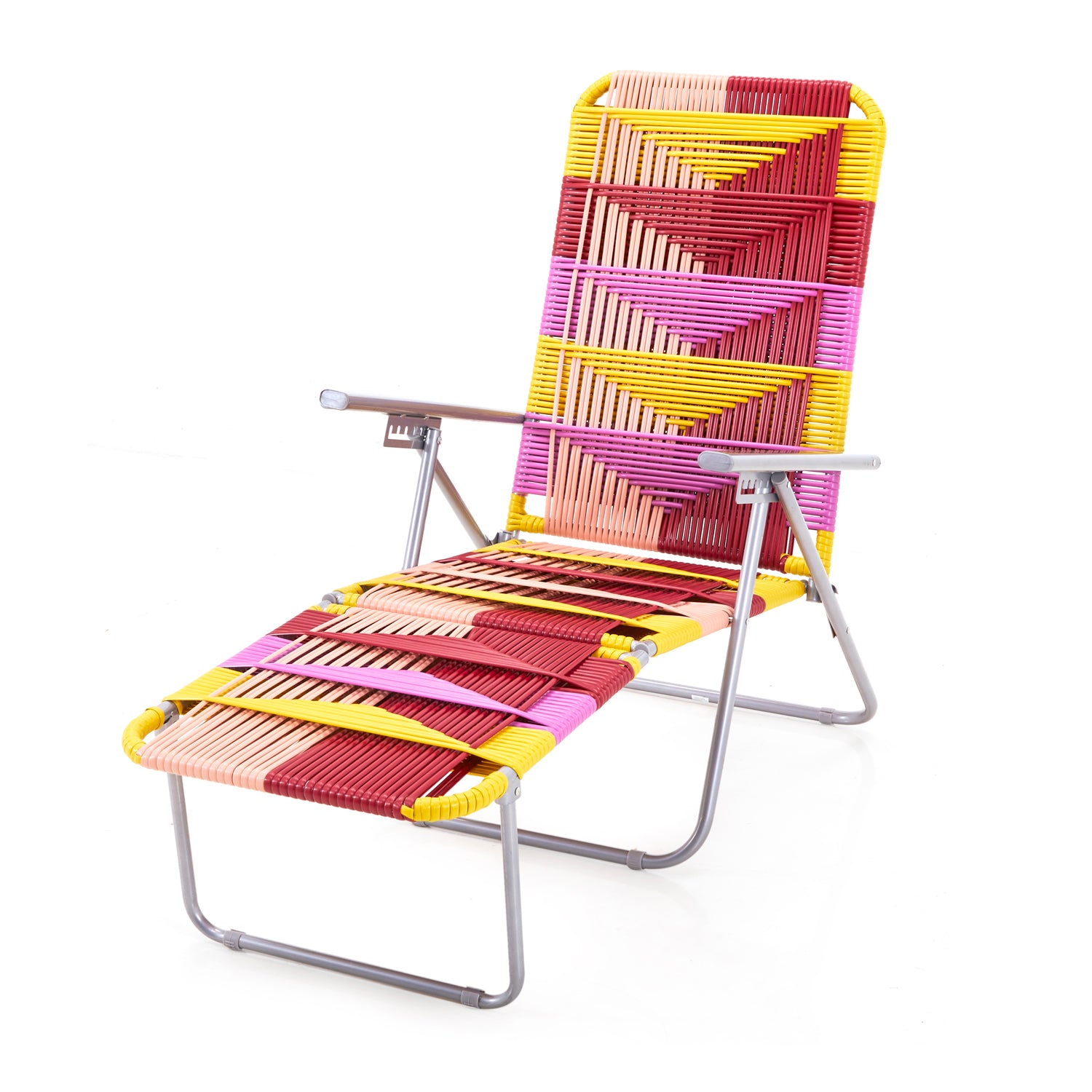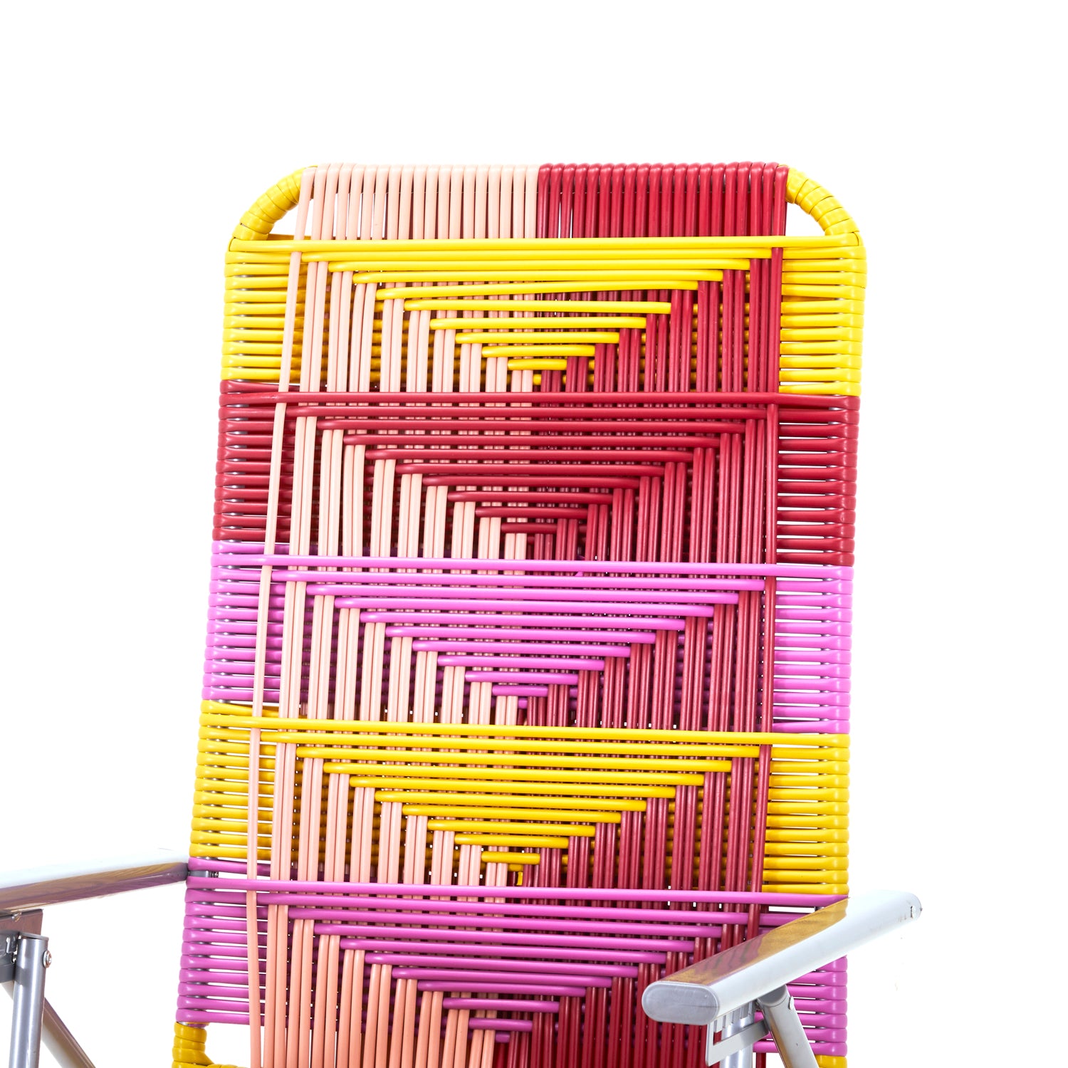 Details: Yellow, red and pink outdoor woven cord chair with triangle pattern, with aluminum folding frame *matching ottoman available, please specify if you want to add* Dimensions:...
