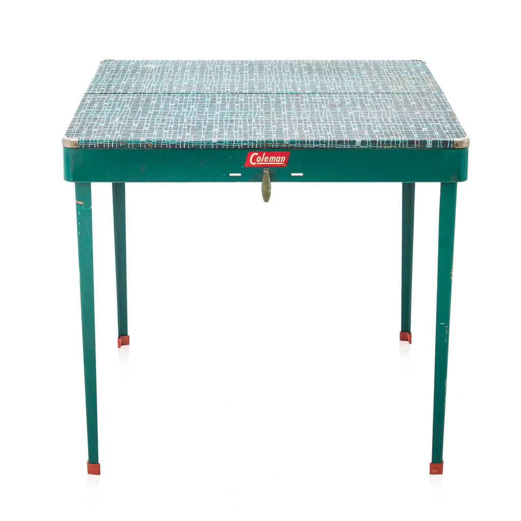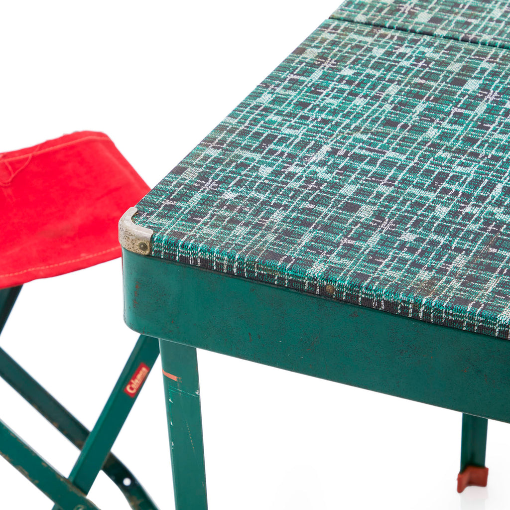 Details: Foldable green vinyl Coleman table with foldable stools that fit inside table for easy transport Dimensions: 27" H x 28" W x 28" D Quantity:...