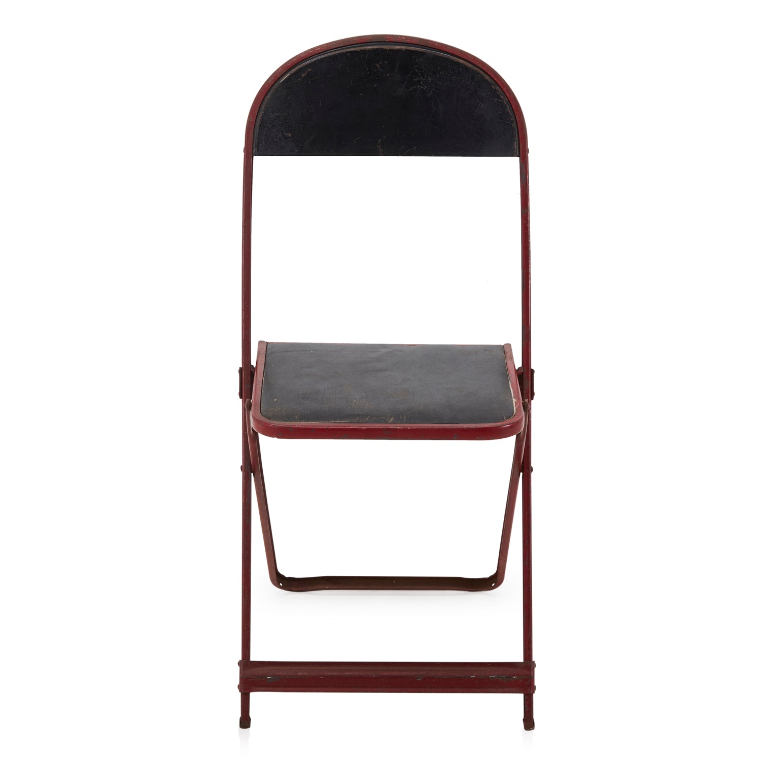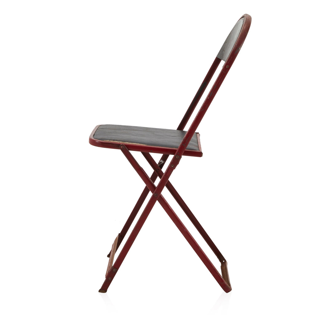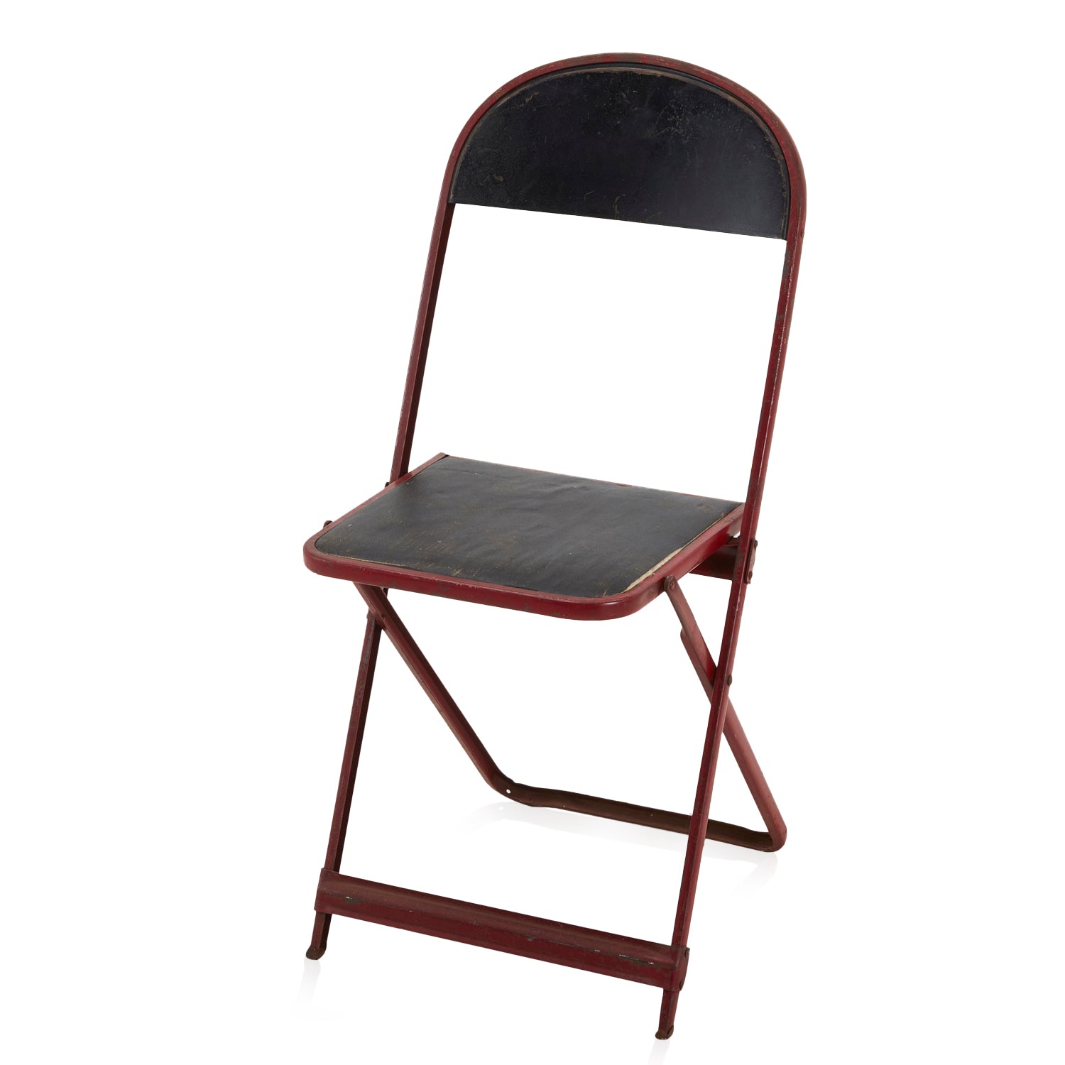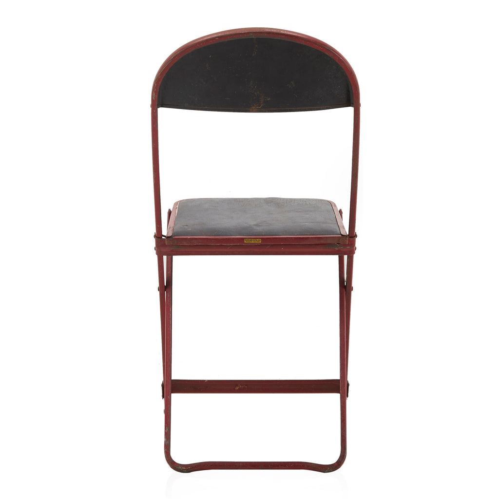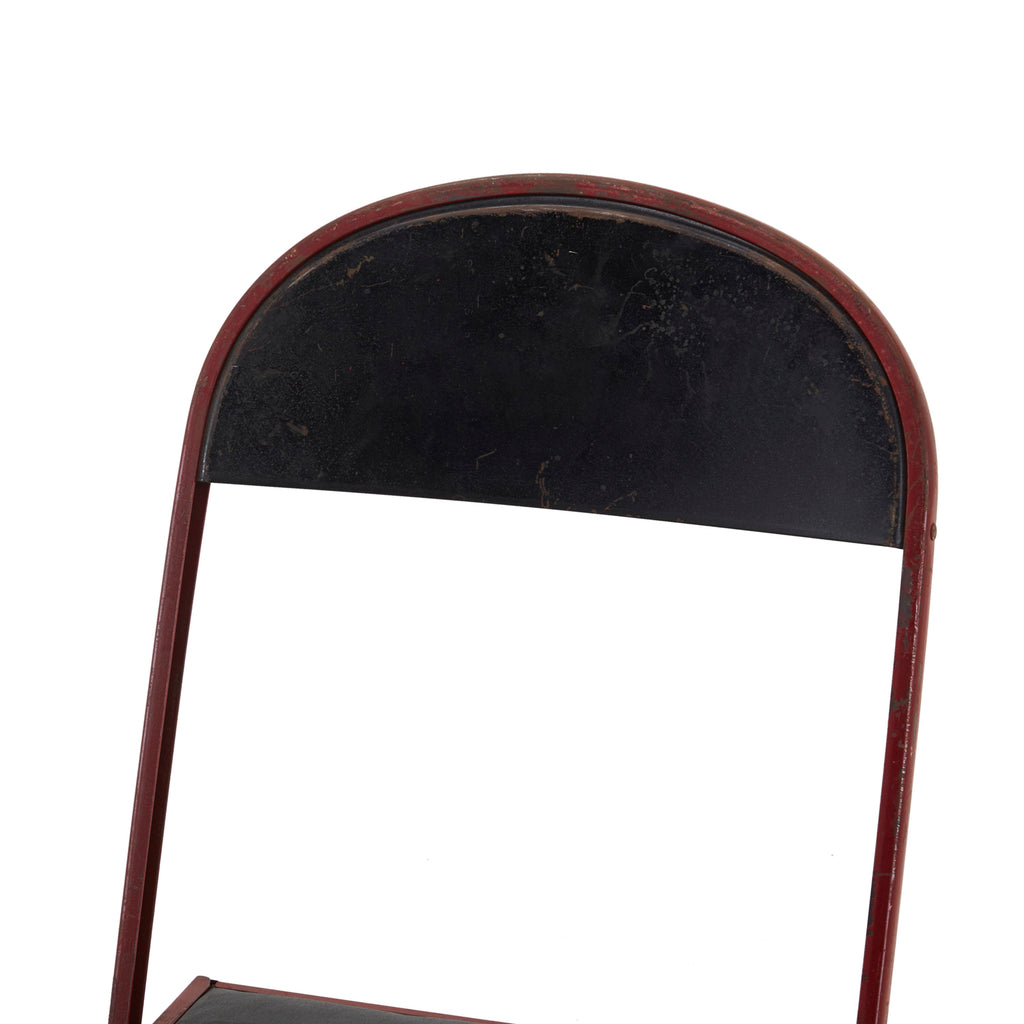 Details: Vintage red metal folding card table chair with black vinyl seat + back rest Dimensions: 31" H x 16" W x 19" D Quantity: 2