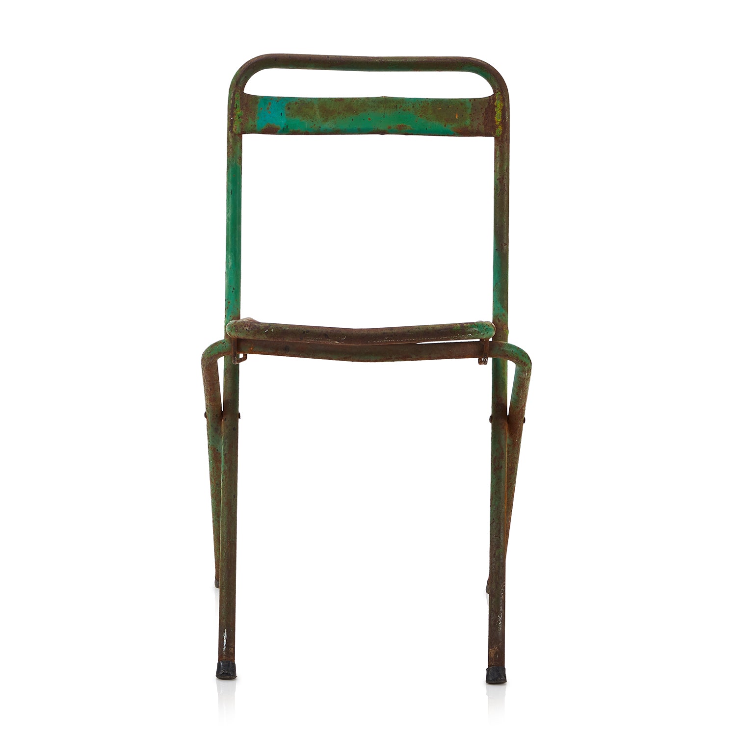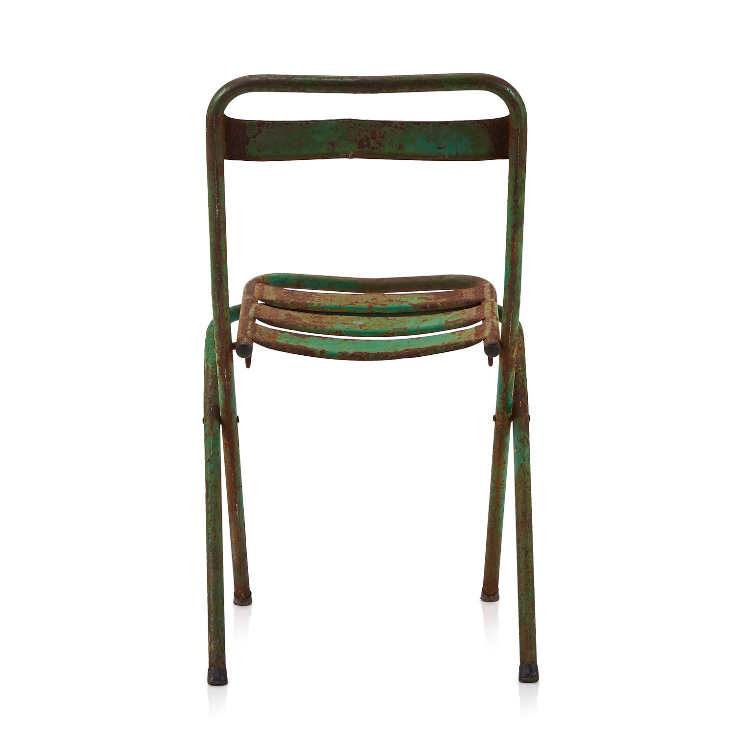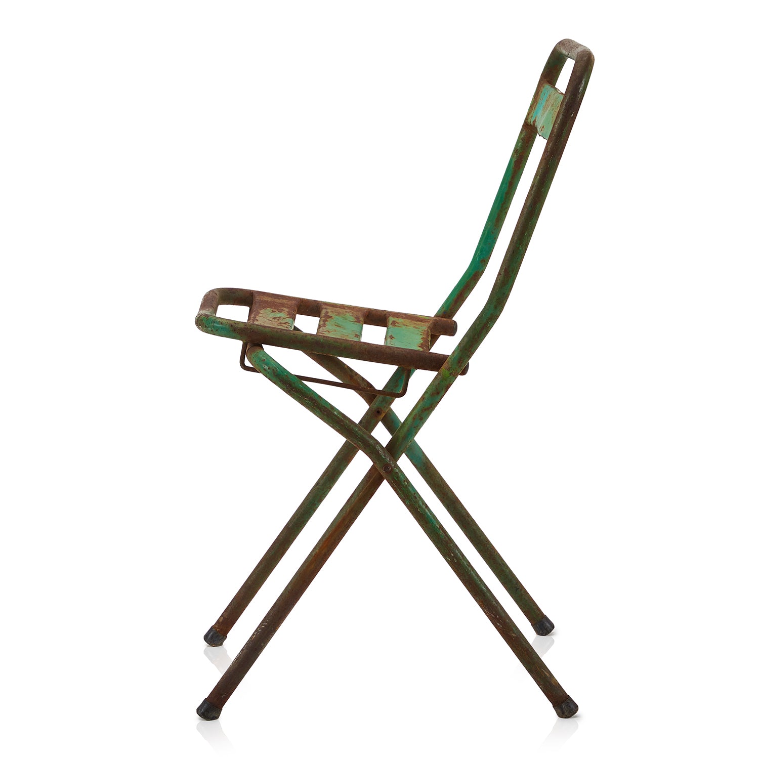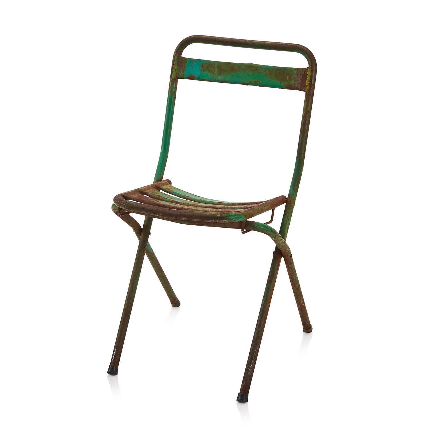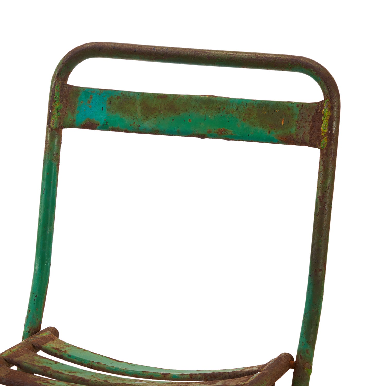 Details: Vintage metal folding chair with rusted green paint Dimensions: 31" H x 15" W x 18" D