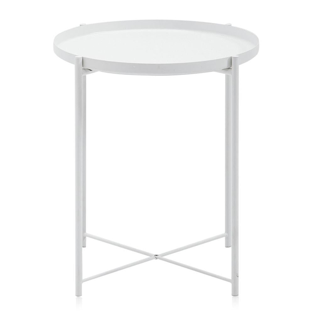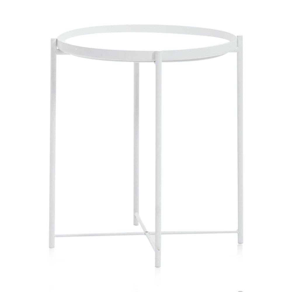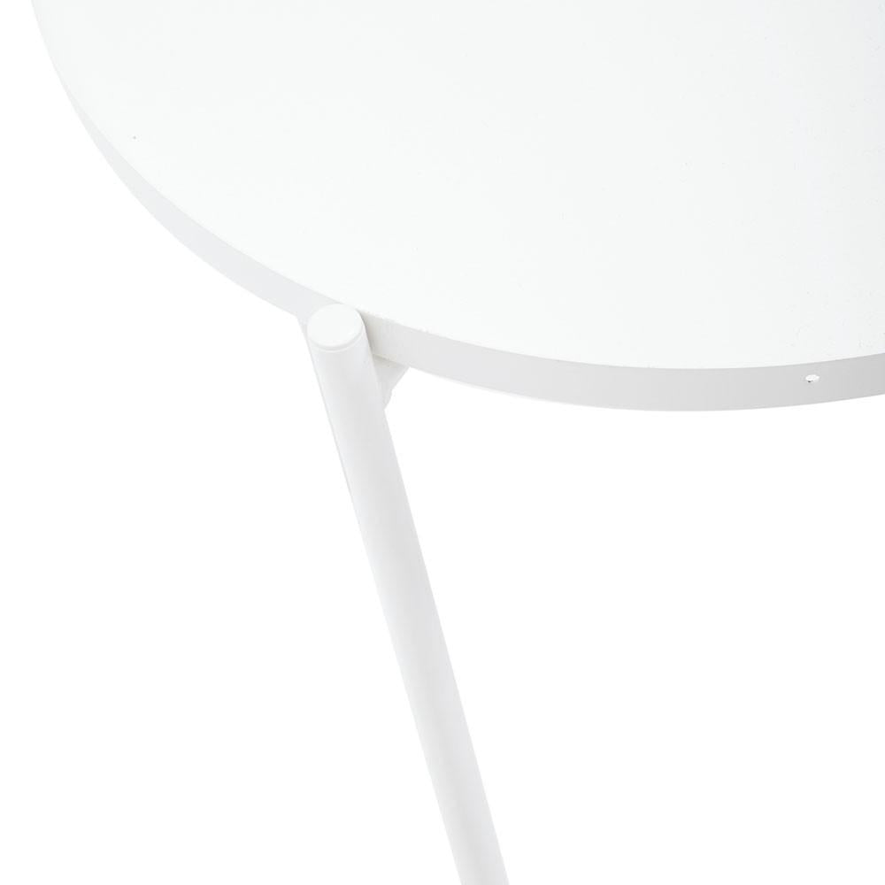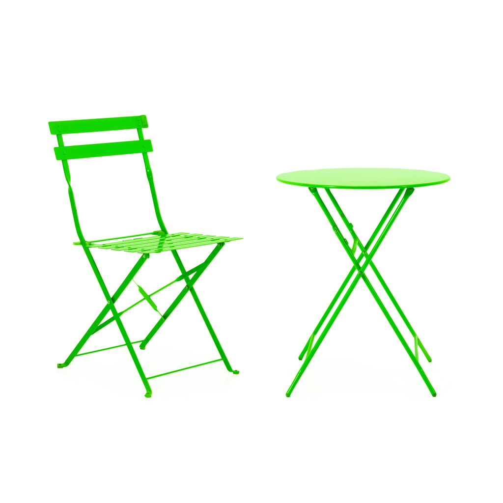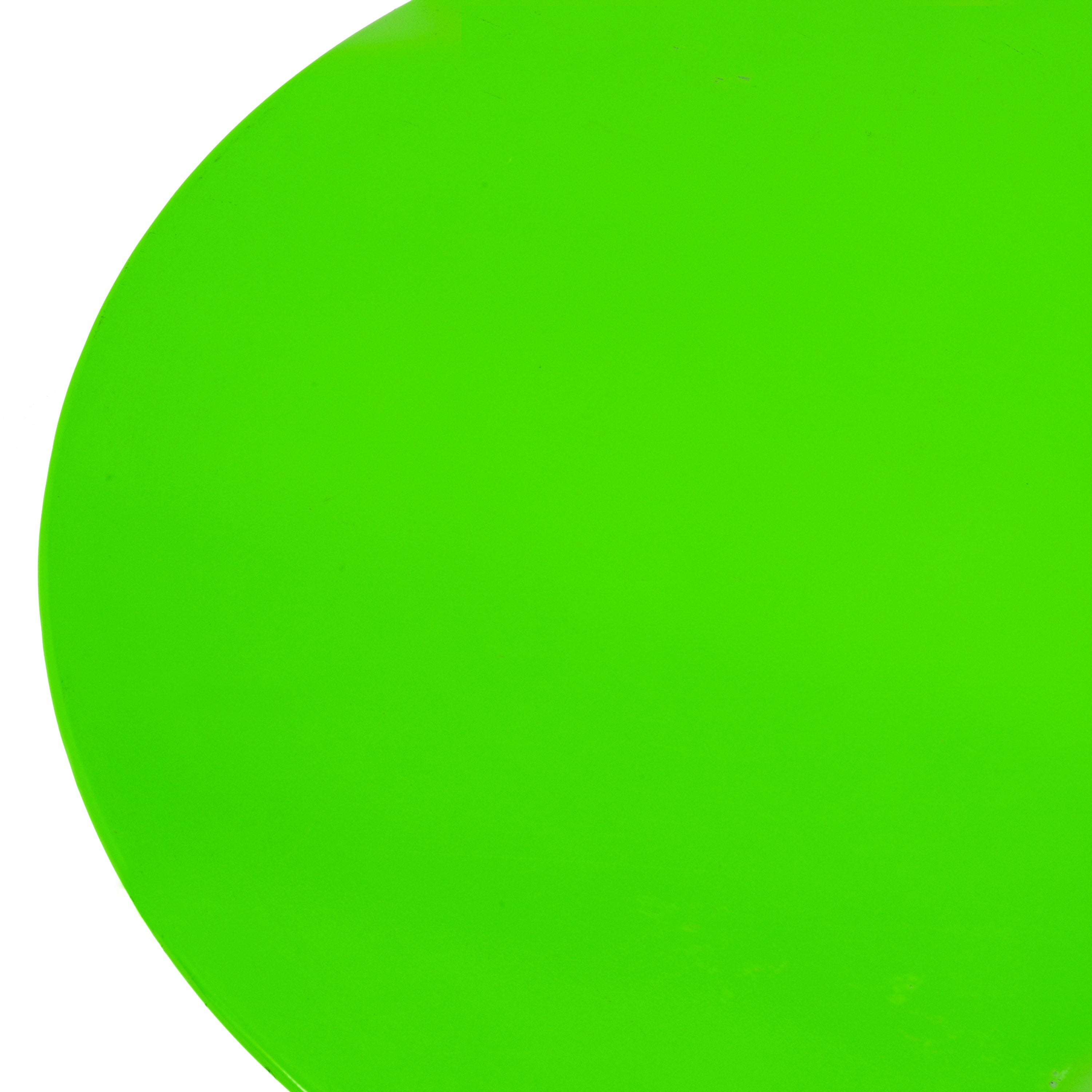 Details: Green contemporary metal round outdoor table with white base (matching chairs available and rented separately) Dimensions: 29" H x 42" W x 42" D