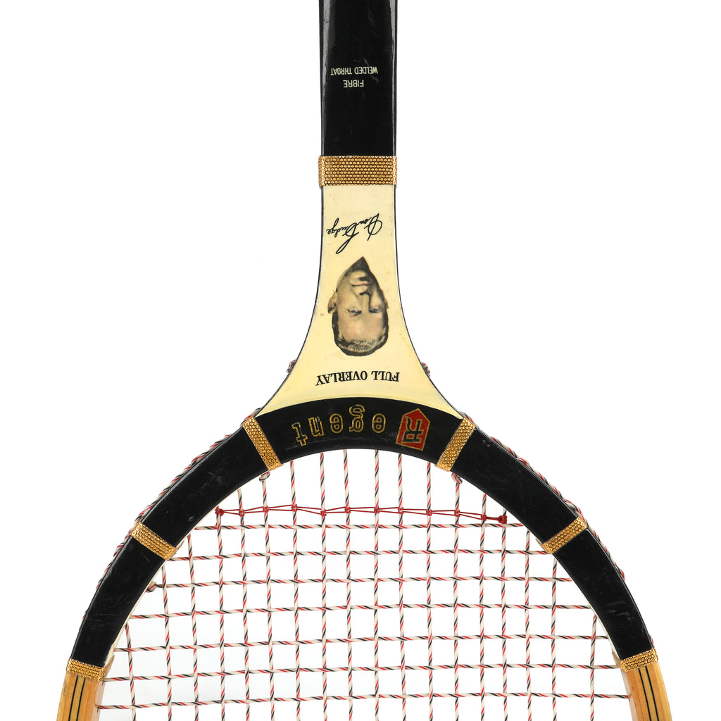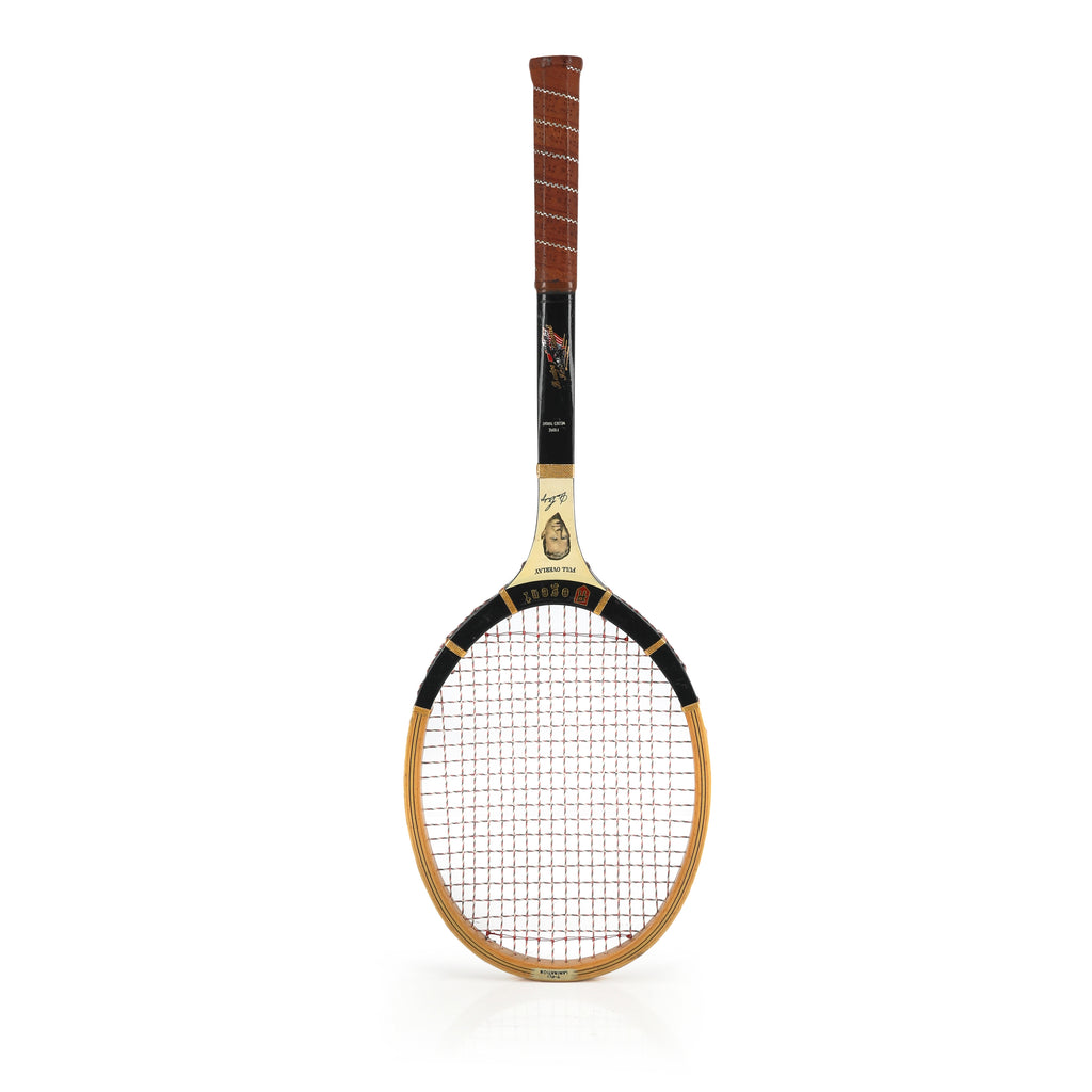 Details: Cream & wood w/ brown leather handle tennis racket. Face printed on base.