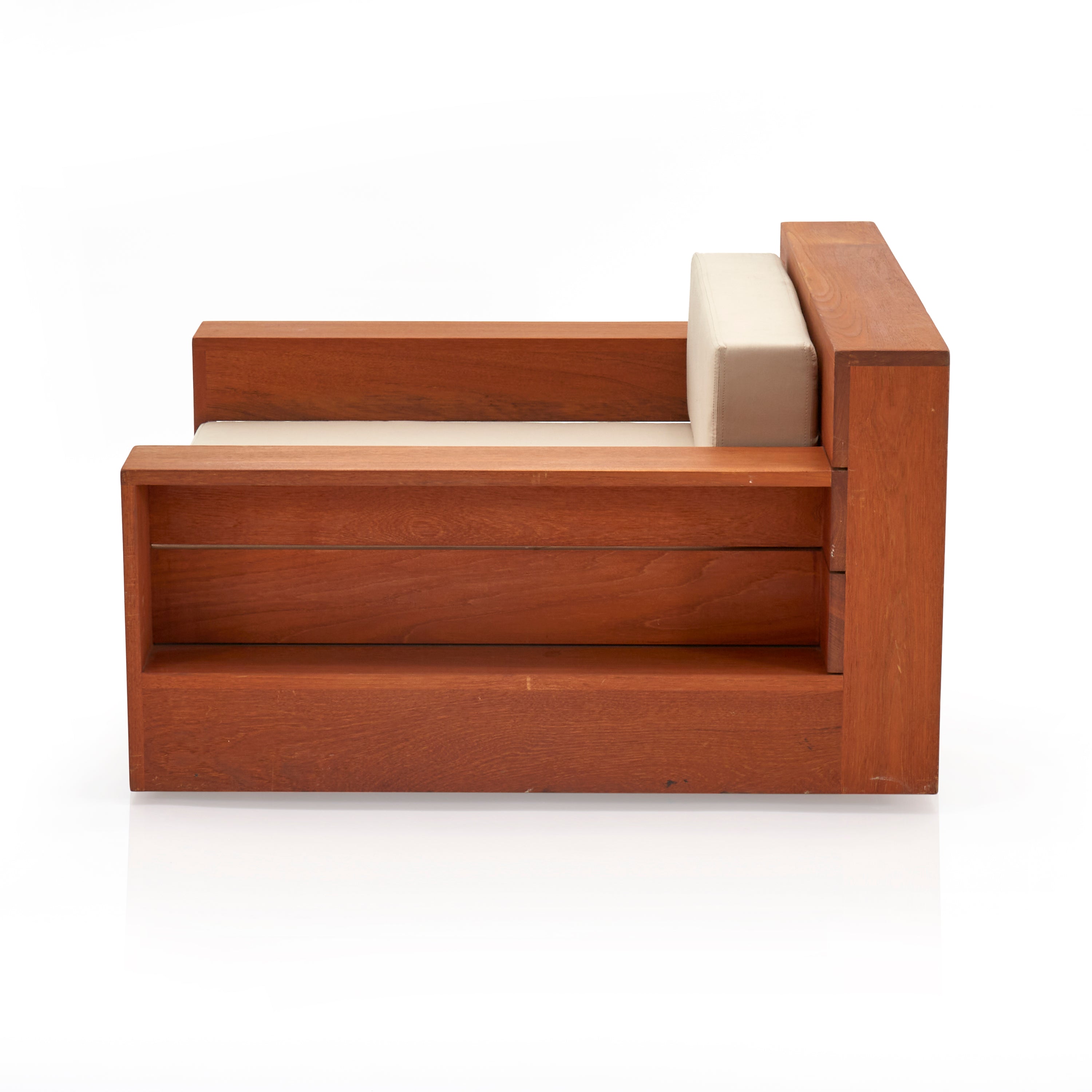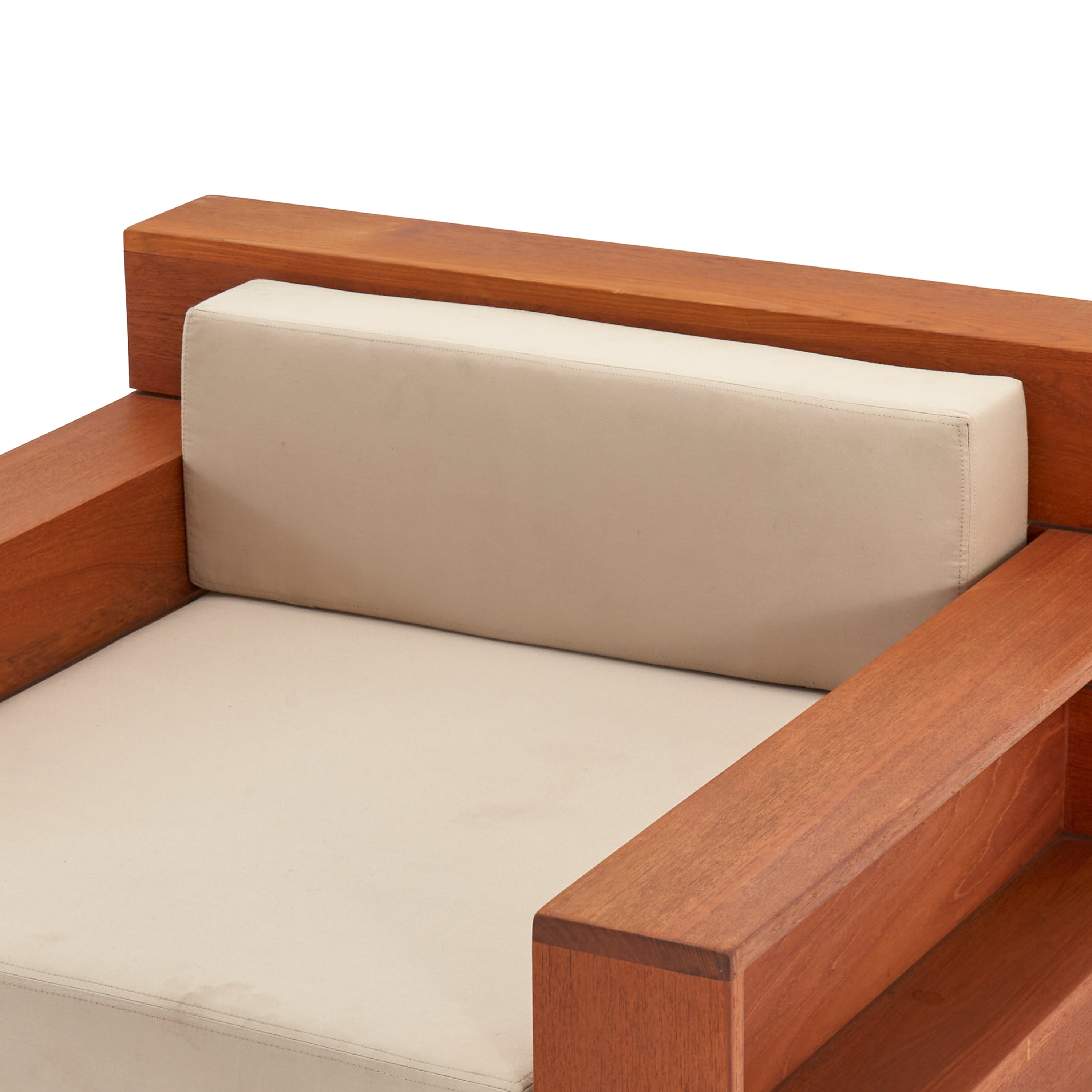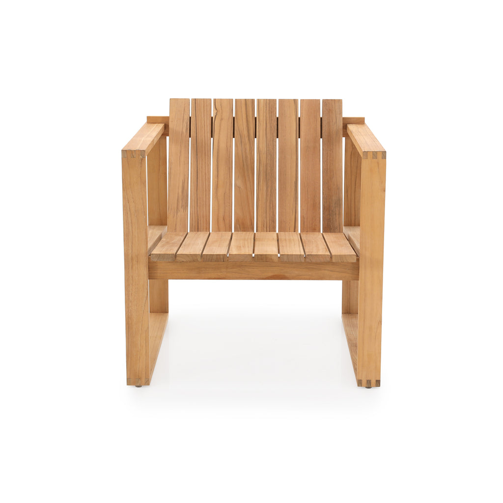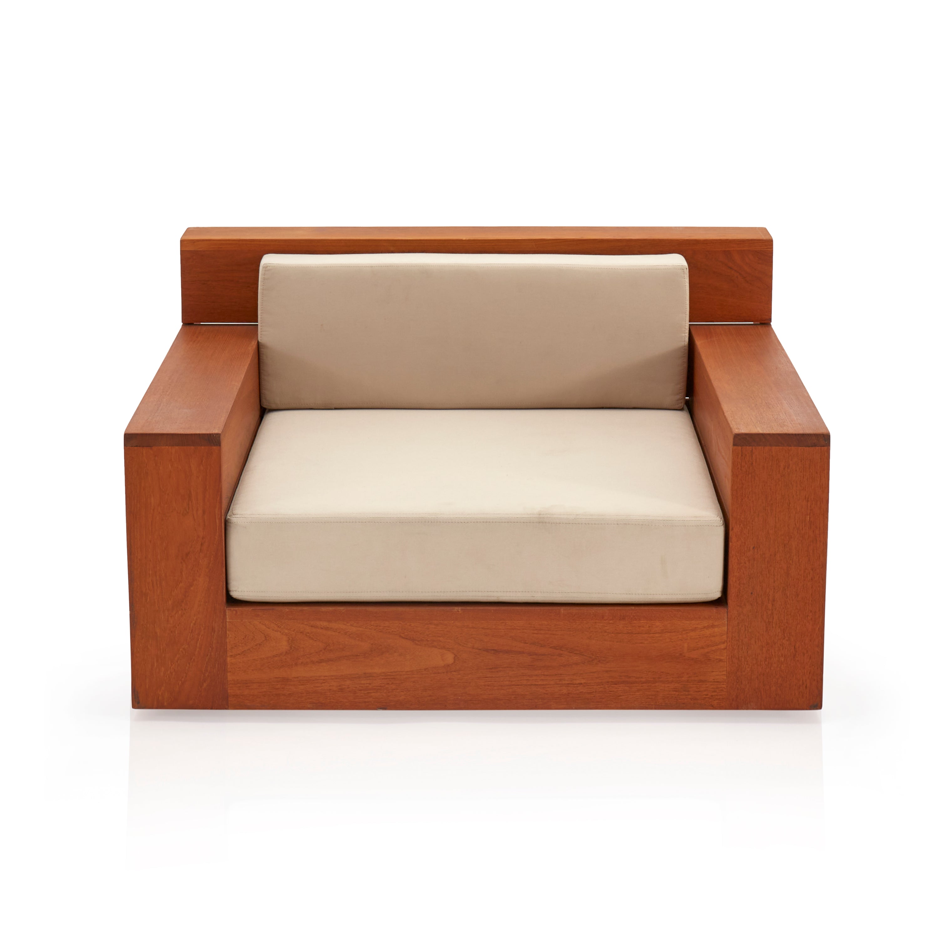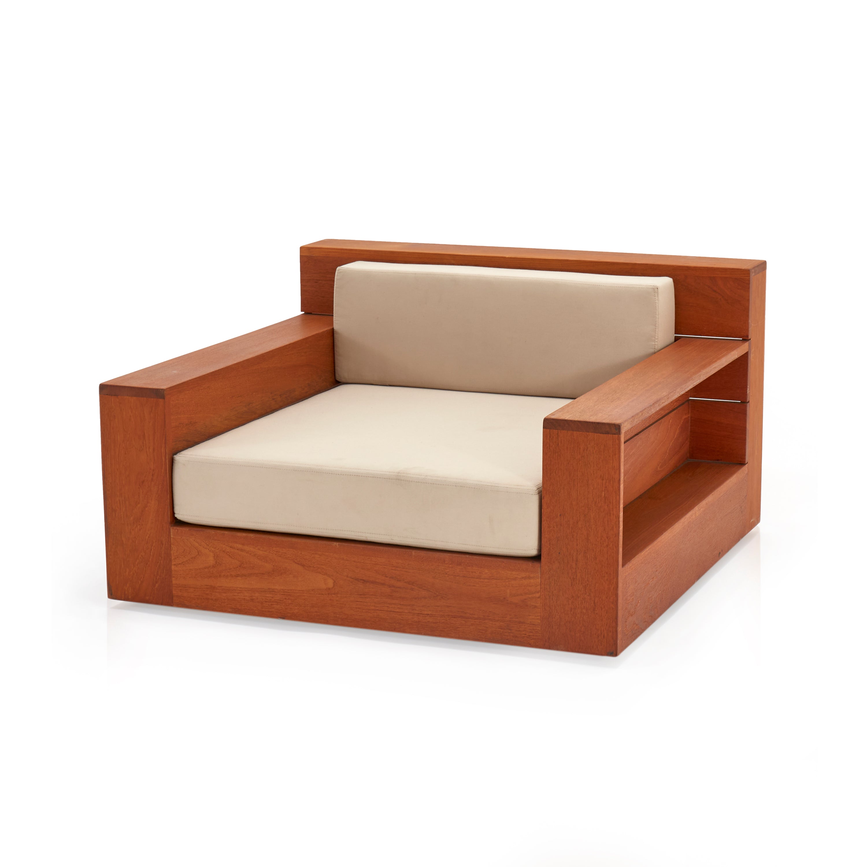 Details: Large teak outdoor lounge chair with cream cushions. Has cutout on sides and back for storage Dimensions: 22" H X 39" W X 39"...