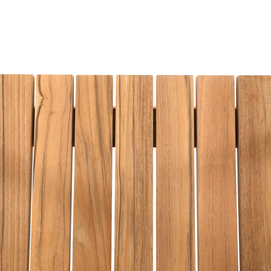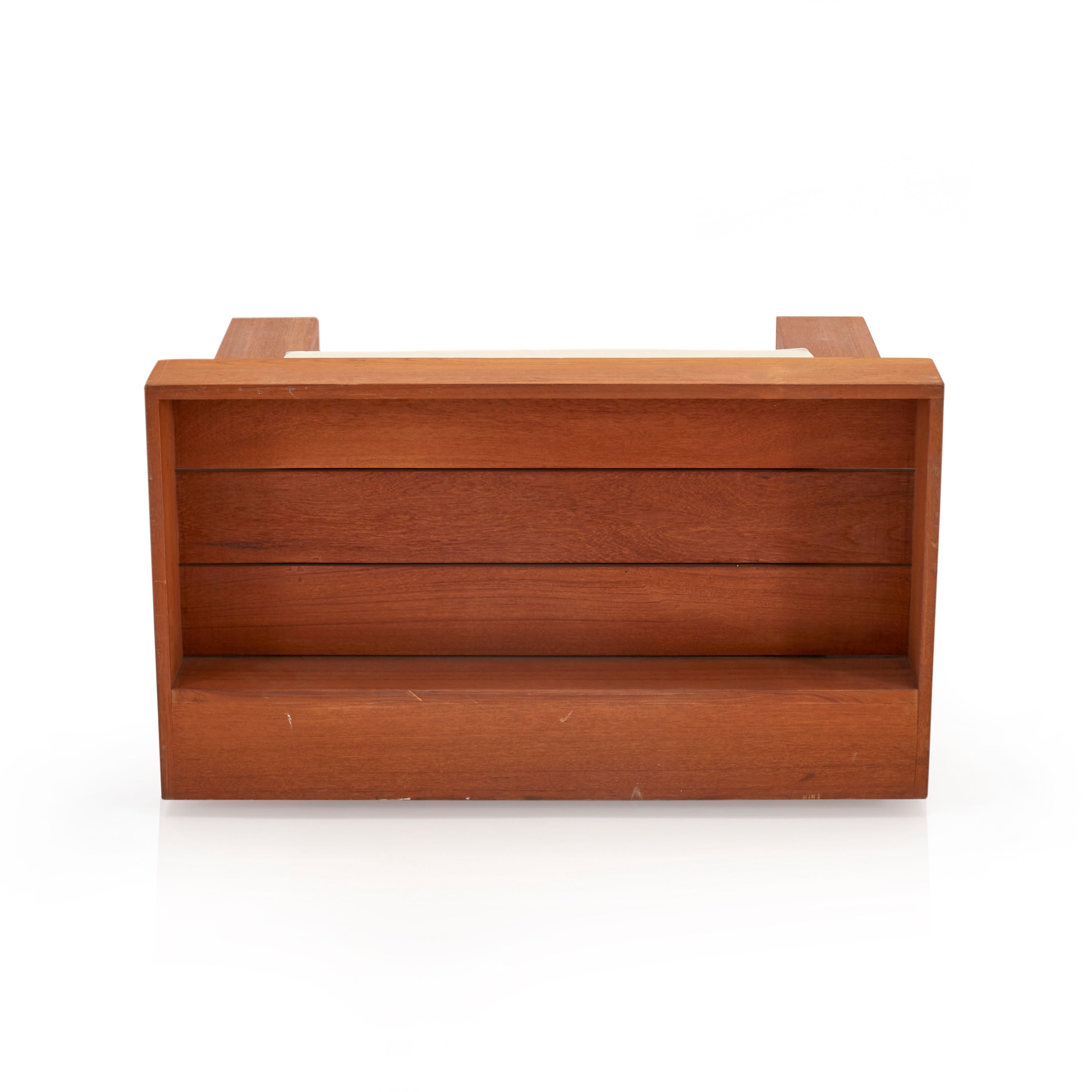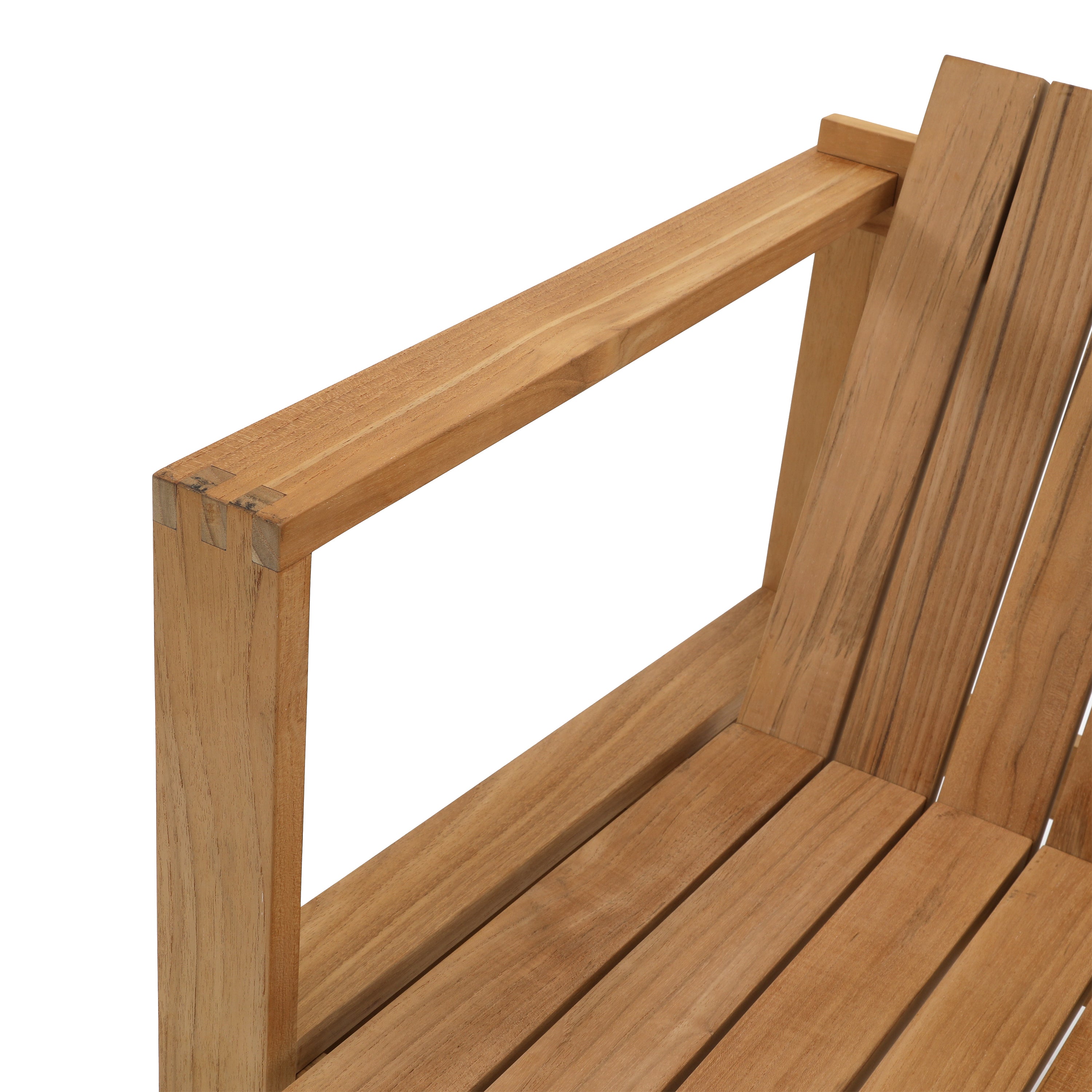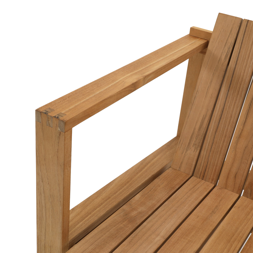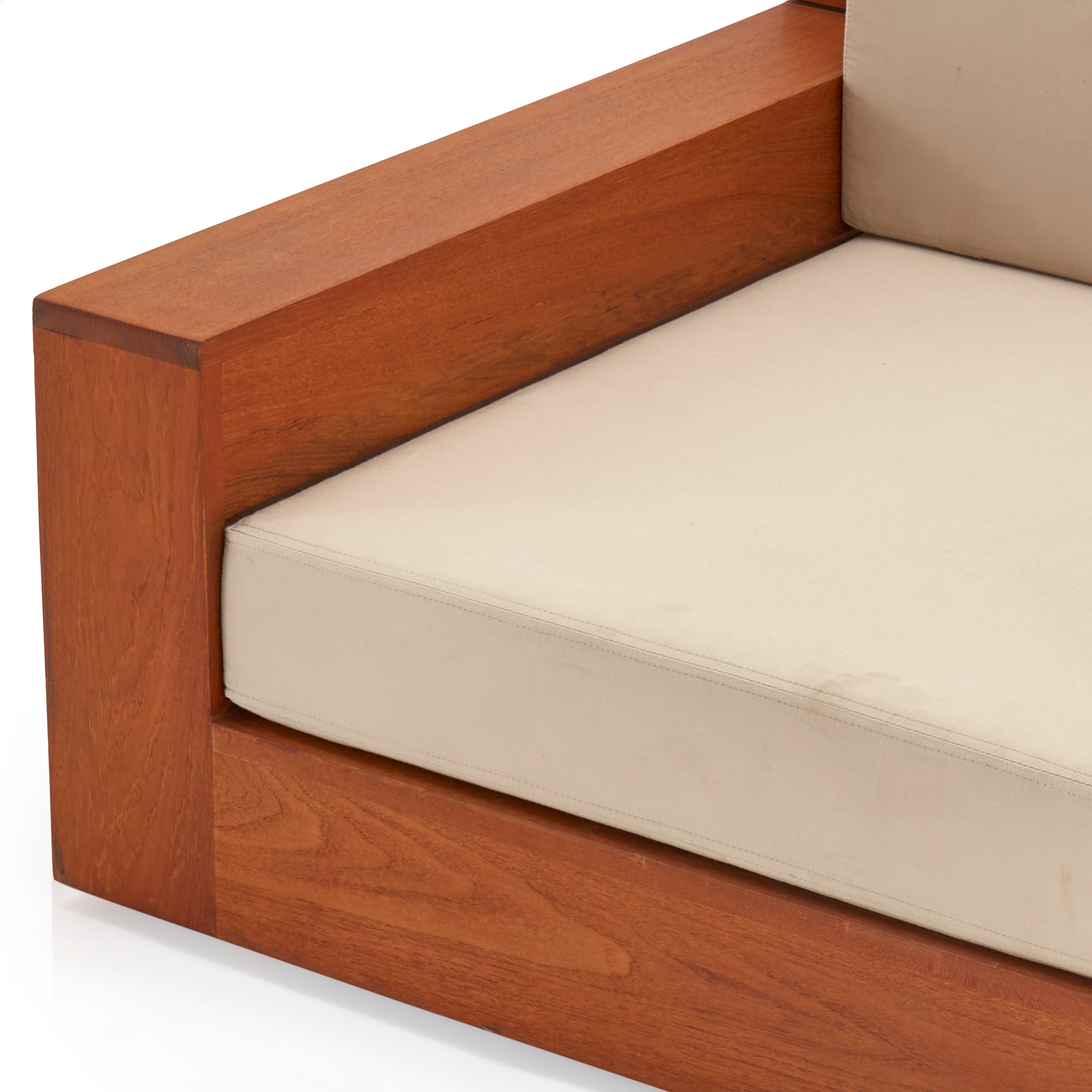 Details: Large teak outdoor lounge chair with cream cushions. Has cutout on sides and back for storage Dimensions: 22" H X 39" W X 39"...