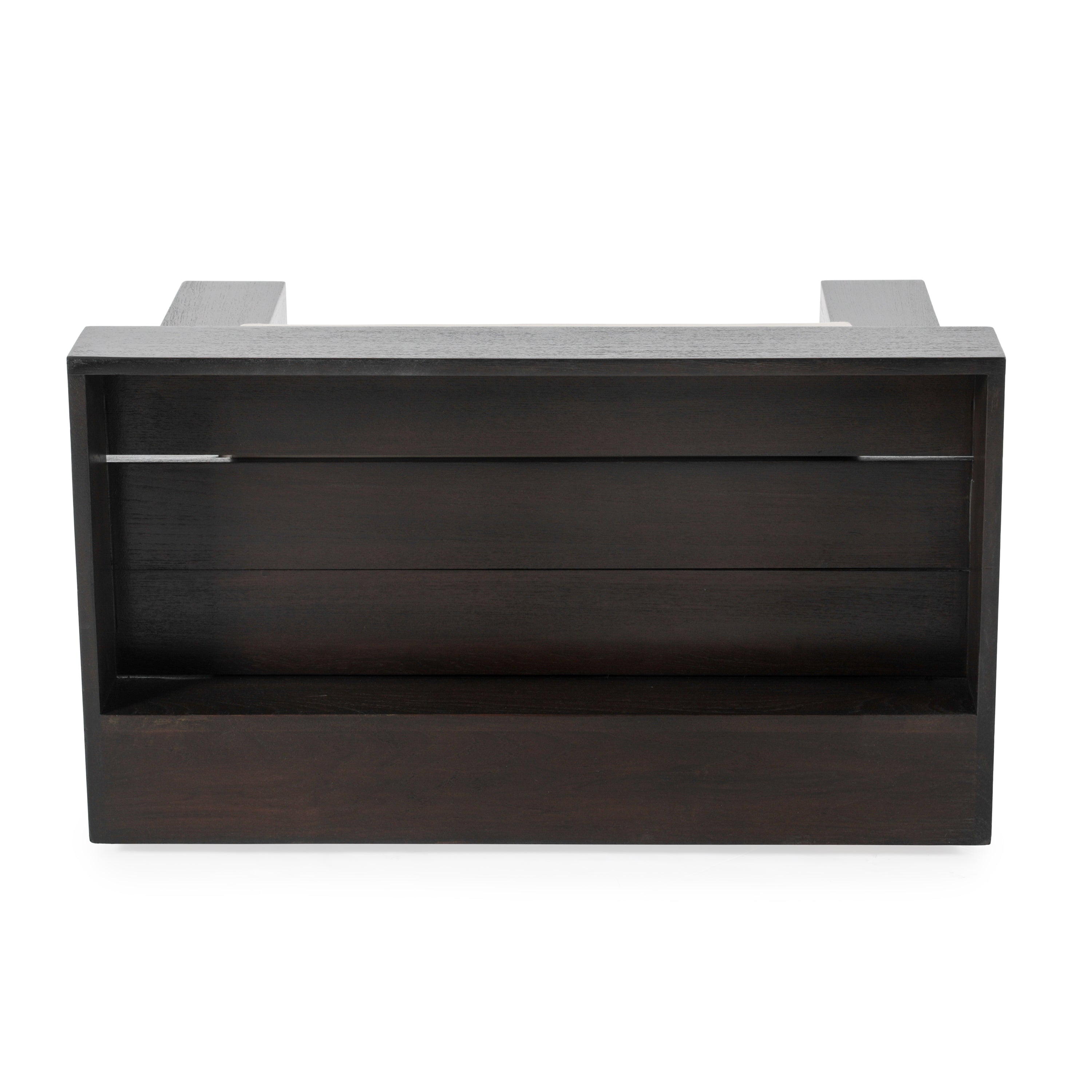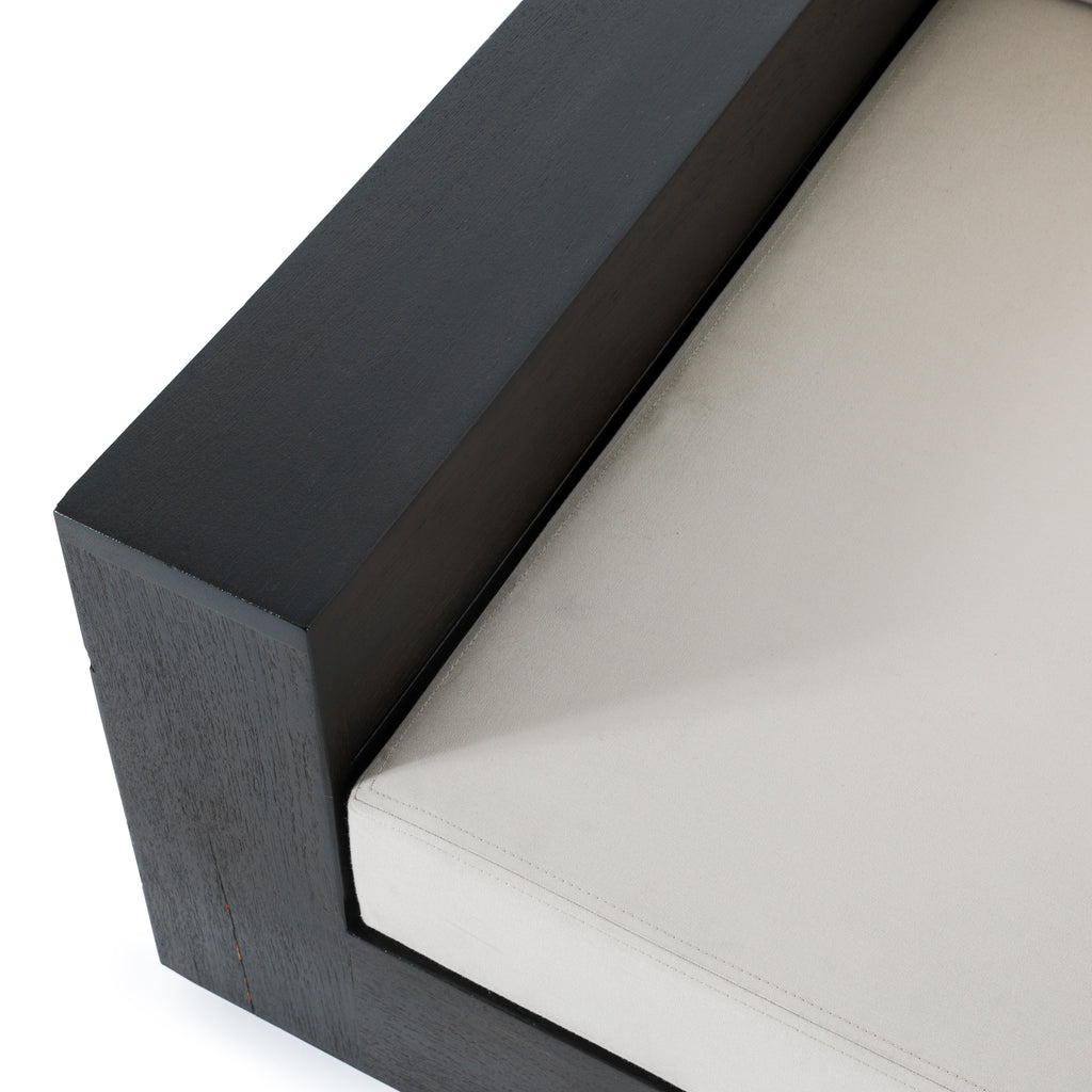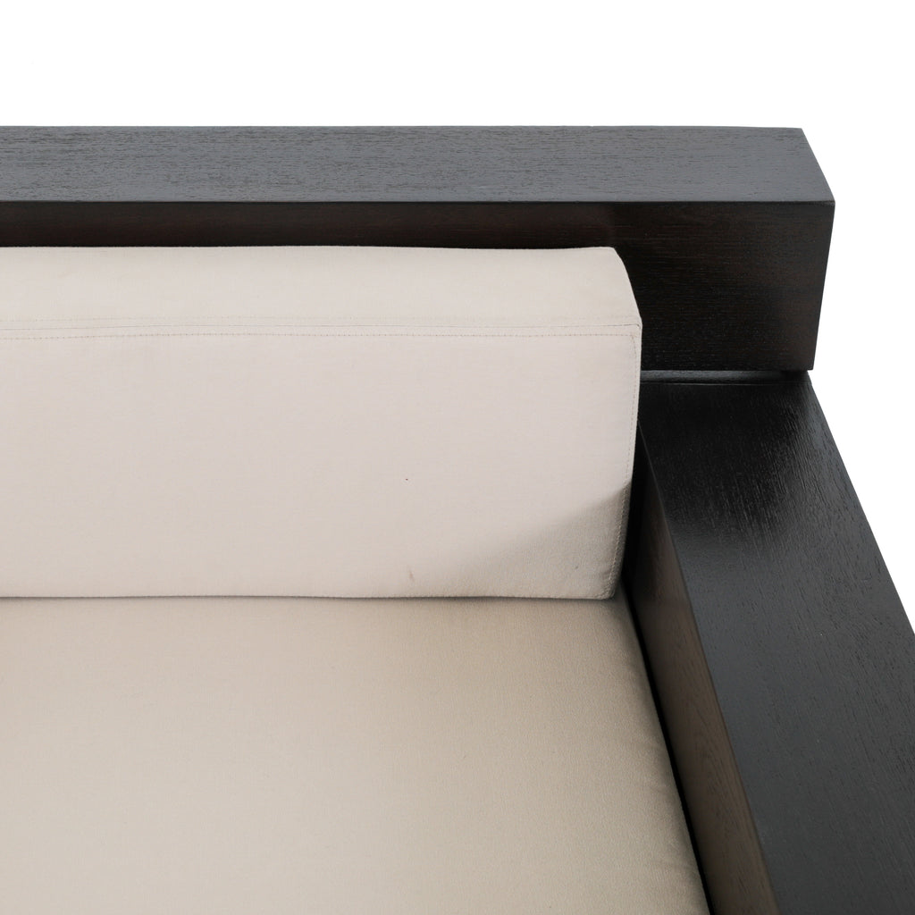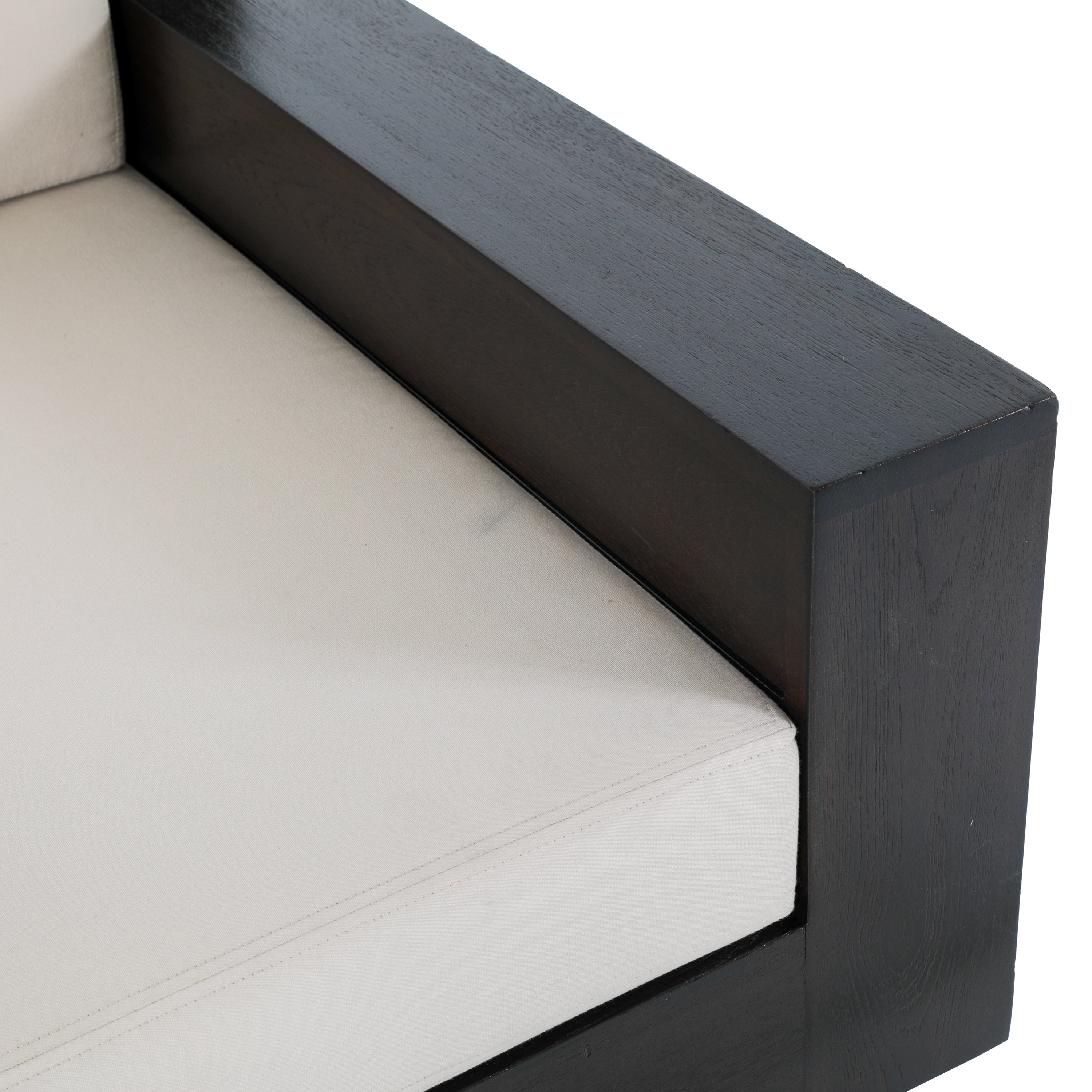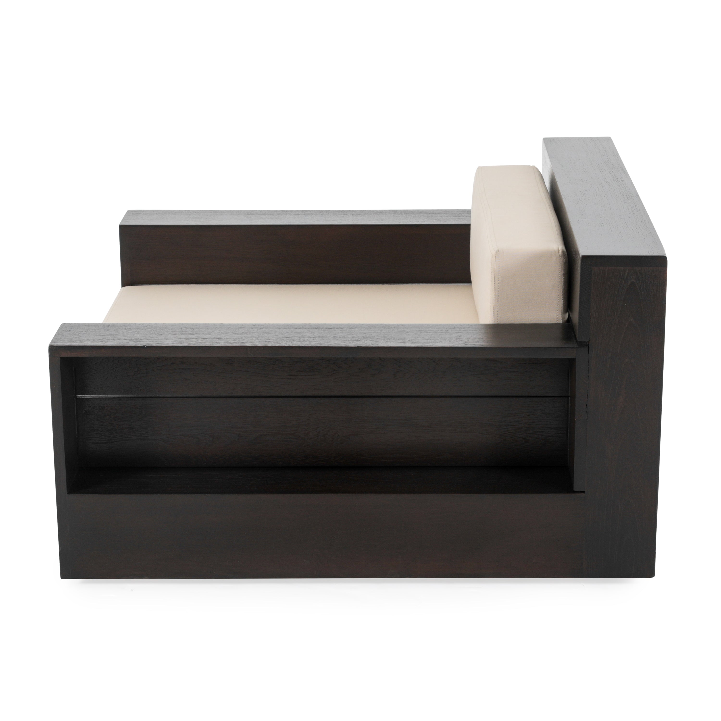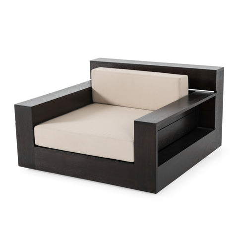 Details: Large dark wood outdoor lounge chair with cream cushions. Has cutout on sides and back for storage Dimensions: 22" H X 39" W X...