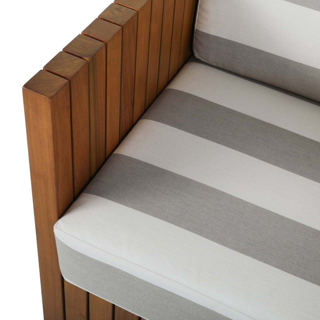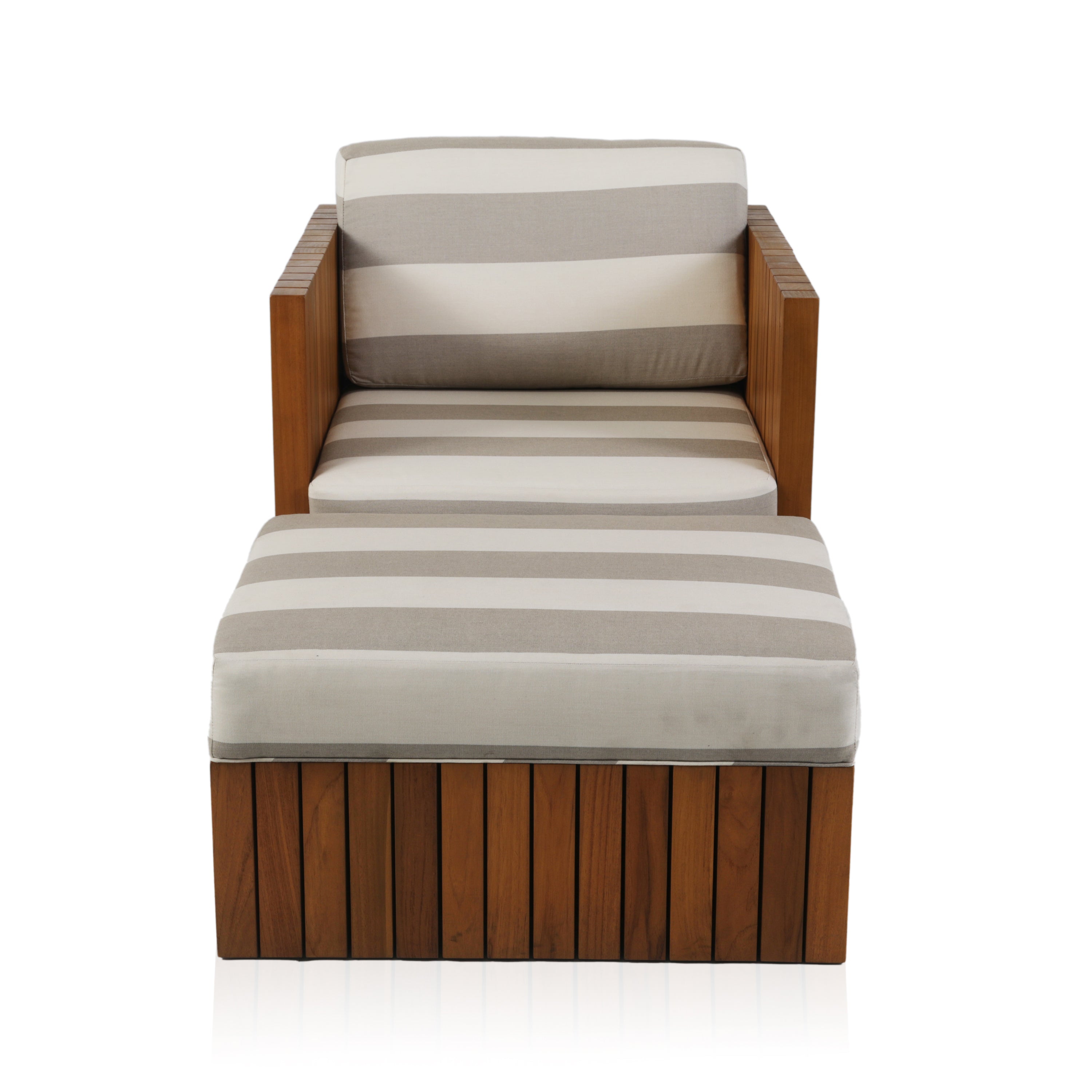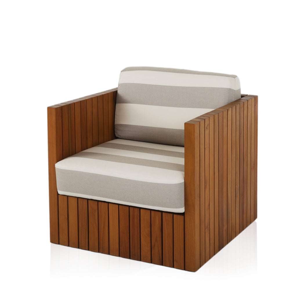 Details: Grey and white striped outdoor lounge chair with teak exterior. Matching ottoman available (rented separately). Dimensions: 27" H x 30" W x 32" D...