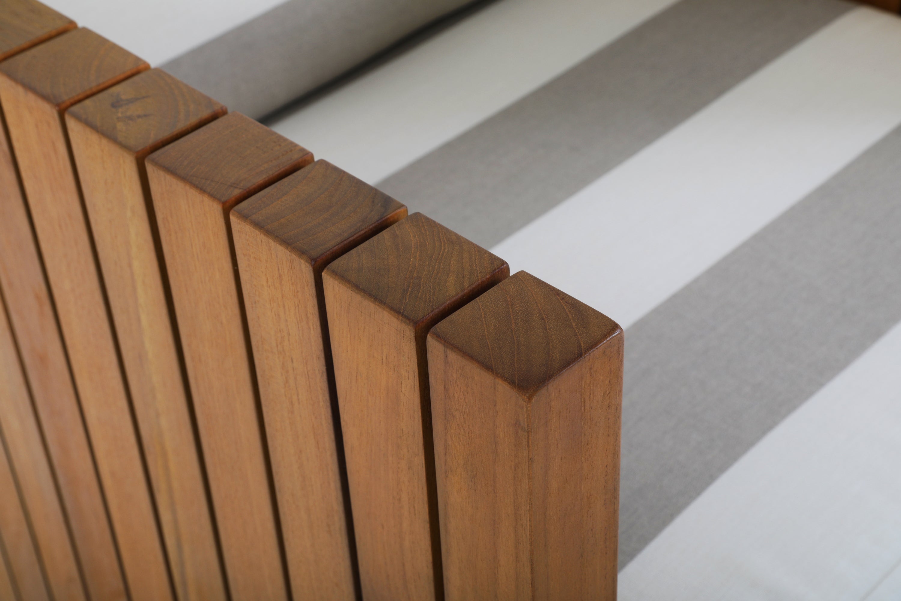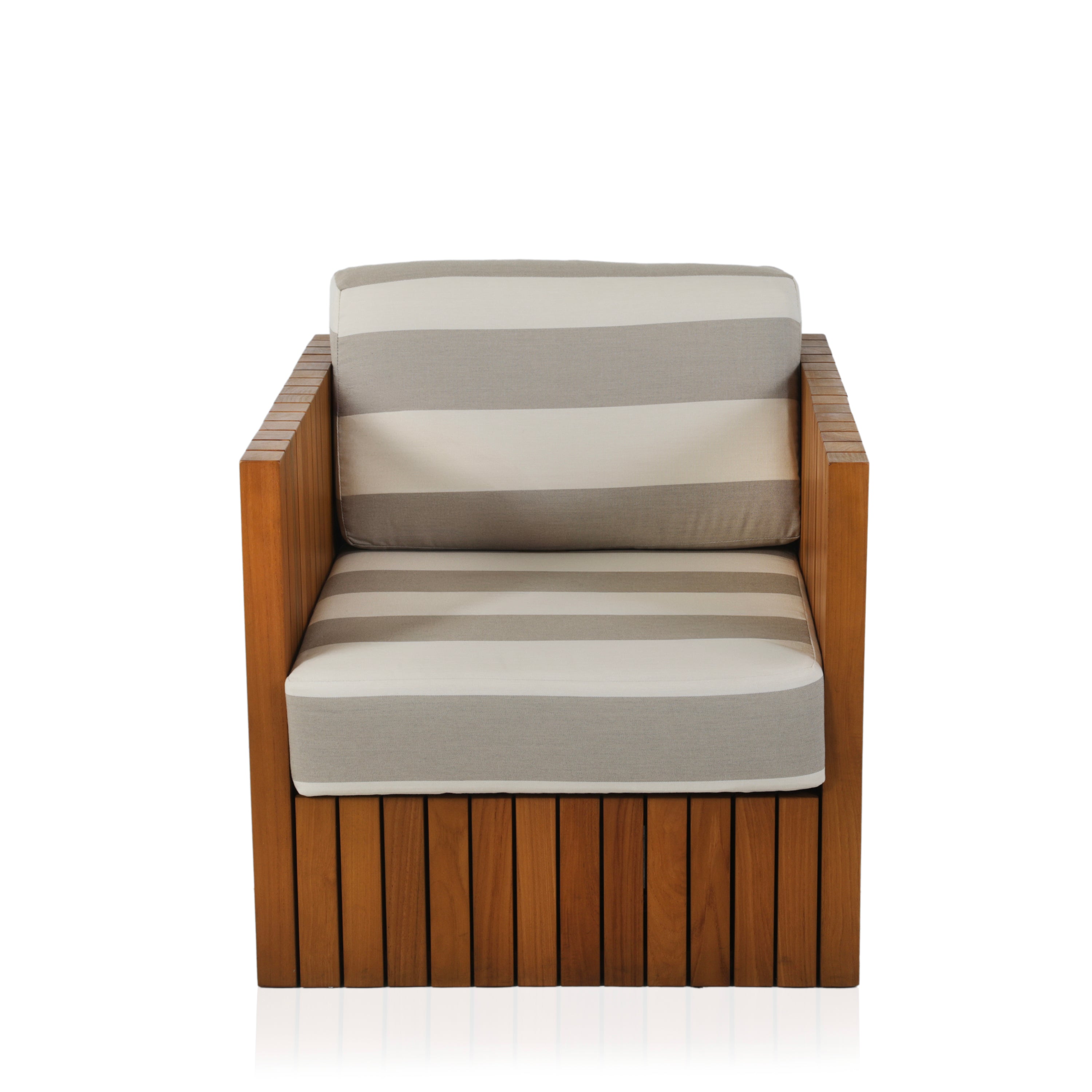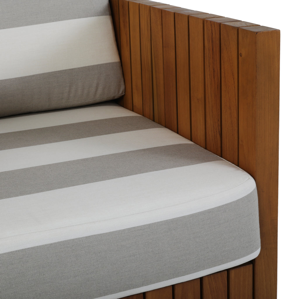 Details: Grey and white striped outdoor lounge chair with teak exterior. Matching ottoman available (rented separately). Dimensions: 27" H x 30" W x 32" D...