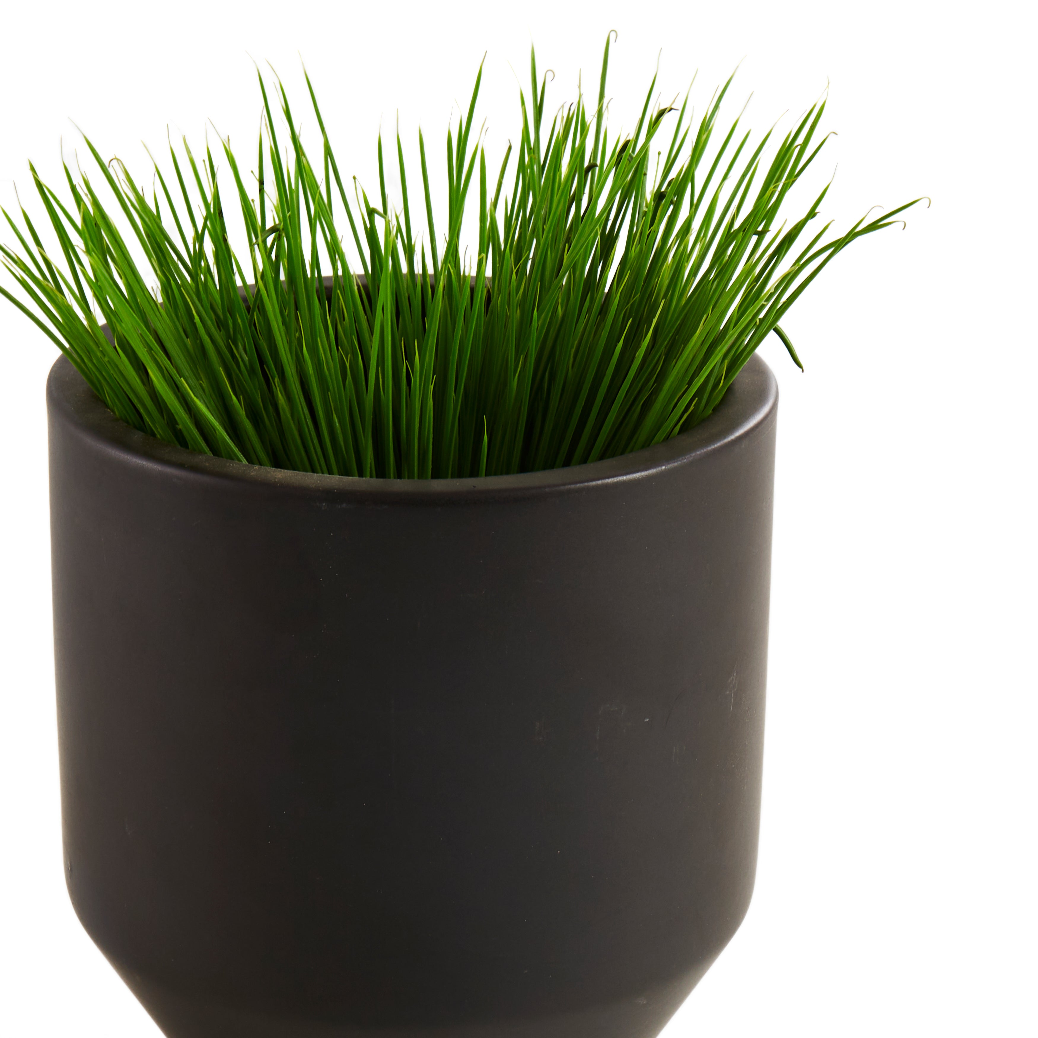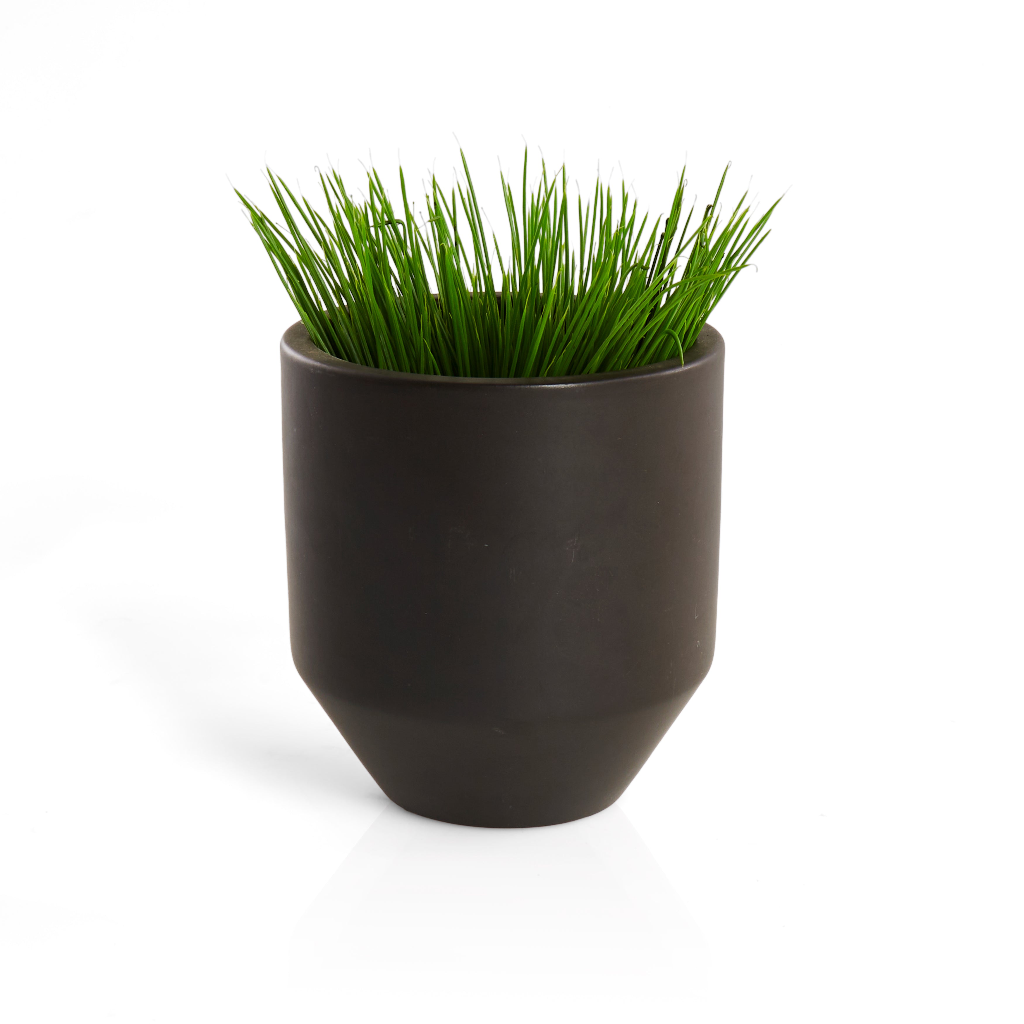 Details: Modern black/espresso ceramic pot with fake grass Dimensions: 7" H x 6" D