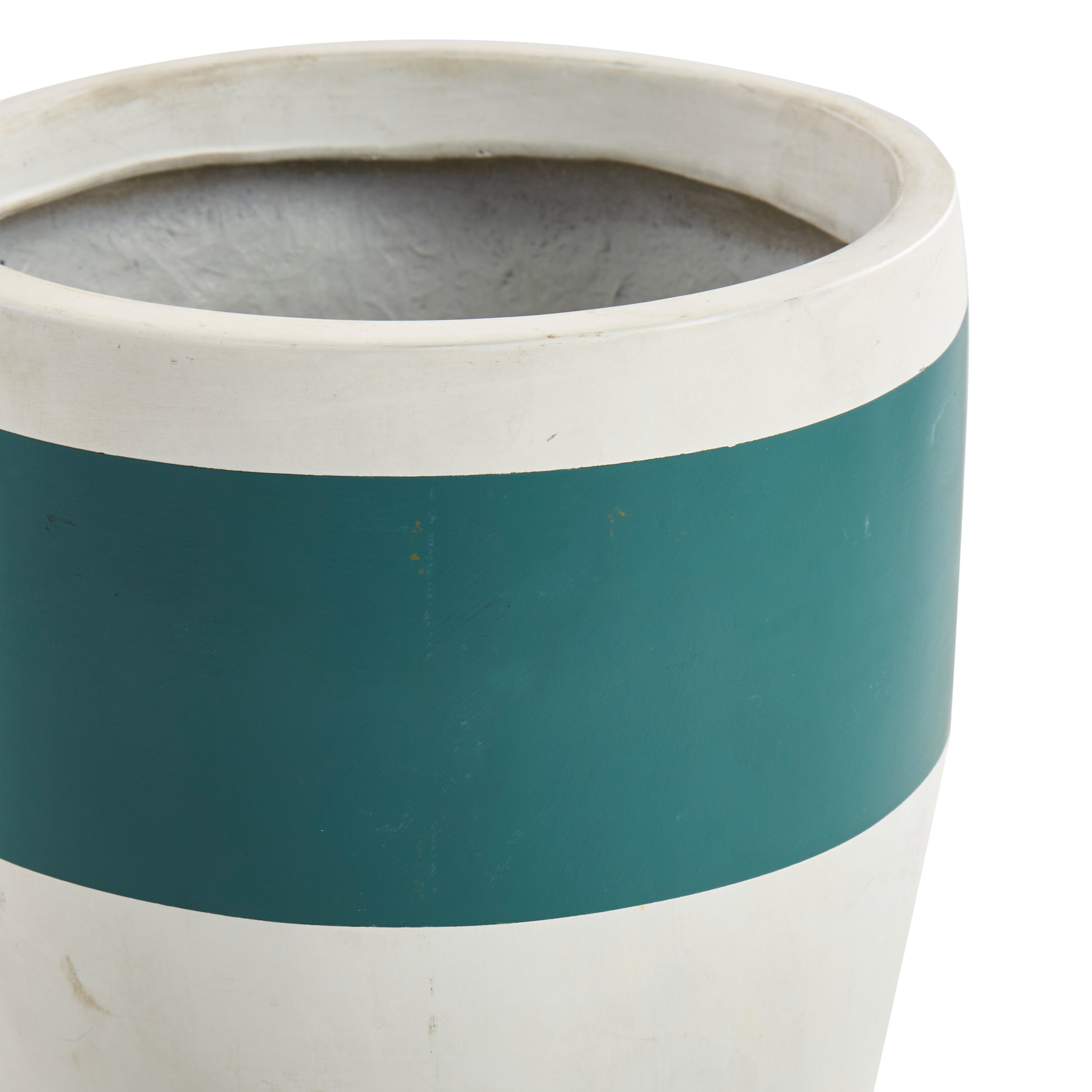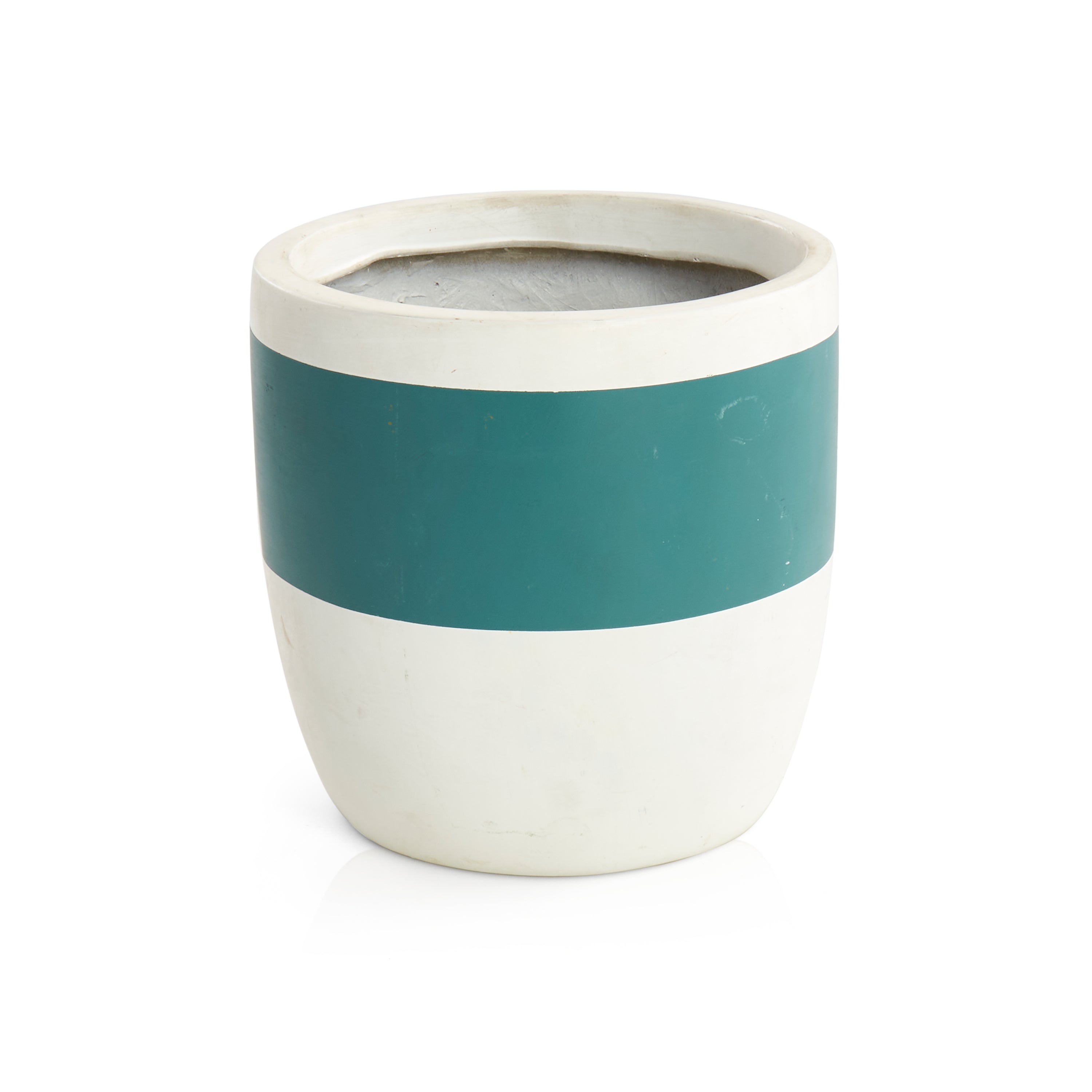 Details: White planter with teal striped detail. Dimensions: 7.5" H X 7.5" D