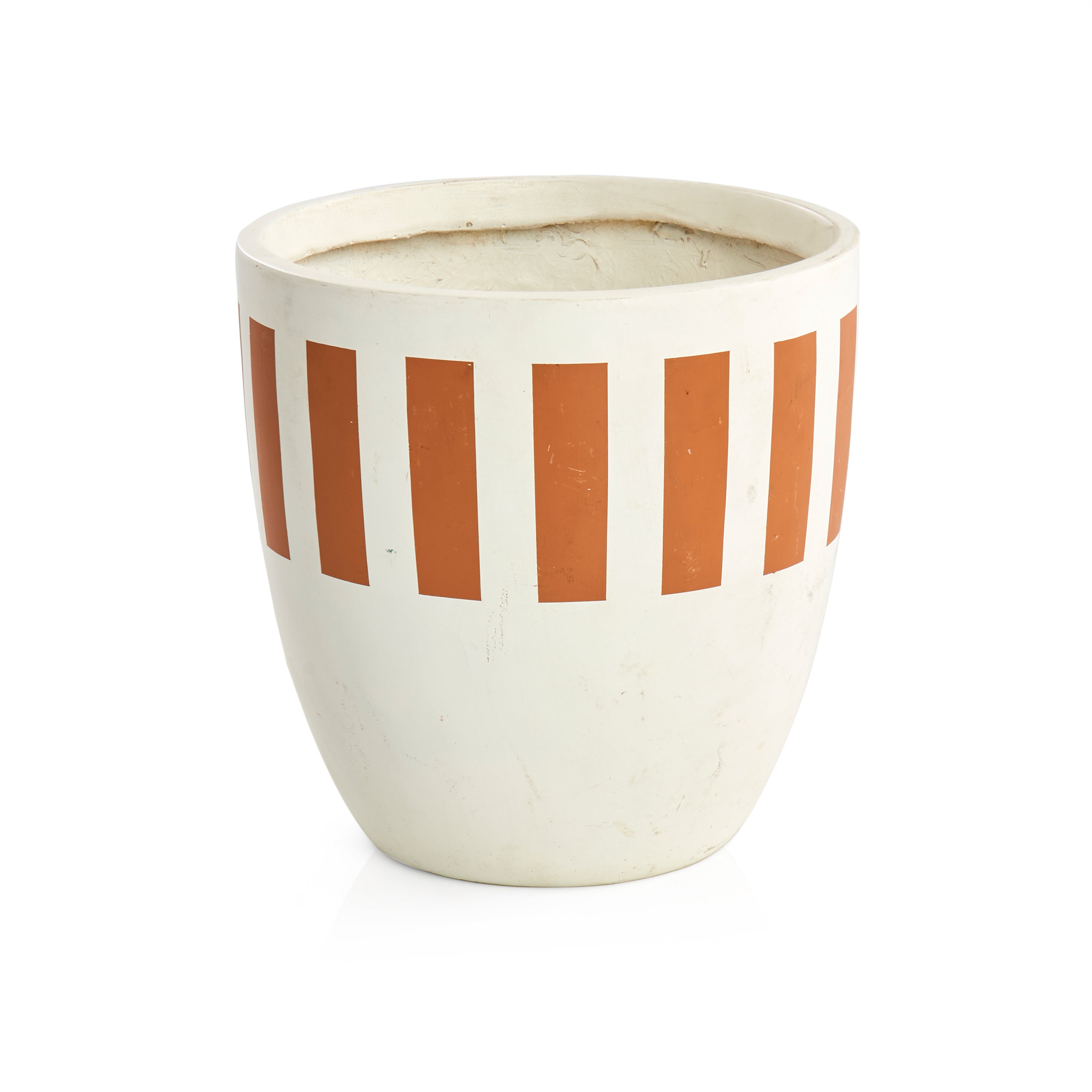 Details: White planter with terra-cotta striped detail. Dimensions: 11"H X 10.5" D