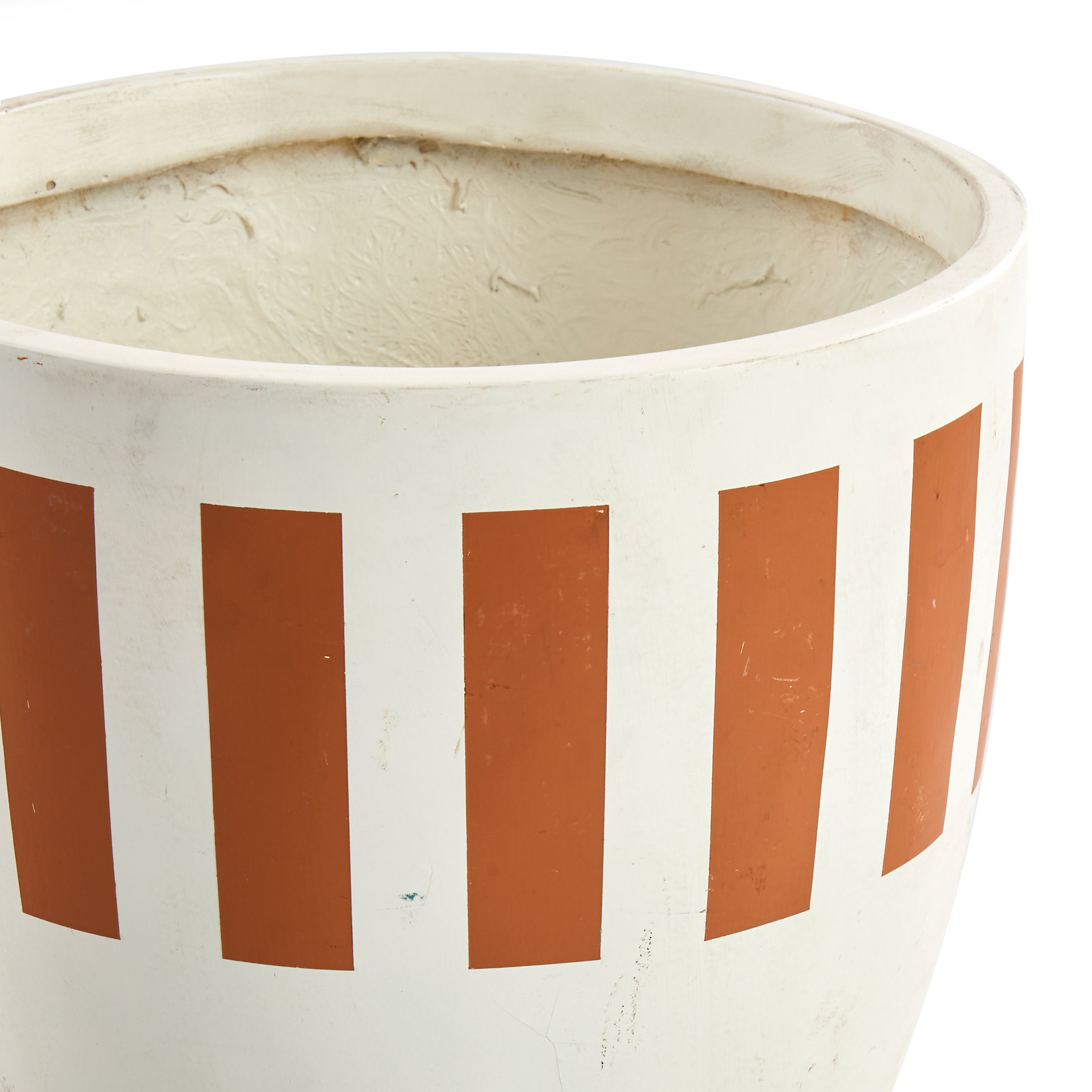 Details: White planter with terra-cotta and peach striped detail. Dimensions: 13"H X 13.5" D