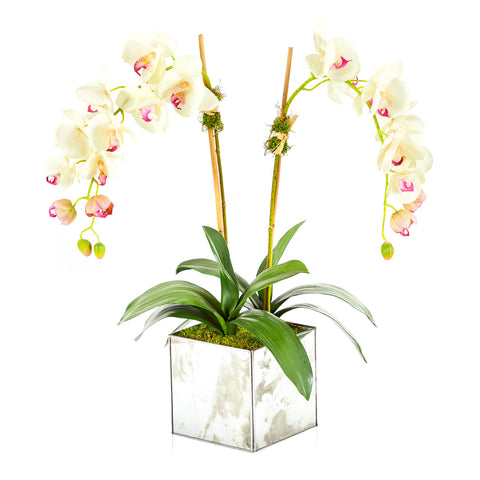 Details: Faux moth orchids in contemporary mirrored planter Dimensions: 23" H x 25" W x 14" D Quantity: 3