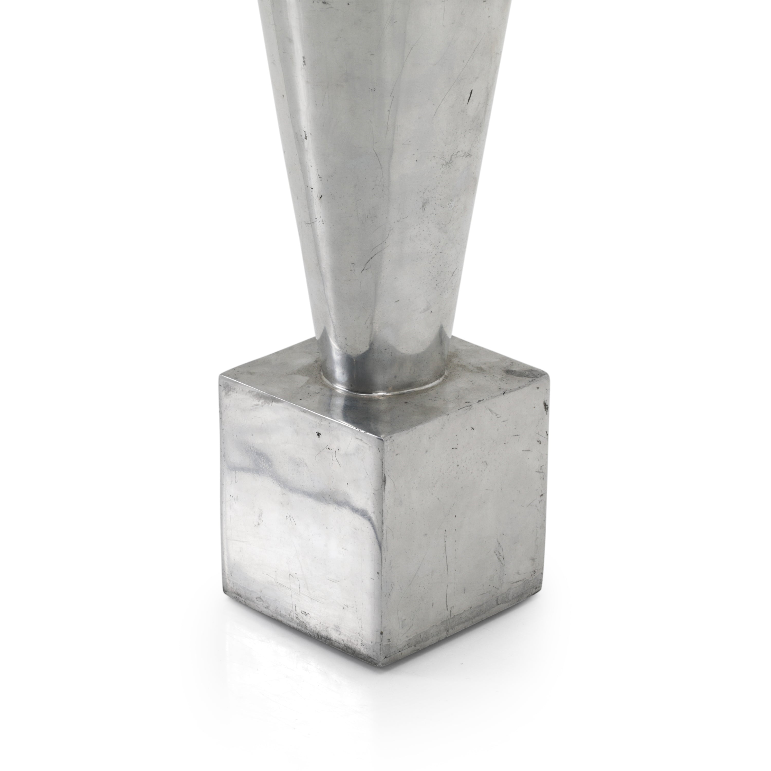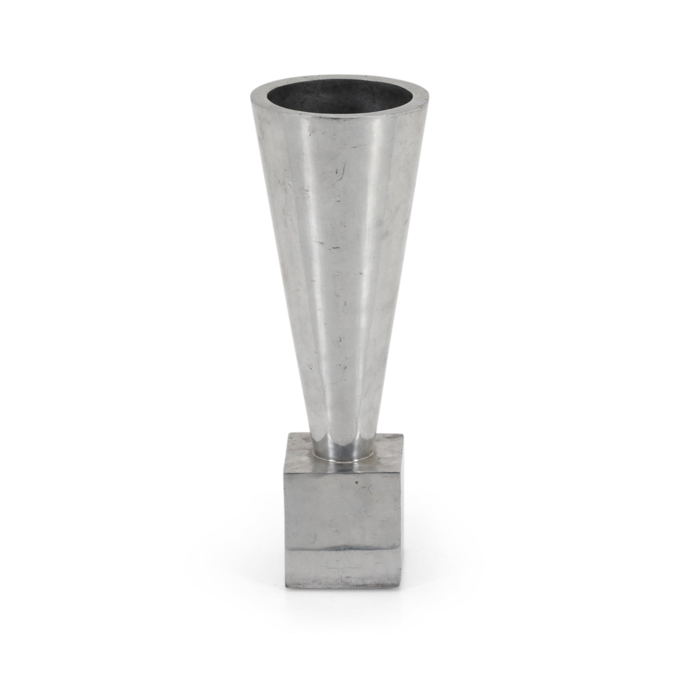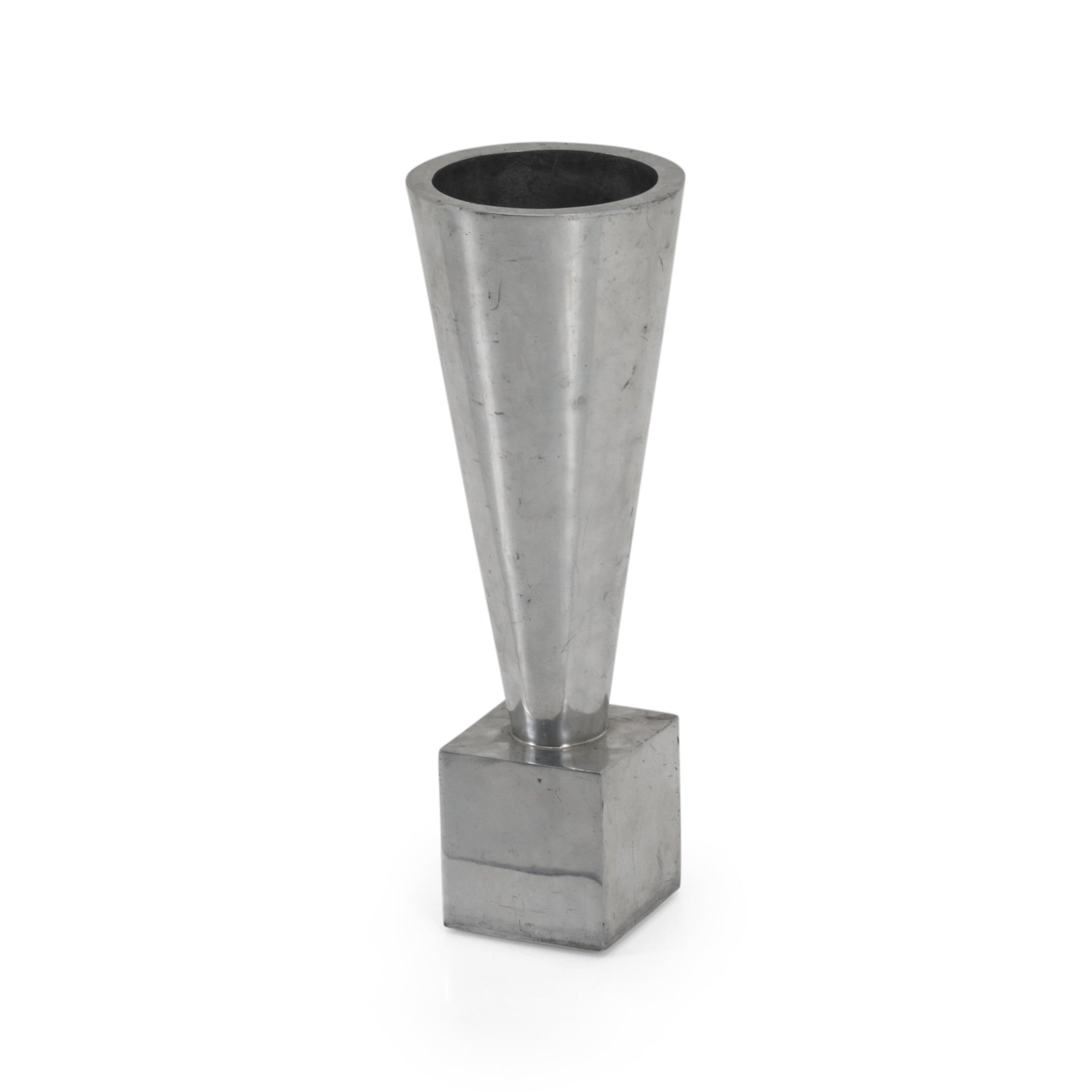 Details: Short silver cone-shaped planter with cube base Dimensions: 14" H x 6" W Quantity: 2