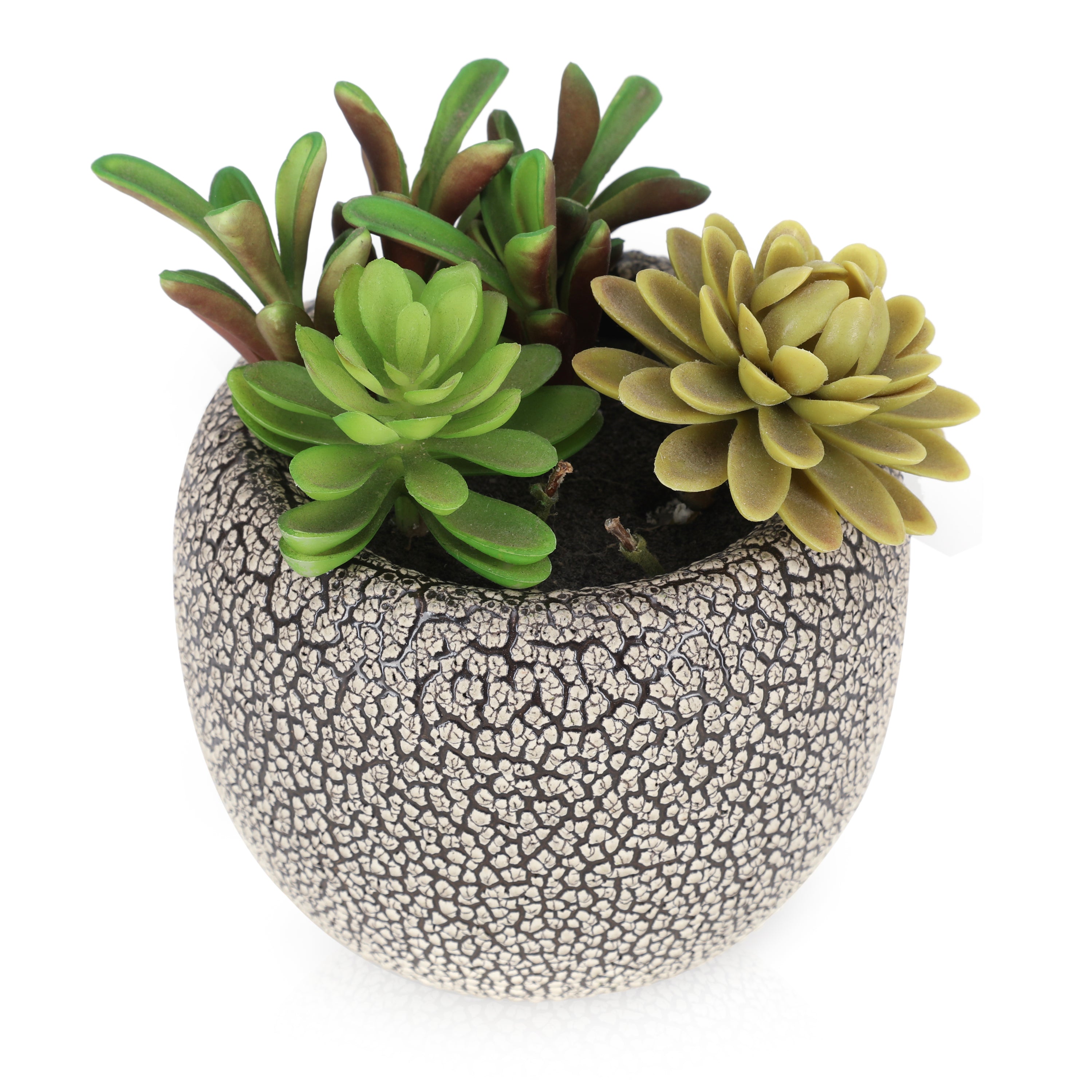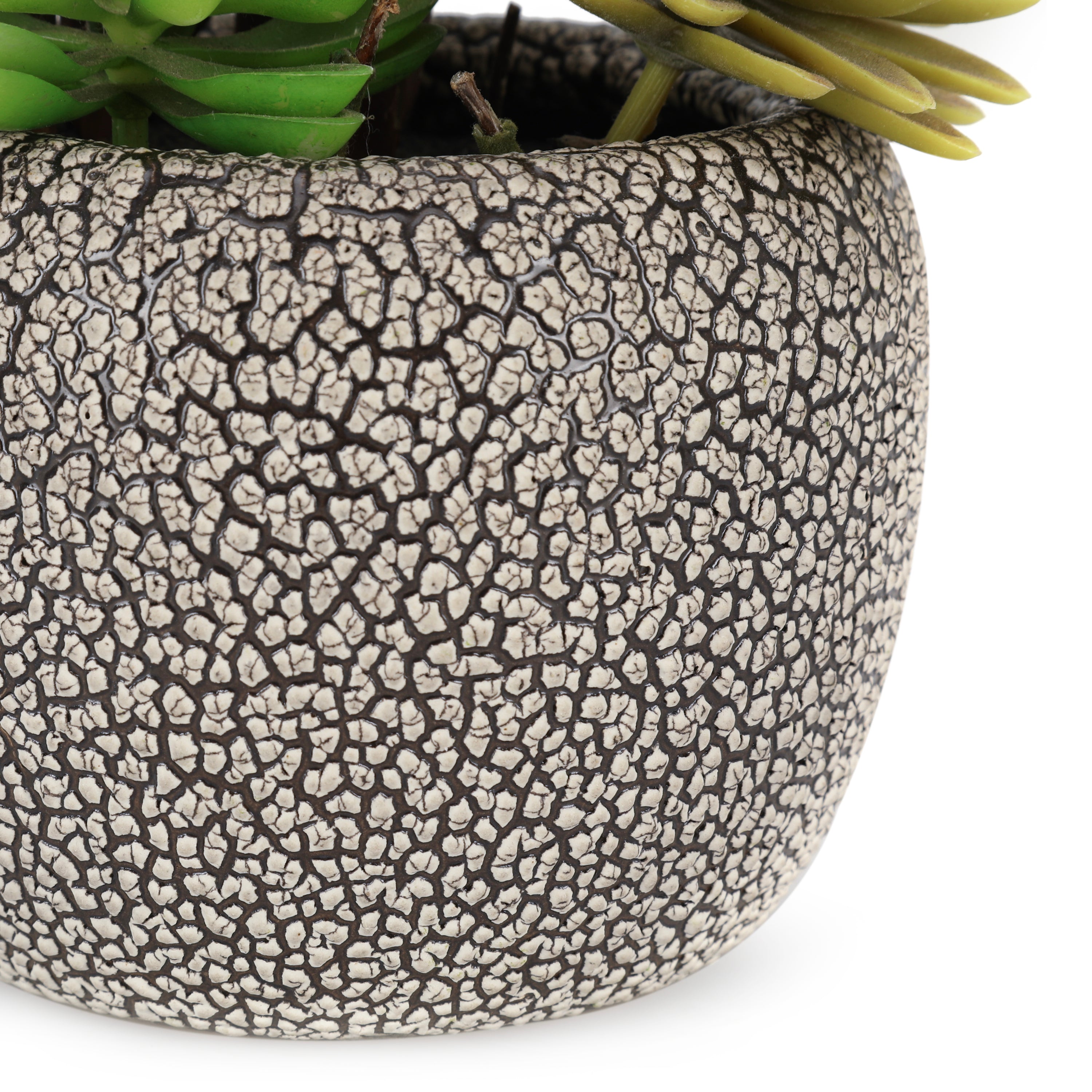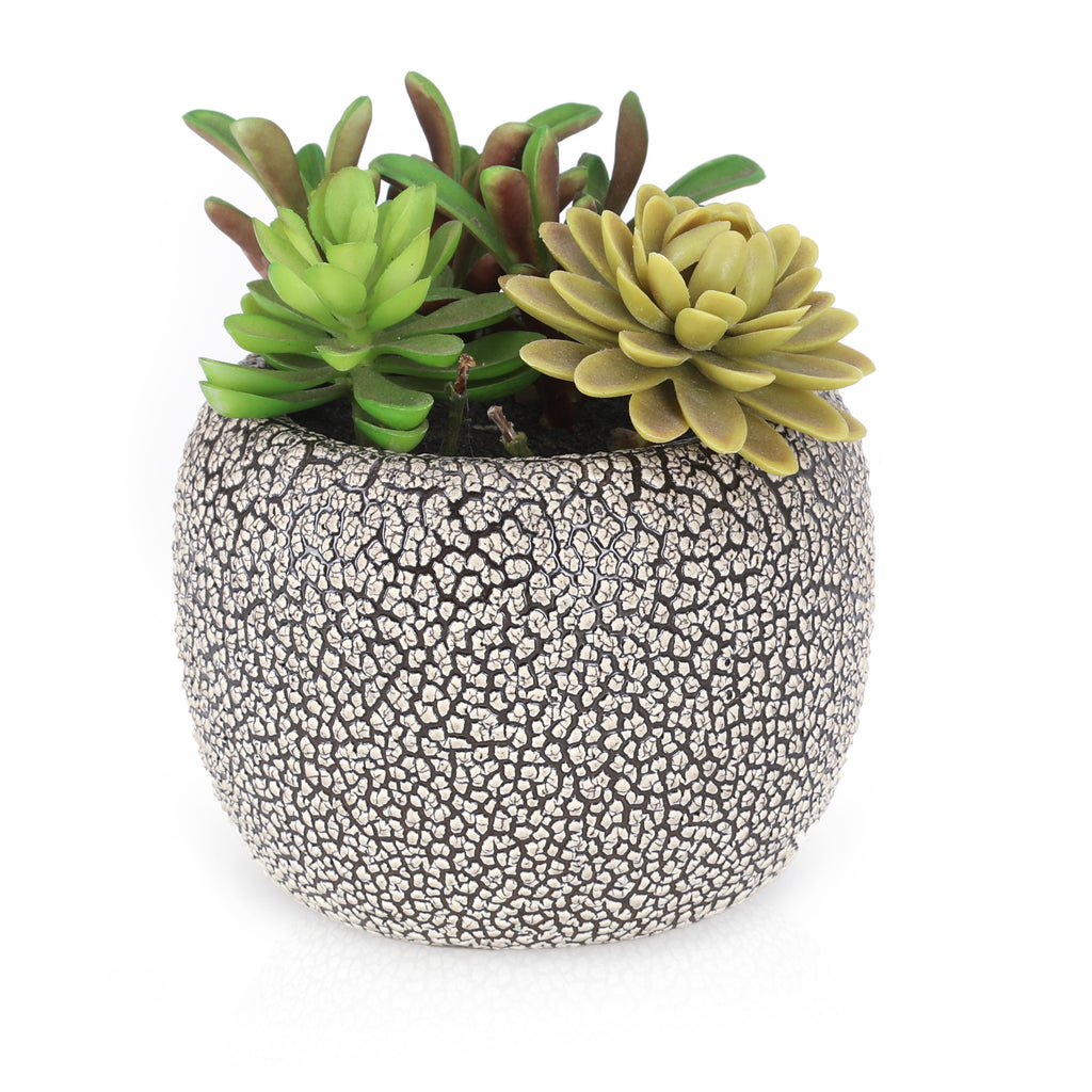 Details: Faux succulents in a small textured black and white planter. Dimensions: 7" H x 6" D