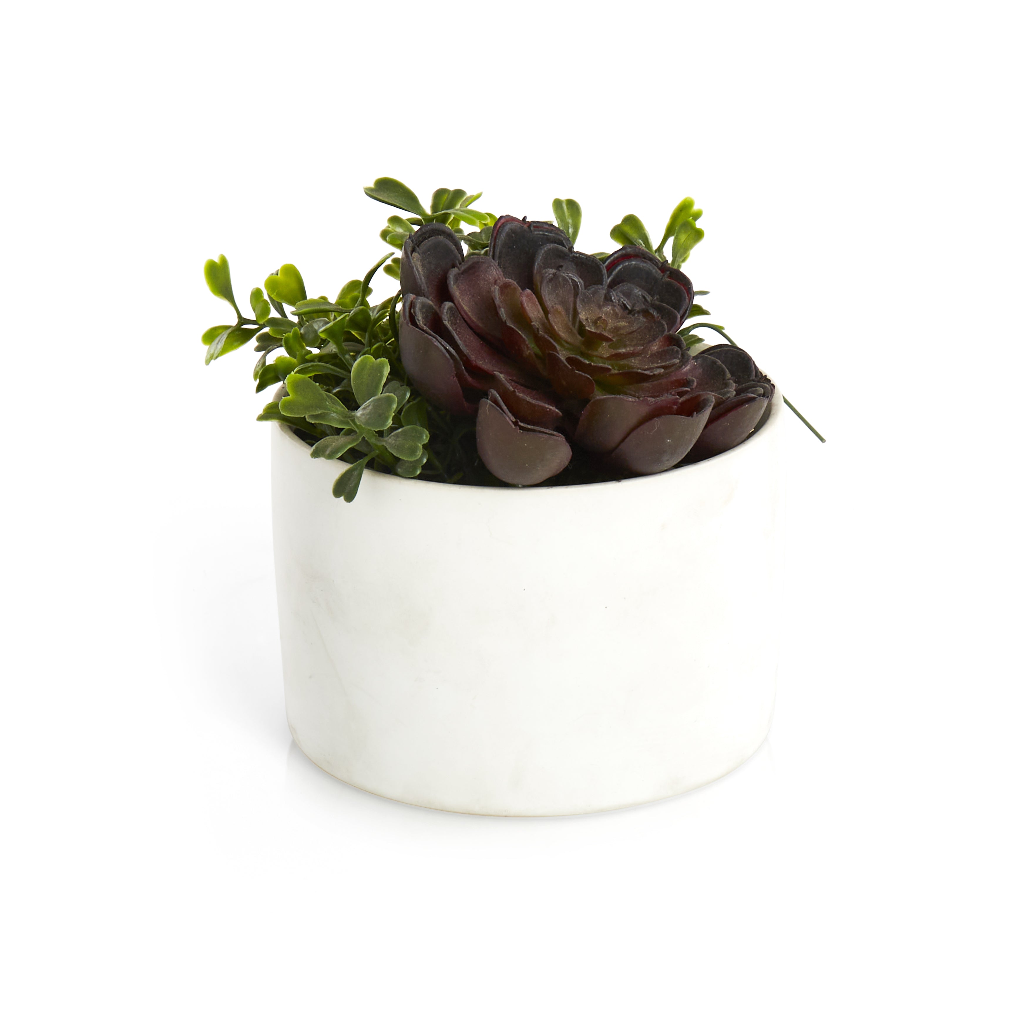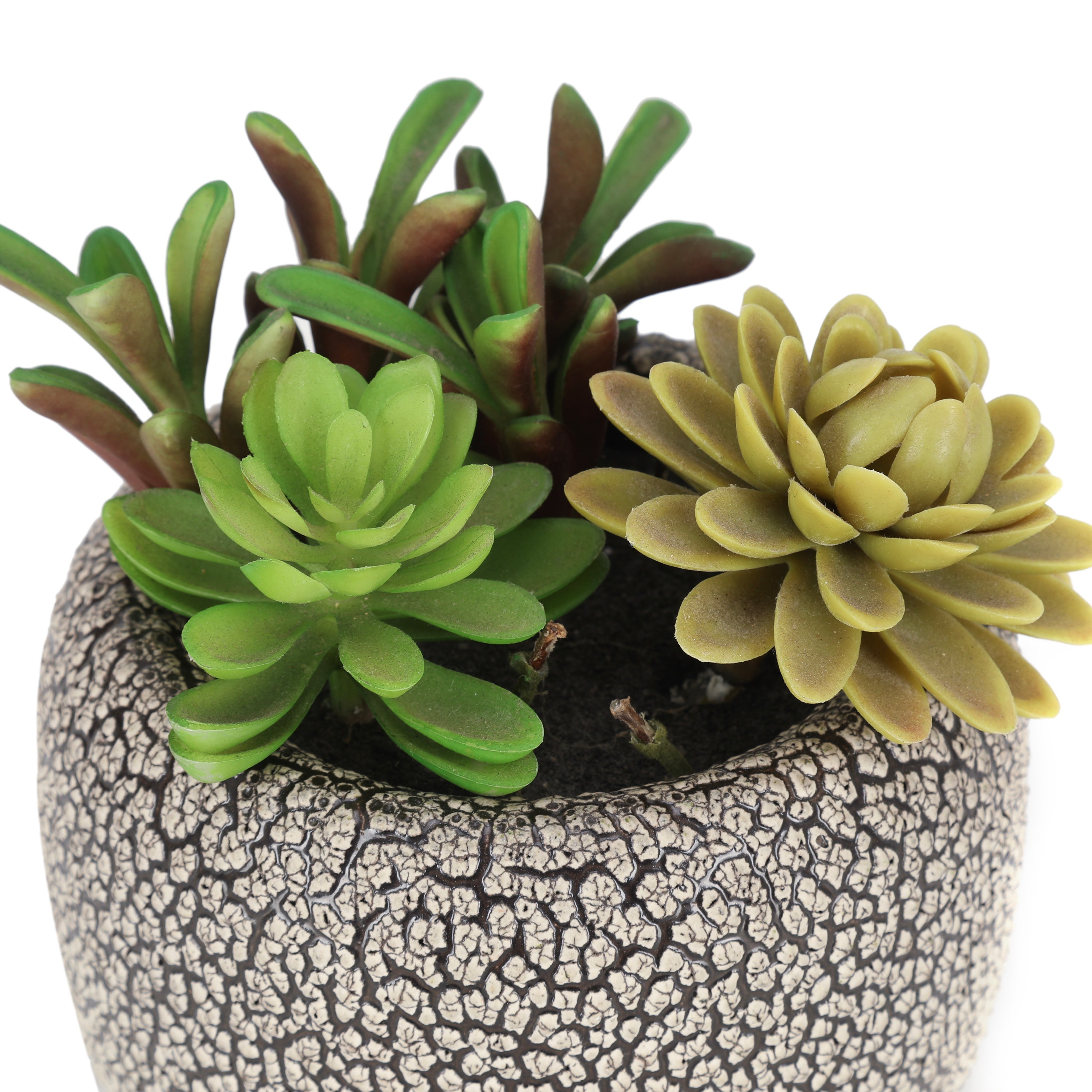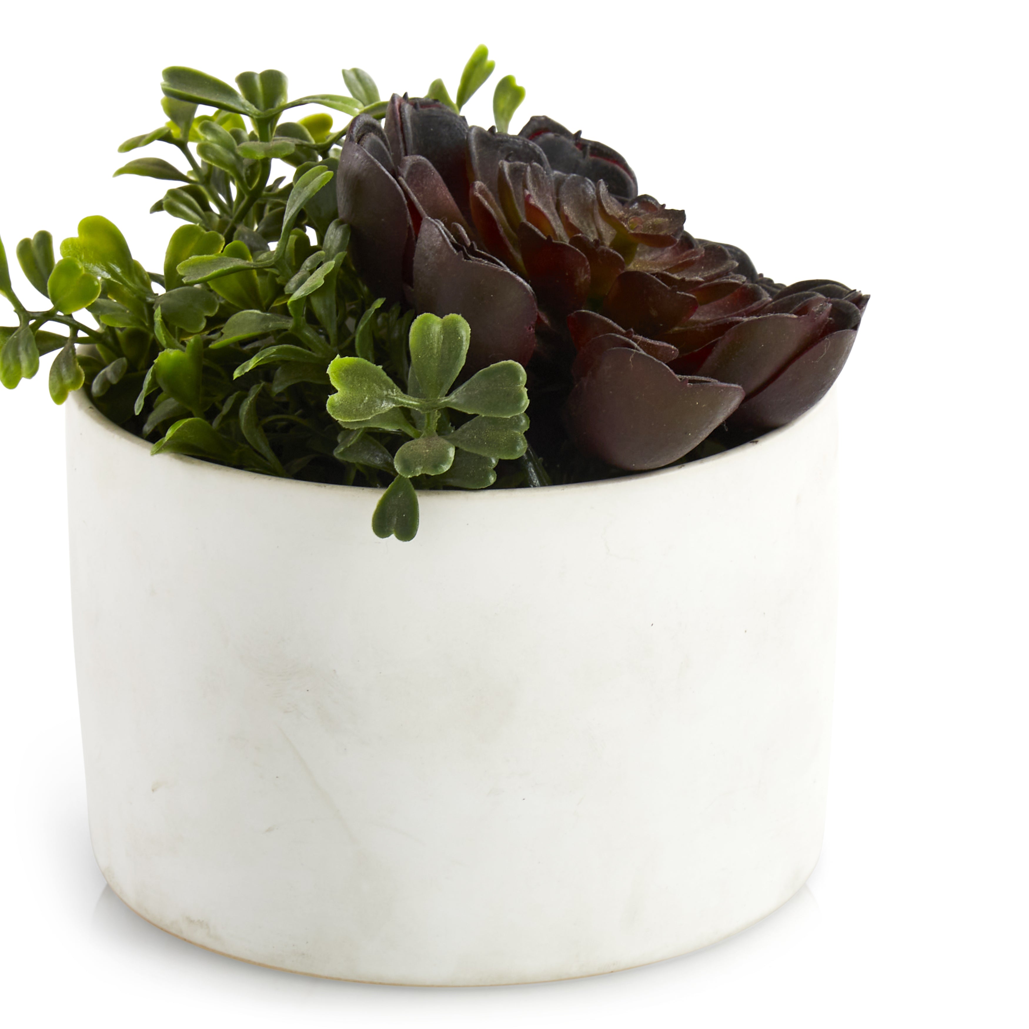 Details: Faux succulents in a small textured black and white planter. Dimensions: 7" H x 6" D