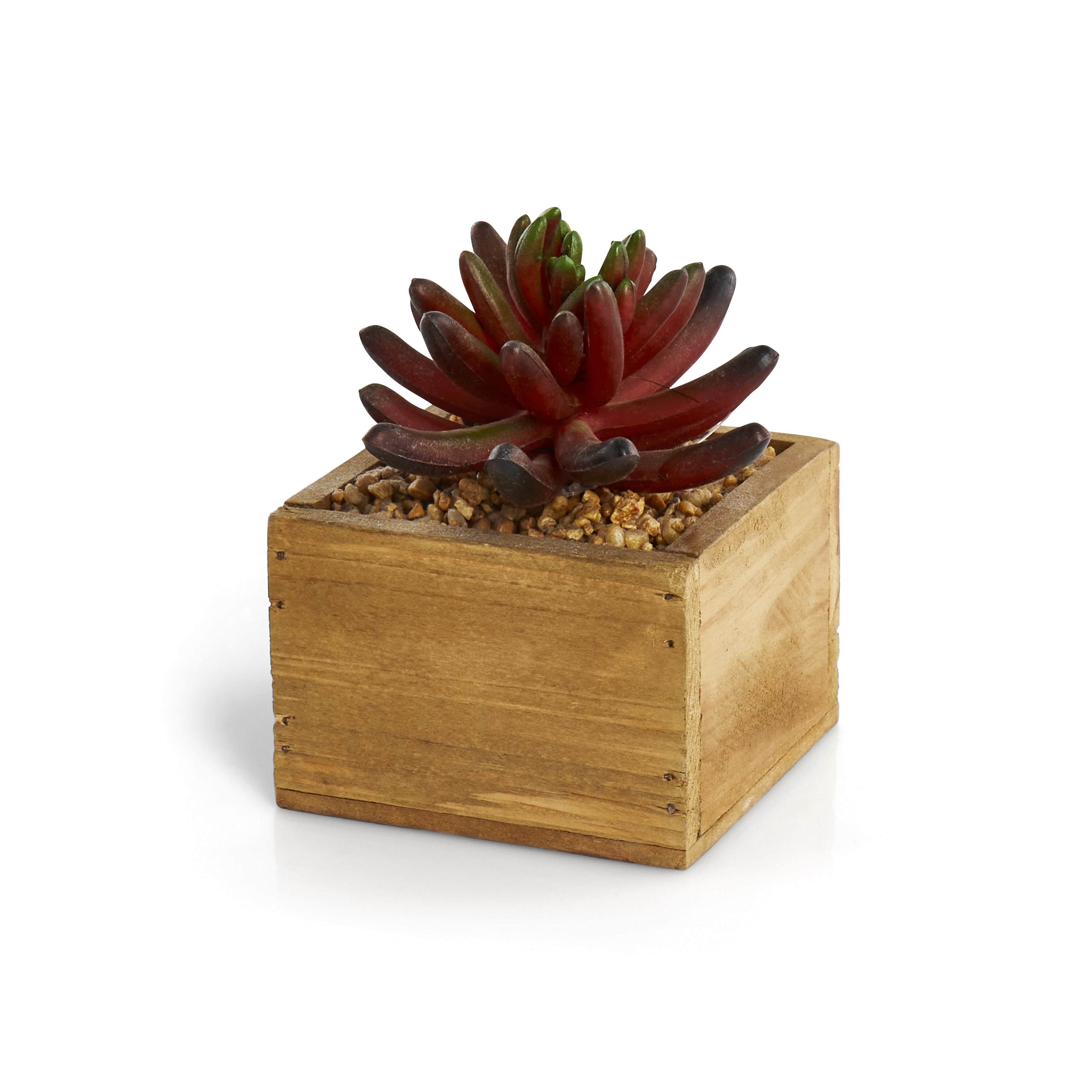 Details: Light brown wood plant holder with red and green succulent. Dimensions: 5" H x 4" W x 4" D