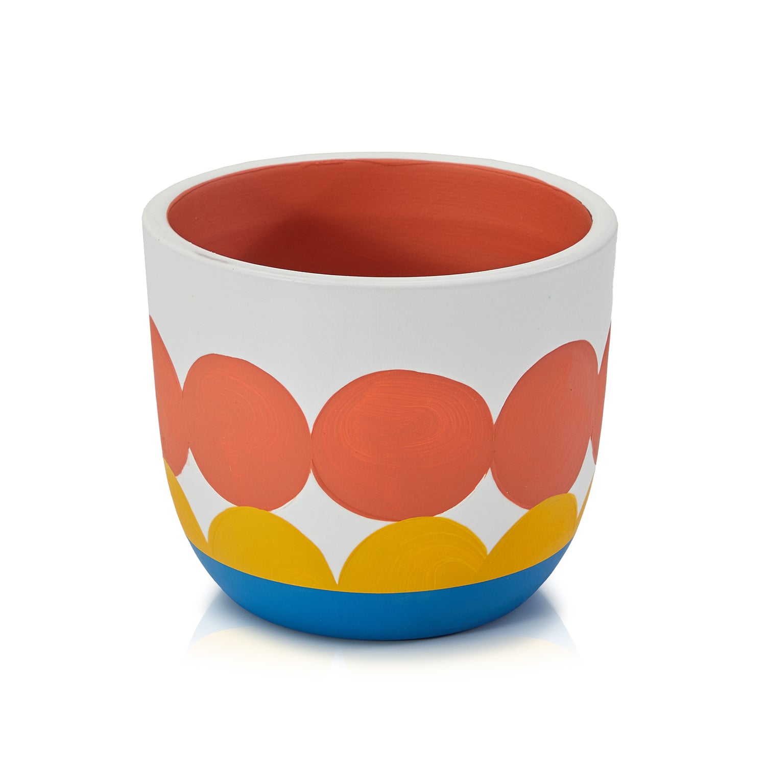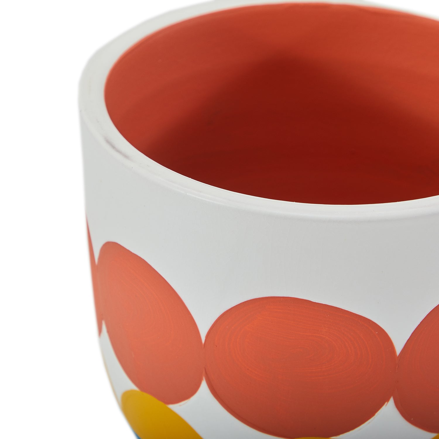 Details: Ceramic planter with orange and yellow circles, orange interior, and blue base Dimensions: 5.5" H x 6.5" W x 6.5" D